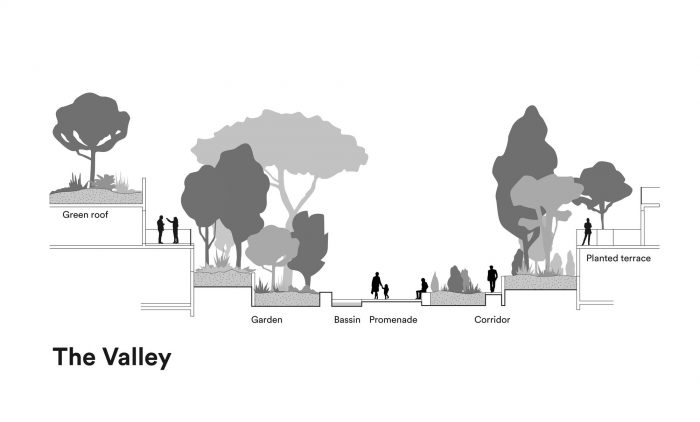 Castelnau-le-Lez is a town located near Montpellier in the South of France which enjoys a very mild Mediterranean climate. The new Prado Concorde development on the edge of the Lez river and at the entry to the town combines collective housing with school facilities and shops in a vast urban island surrounding a garden shaped like a valley.