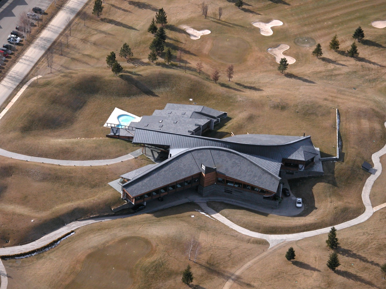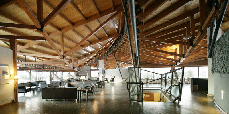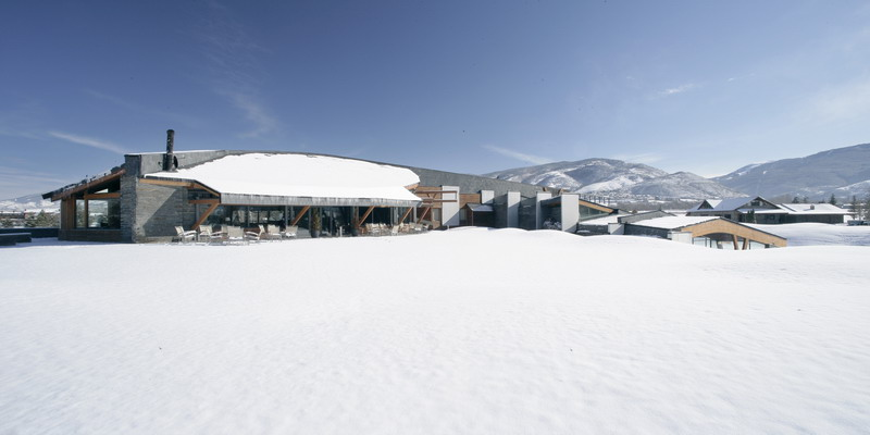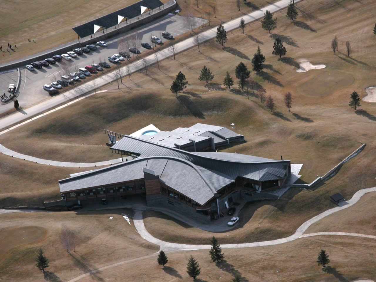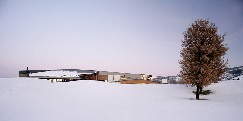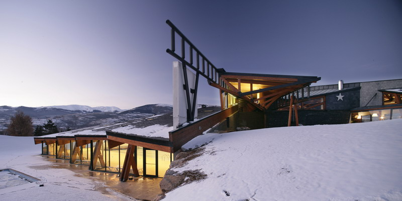 Pyrenees Golf Club and Social Centre designed by MiAS Arquitectes, The building is well integrated into the landscape. Thanks to construction techniques, special materials, camouflage, and the typography, the building seems to belong to the site.