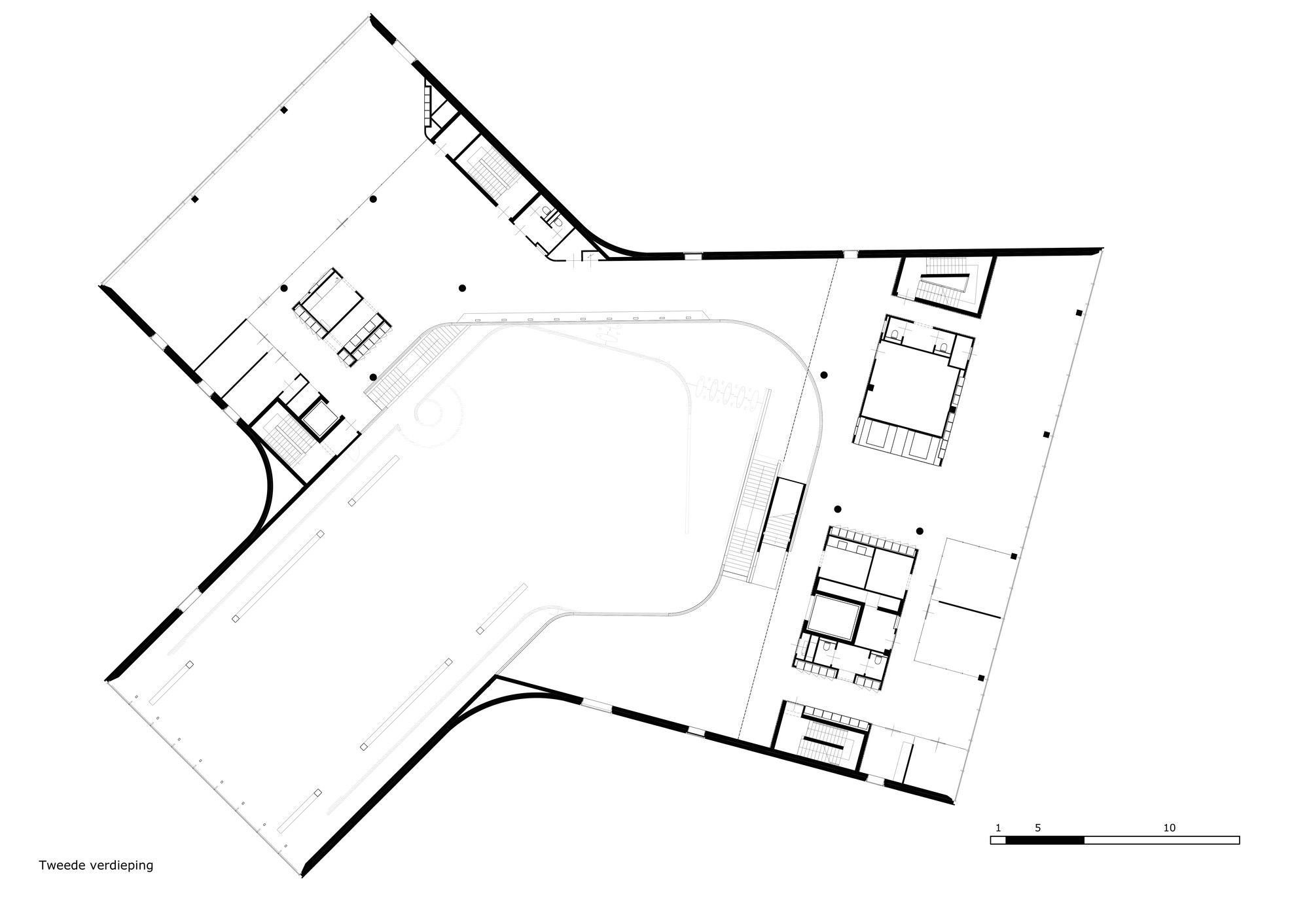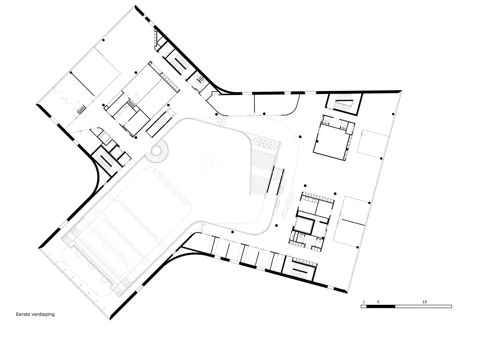 A 60-metre-long custom-designed, semi-transparent curtain surrounds the auditorium, creating different atmospheres, from open to intimate, depending on its position. The building obtained a BREEAM Very Good certification and is connected to the Green Network that reuses residual heat generated by industry from the nearby Chemelot industrial park.