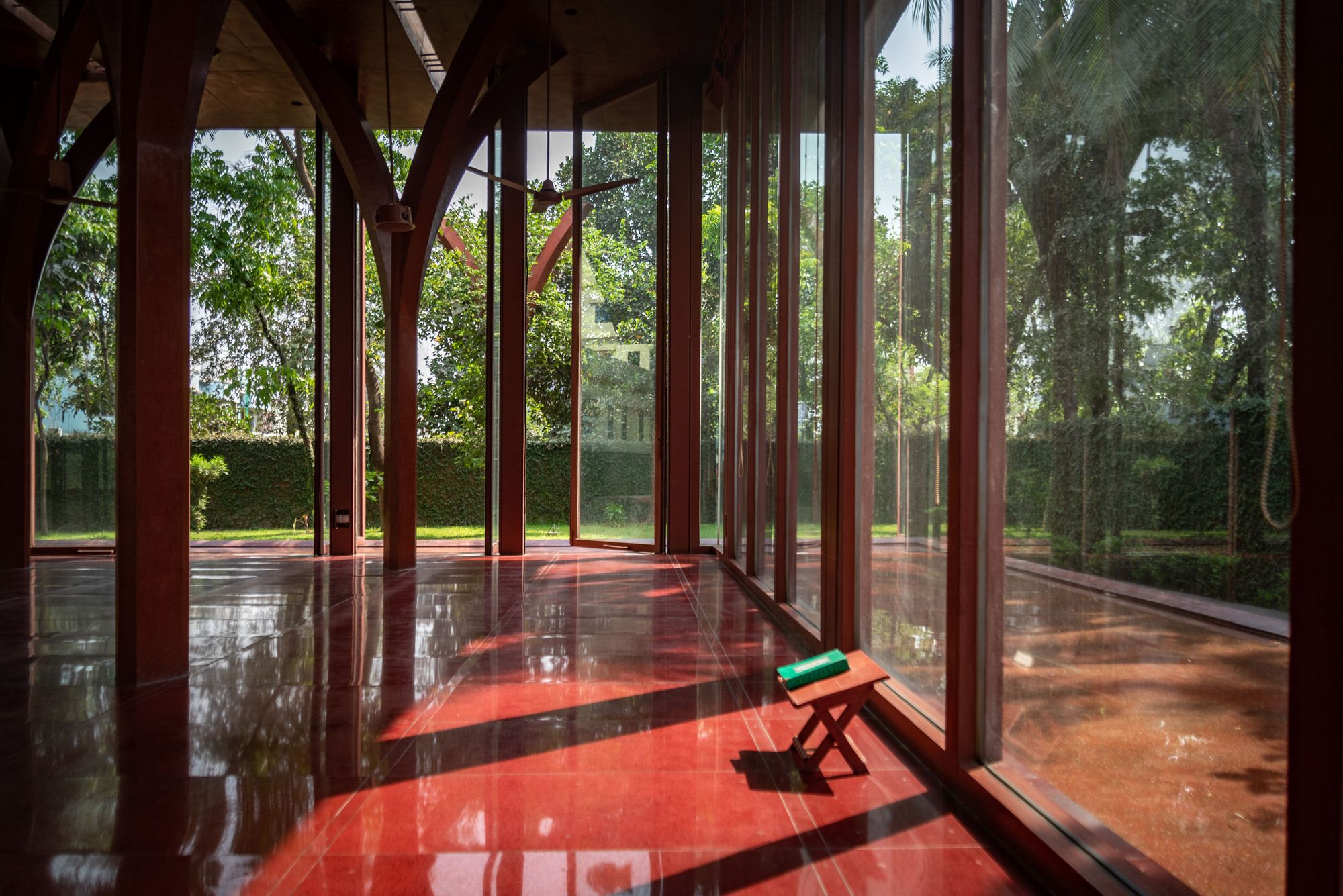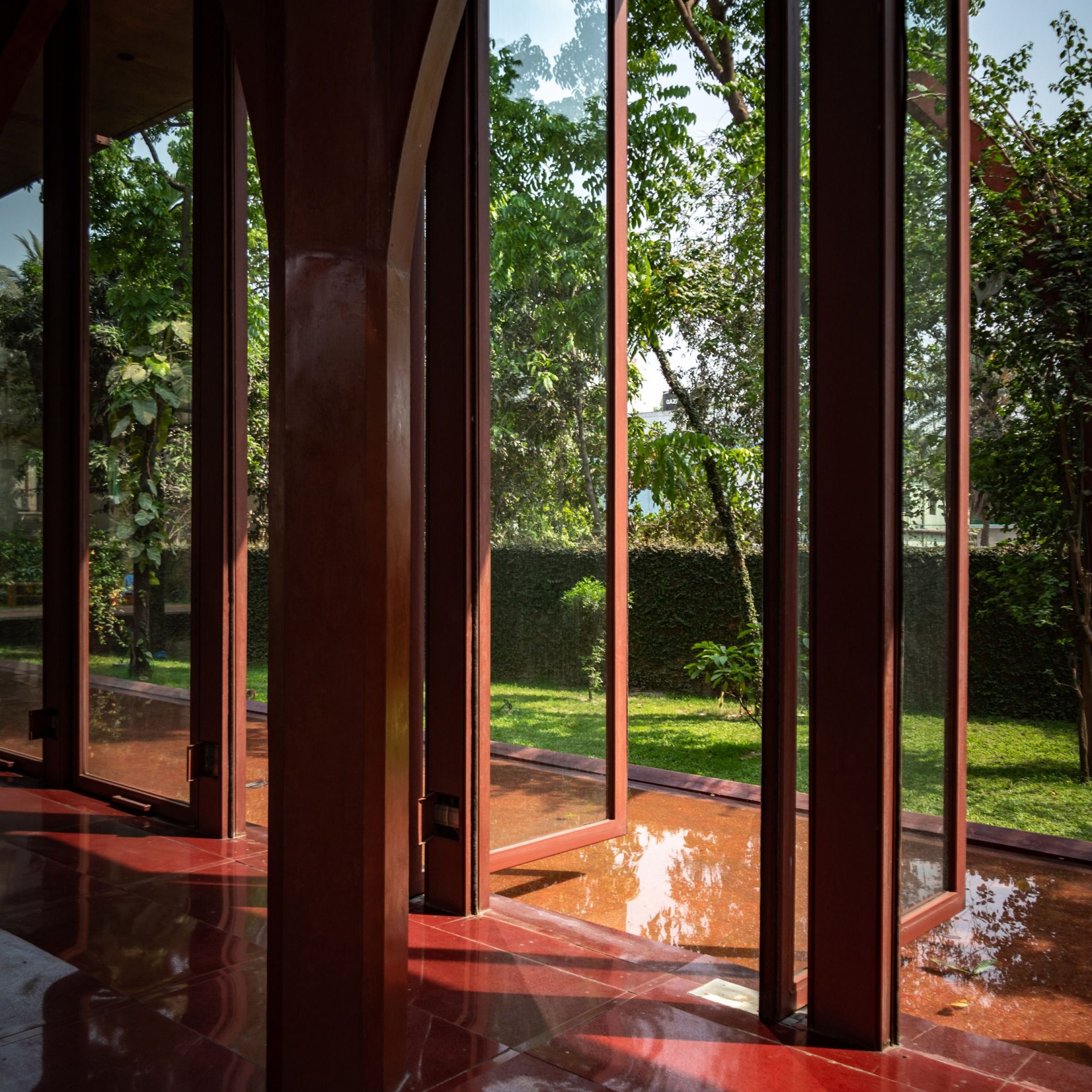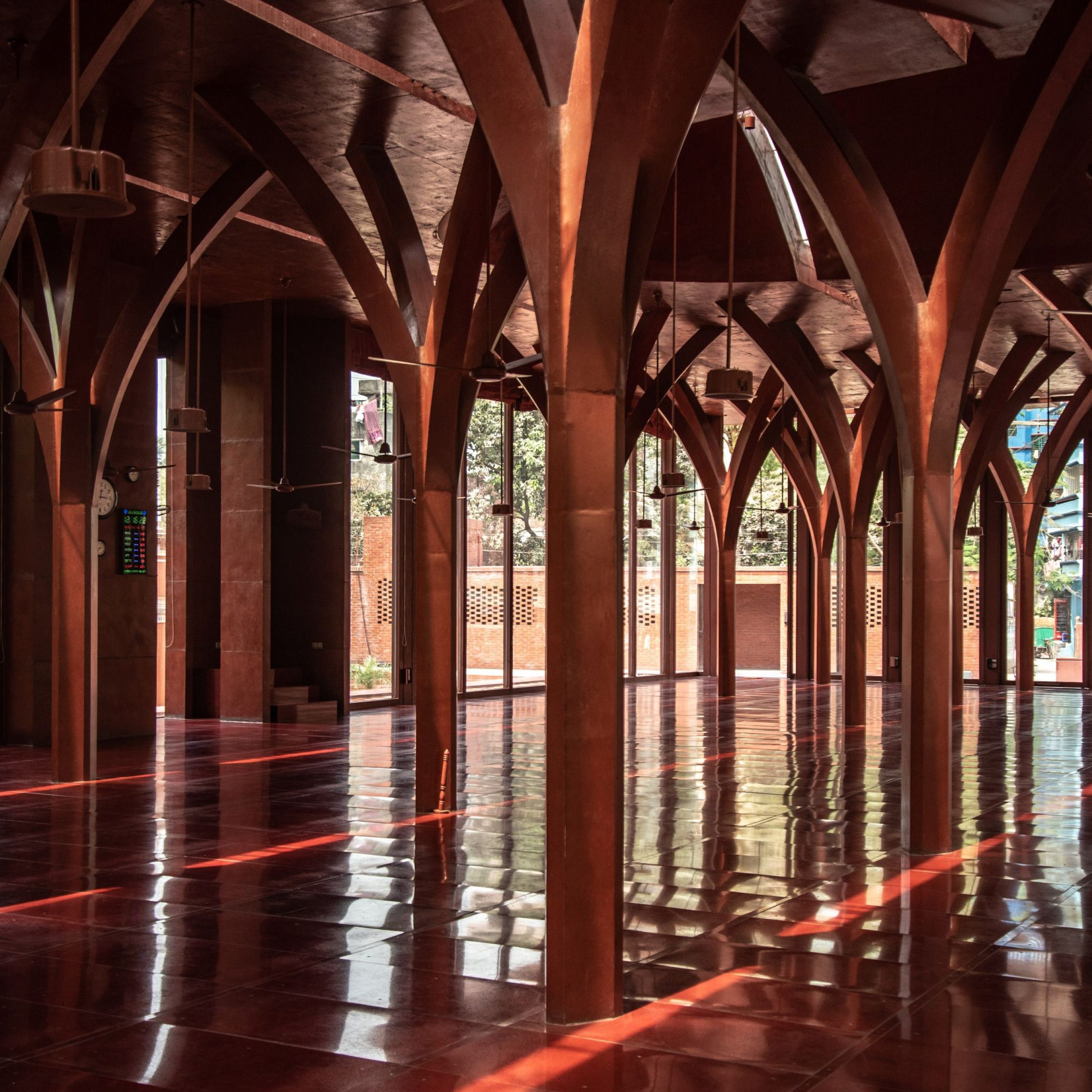 Inspired by the simplicity of the first mosque in Islam, the mosque in Madina, the Red Mosque takes on a true pavilion form, designed by Kashef Chowdhury – URBANA. An array of large six-meter tall ‘windows’ let in a welcome breeze, obviating the need for air-conditioning in a climate where summers can get very hot. A shallow body of water encircles the pavilion, separating it from the adjacent garden and plaza while engaging micro-climatic cooling.