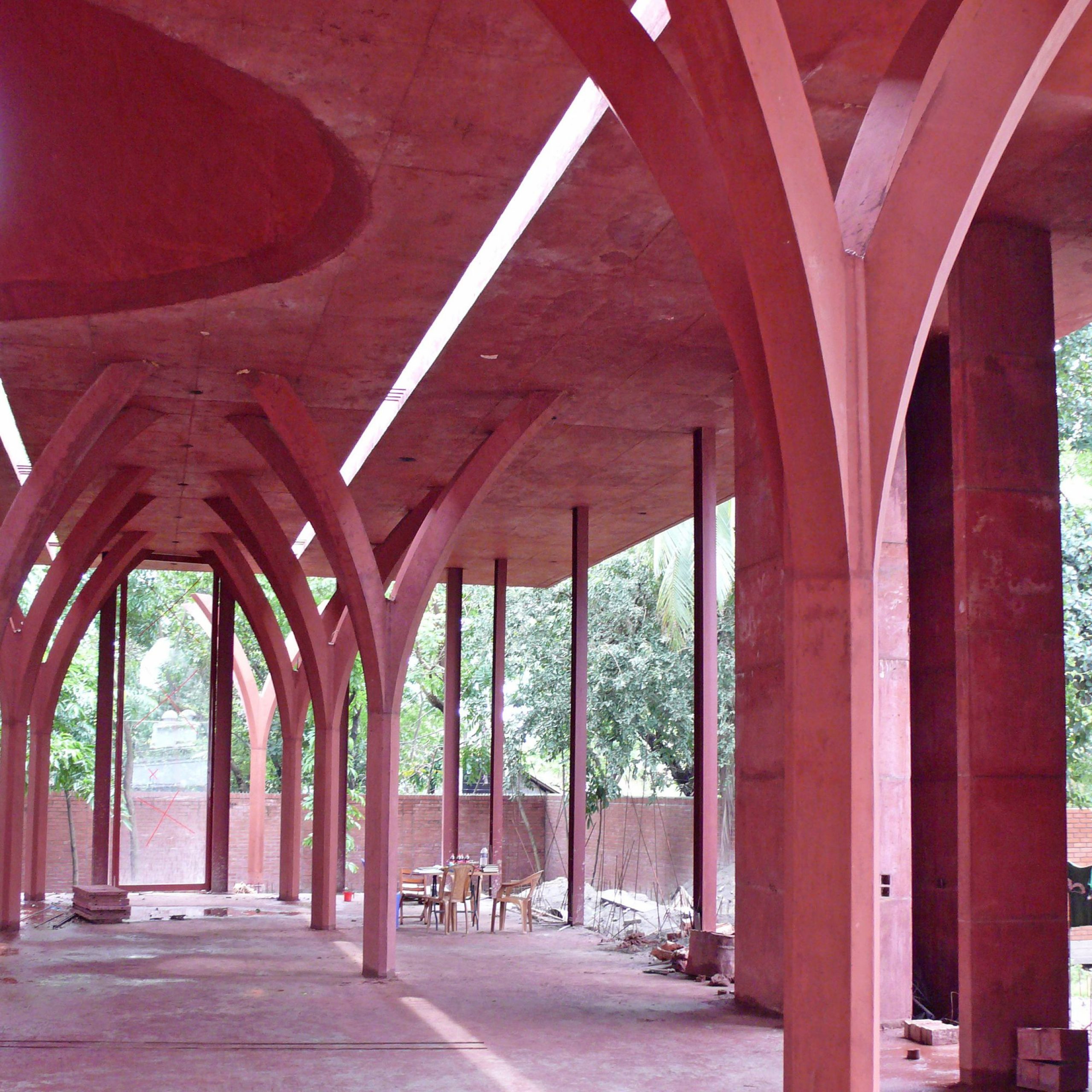 In an area where there are high levels of pollution, noise, and visual chaos, the mosque and its environs are conceived as a sanctuary of peace and simplicity. Palette of materials is limited: Exposed red concrete for the entire structure and local red terrazzo for floors. The open spaces are articulated unambiguously, leaving generous spaces for the gathering of friends or simply for the mind to rest.