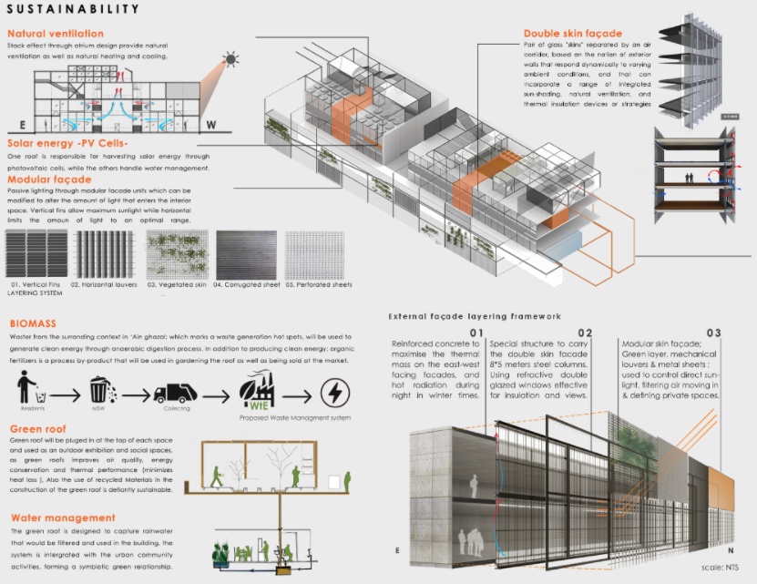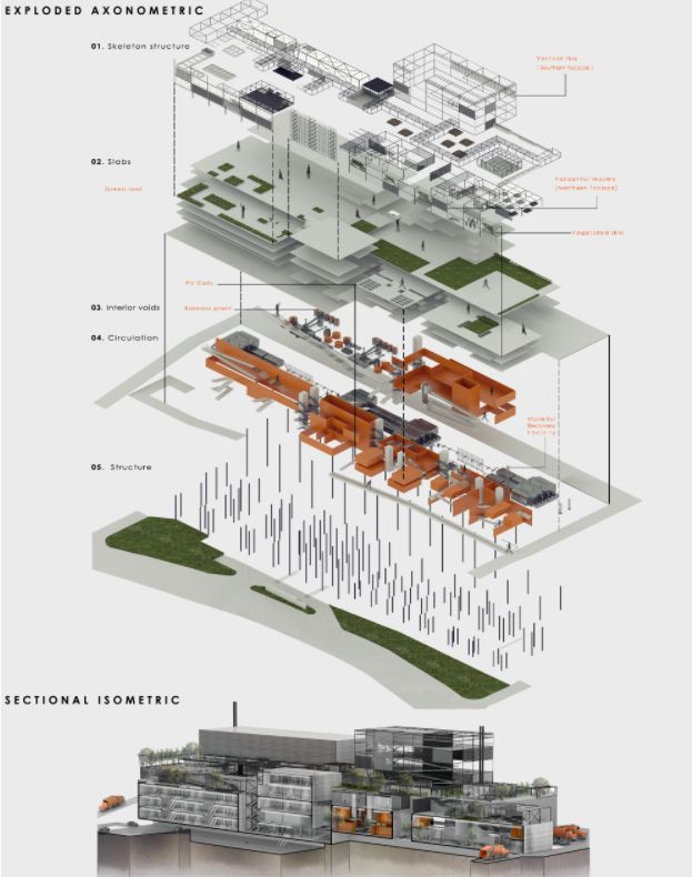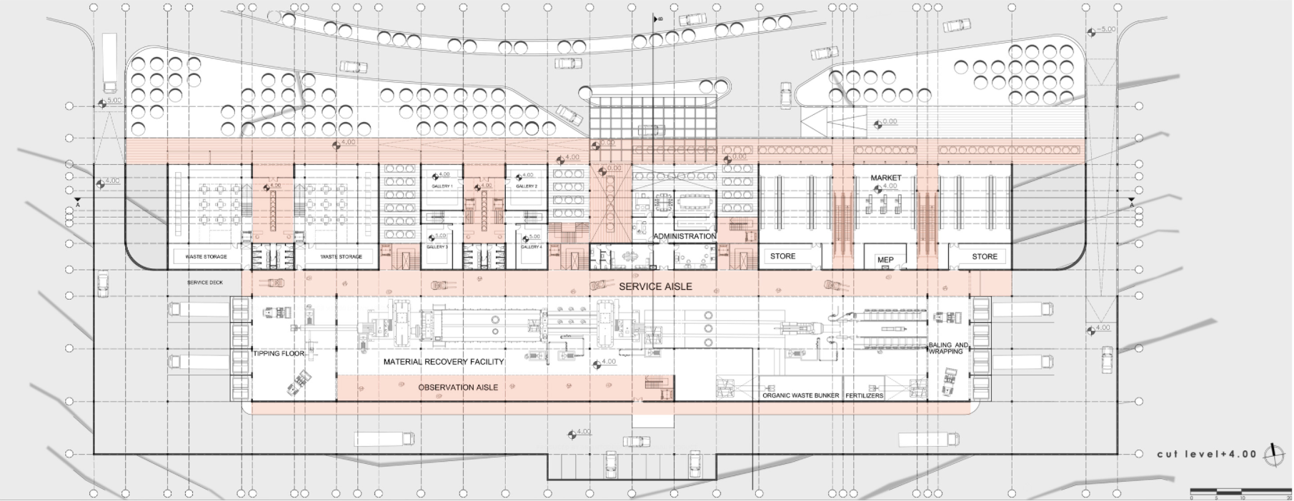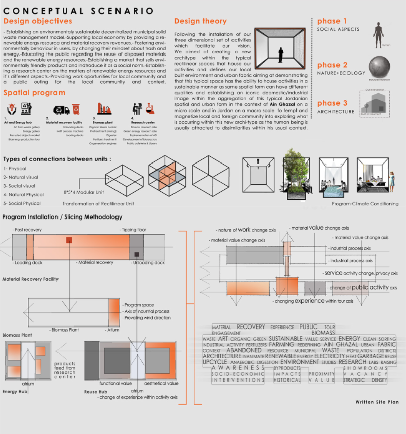 Design objectives was firstly to establish an environmentally sustainable decentralized municipal solid waste management model, to support local economy by providing a renewable energy resource and material recovery revenues, to foster environmentally behavior in users, by changing their mindset about trash and energy, to educate the public regarding the reuse of disposed materials and the renewable energy resources, also to establish a market that sells environmentally friendly products and introduce it as a social norm and a research center on the matters of renewable energy resources and it’s different aspects, and finally providing work opportunities for local community and a public outing for the local community and context.