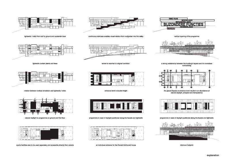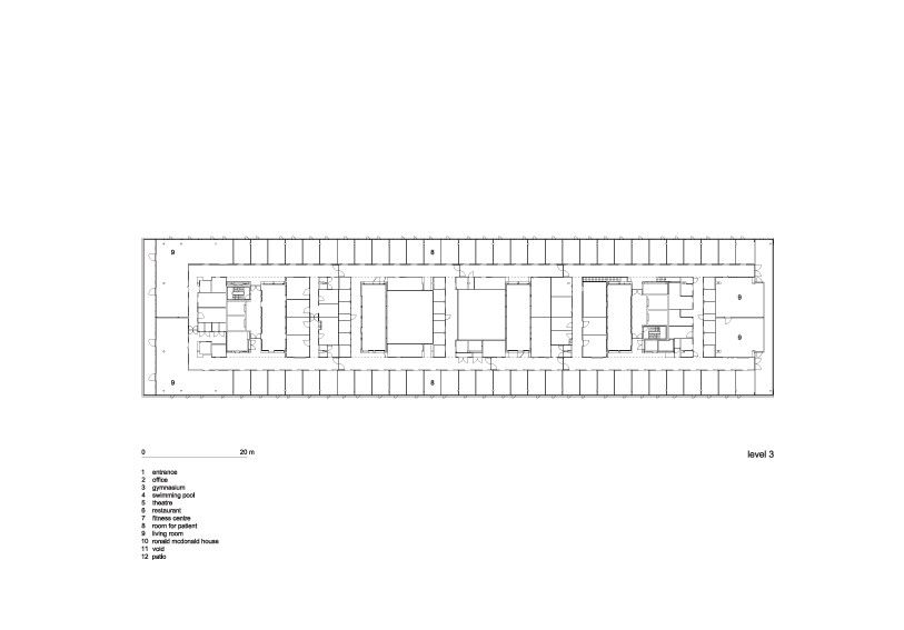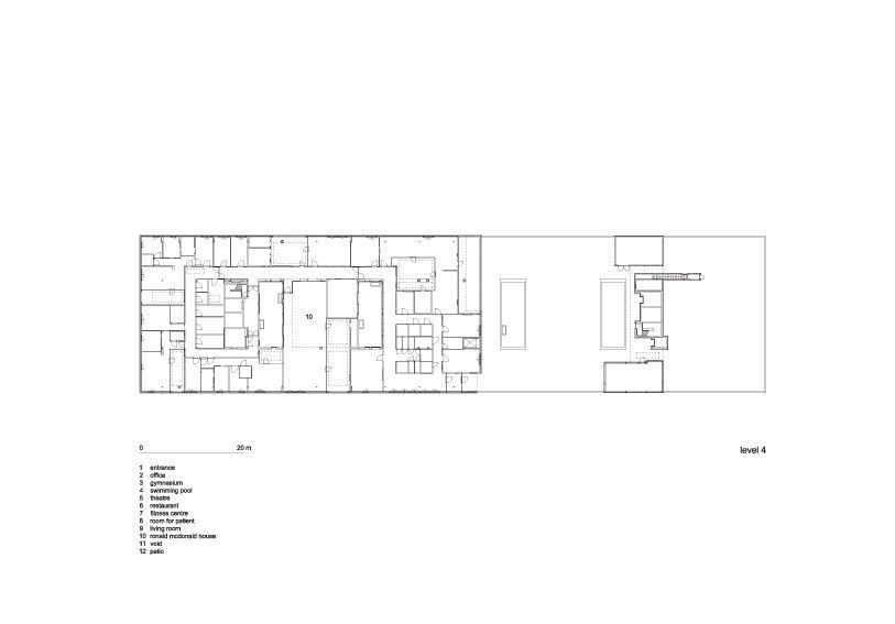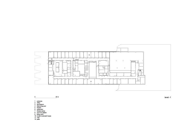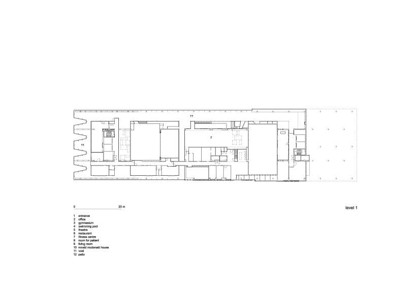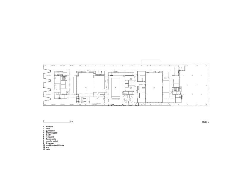 The arrangement of the programme is clear. Below are offices, above are the clinical area’s and on the roof a Ronald McDonald House with its own identity. The double-height ground floor at the entrance level facilitates the special elements of the programme such as a sports facility, fitness, swimming pool, restaurant and theatre. Not only patients but also family members and members of the local community (schools, theatre groups etc) use these facilities on a regular basis. As a result, both patient and building are placed at the centre of the community.