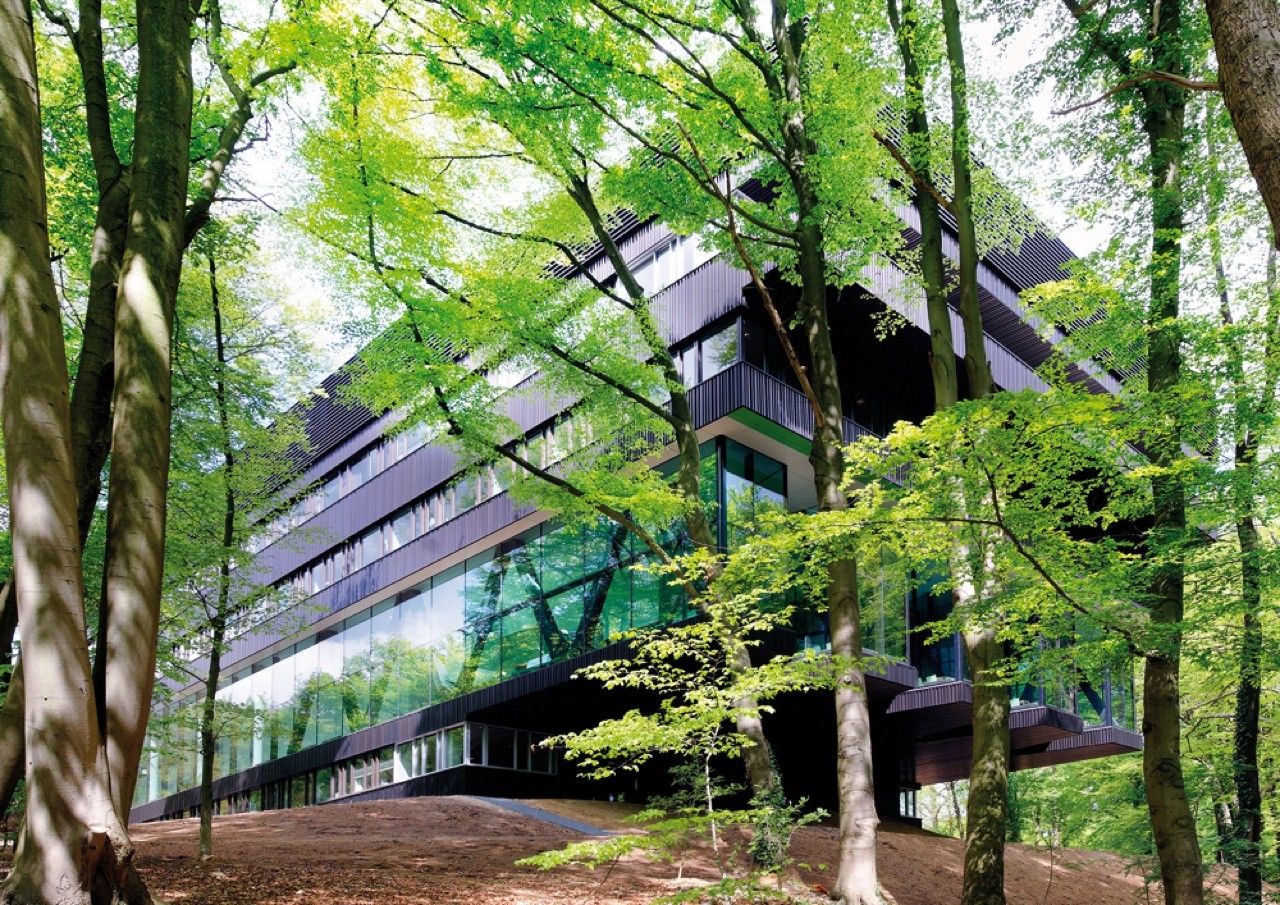 From a small footprint, the Rehabilitation Centre Groot Klimmendaal designed by Koen van Velsen gradually fans out towards the top and cantilevers out over the surrounding terrain. Despite its size, the brown-golden anodized aluminium facade allows the nearly 14,000 sqm building to blend in with its natural surroundings.