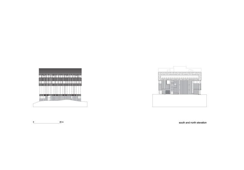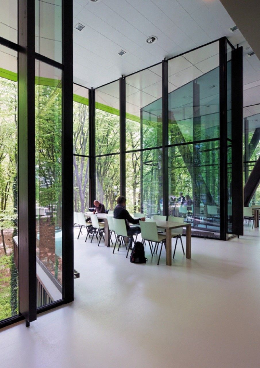 Full height glazing along the central space connecting the various different internal elements of the building ensures an almost seamless continuity between interior and exterior. The meandering facade in the restaurant results in a building in between trees and invites the forest inside the building. The surrounding nature has a strong visual and tangible presence everywhere in the building; it allows the user to revalidate whilst walking.
