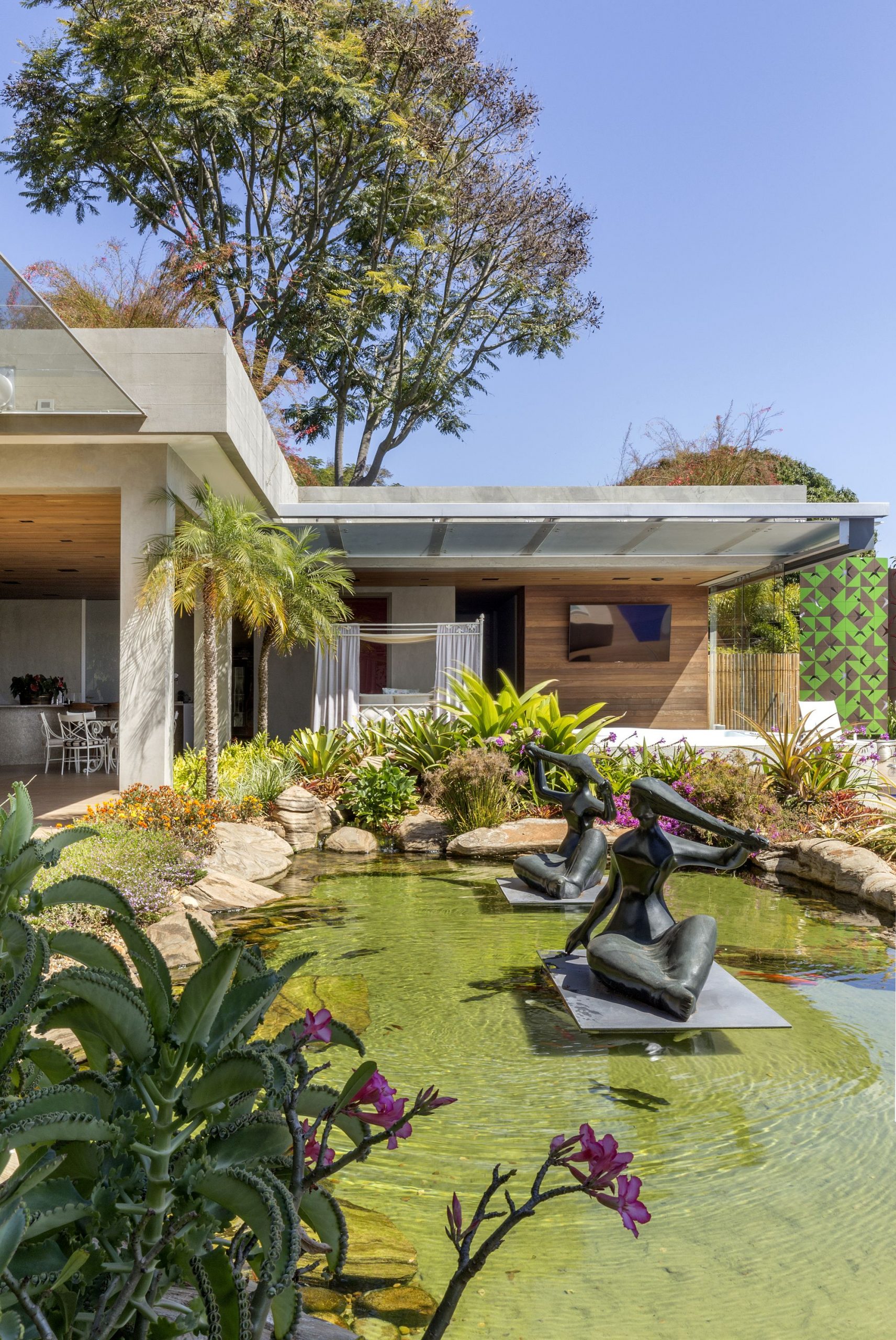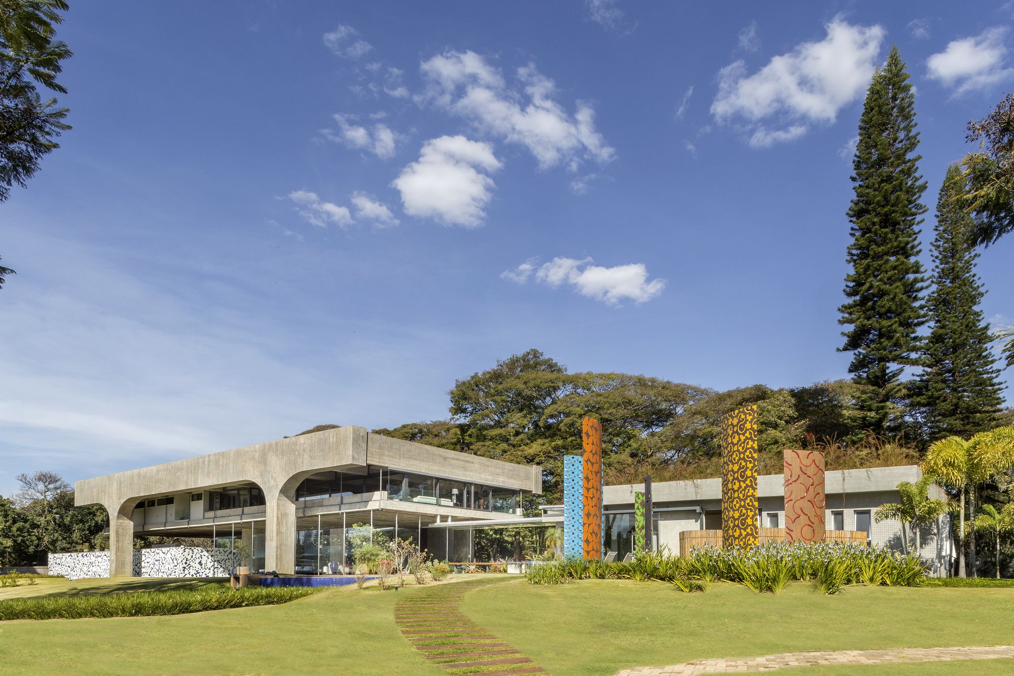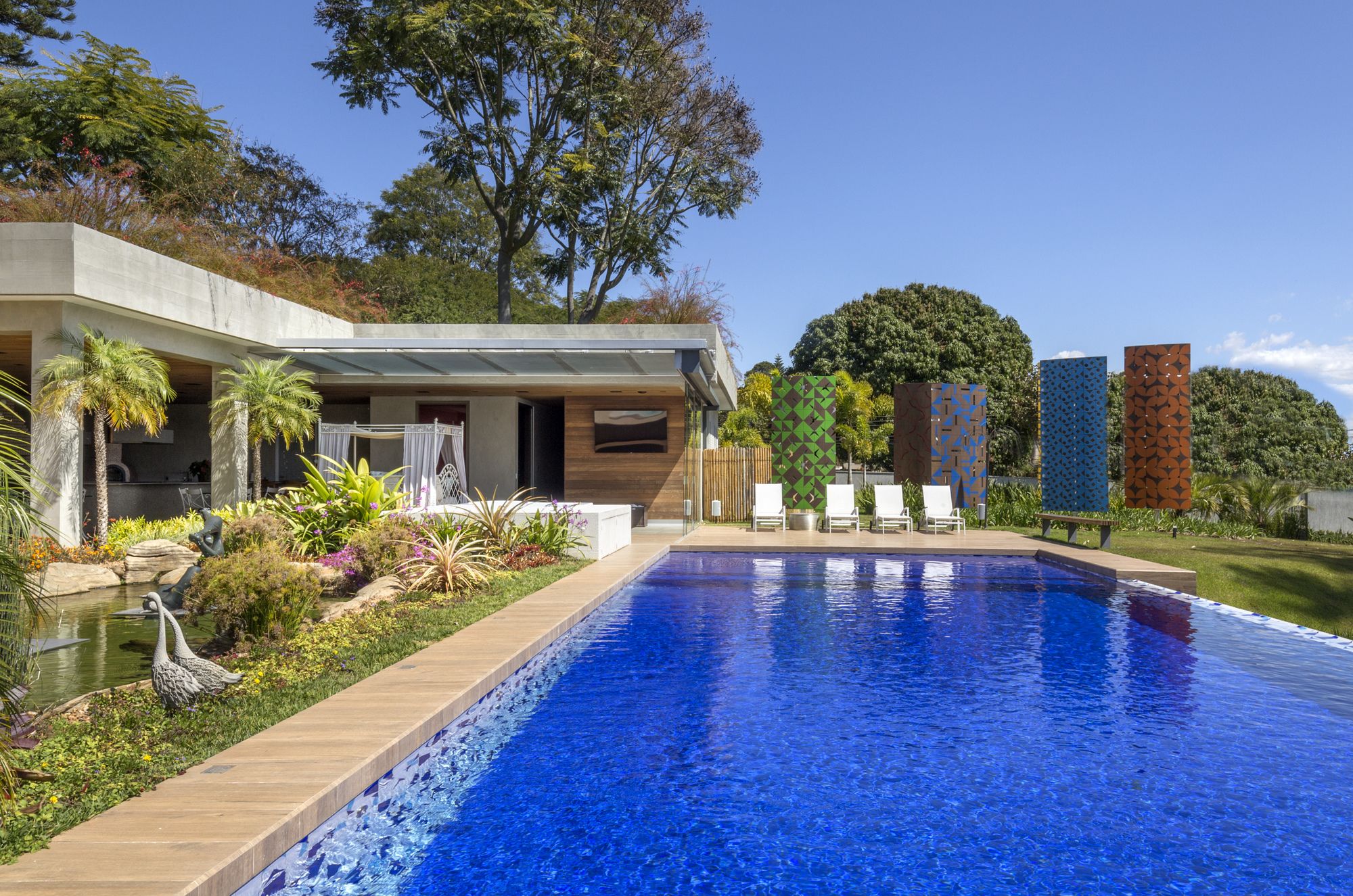 The architect also designed and led the construction of a recreation area, previously non-existent, which received a lounge with gourmet kitchen, spa, wine cellar, spacious bathrooms and an infinity pool. Sculptural rotating panels with brise-soleil functions were designed and executed to compose the space. The landscaping was 100% designed by Lutero Leme, who contemplated a 380 meter walking trail, permeated by grass, flower beds, fruit plants, pergola and gazebo.