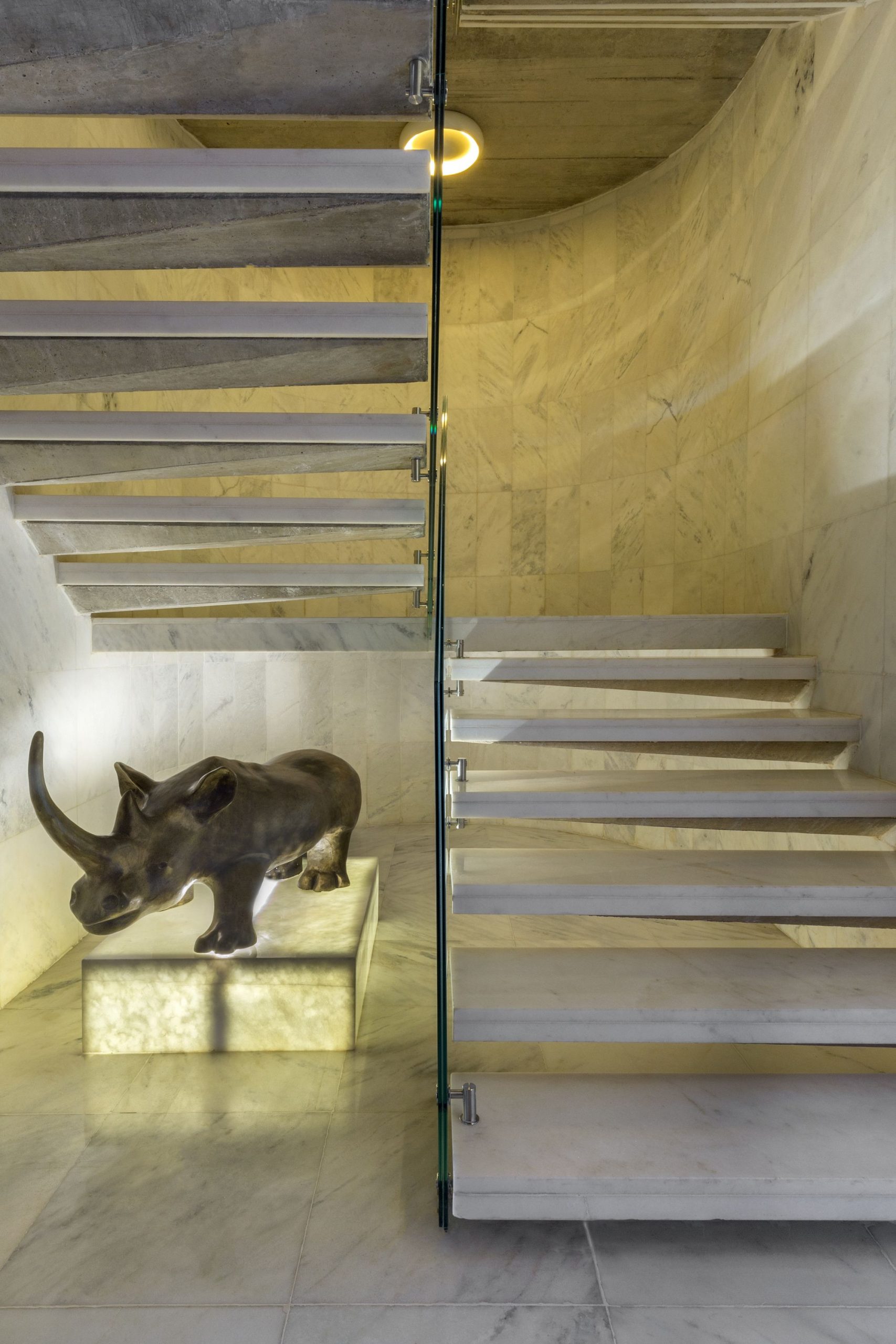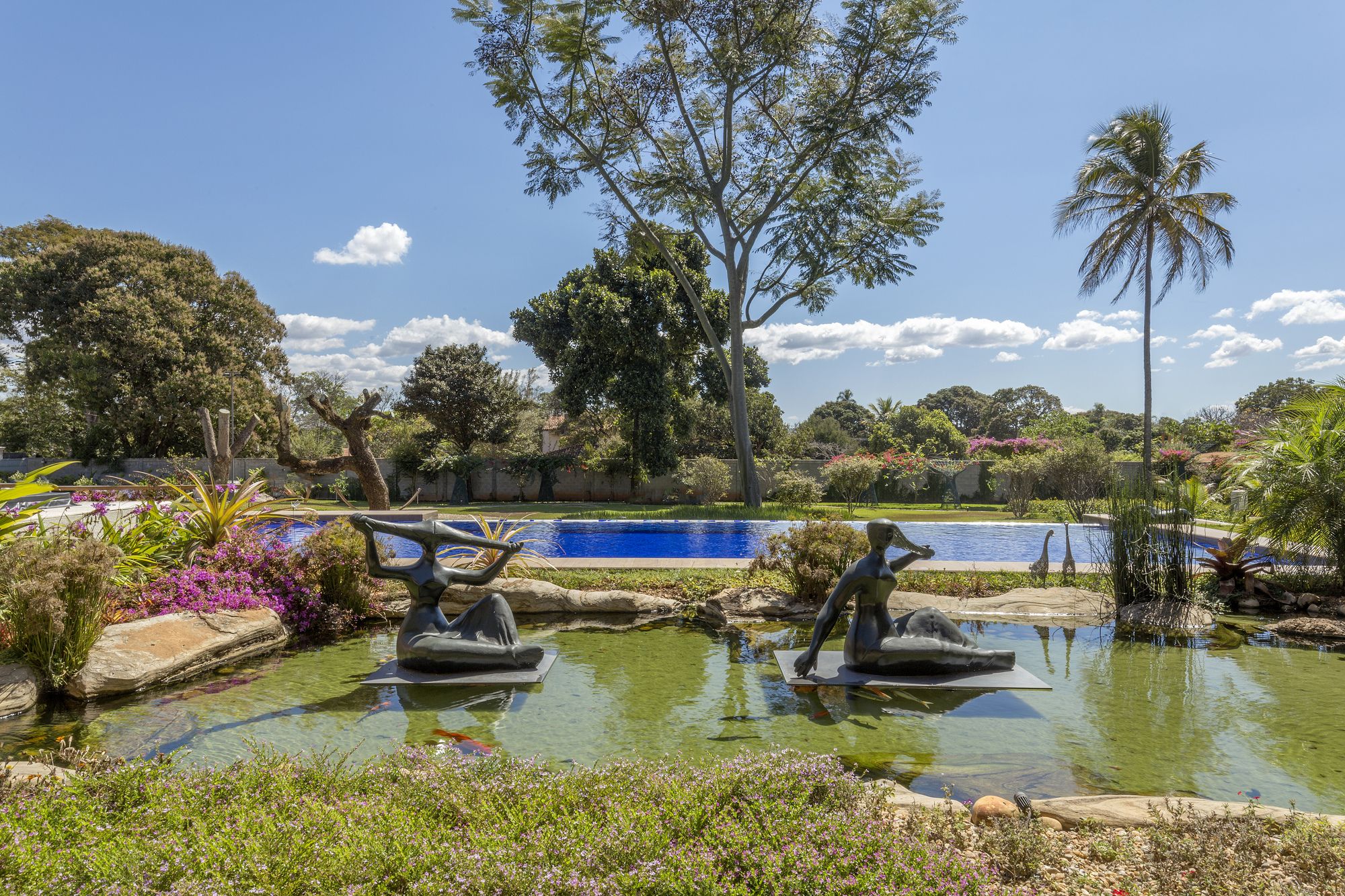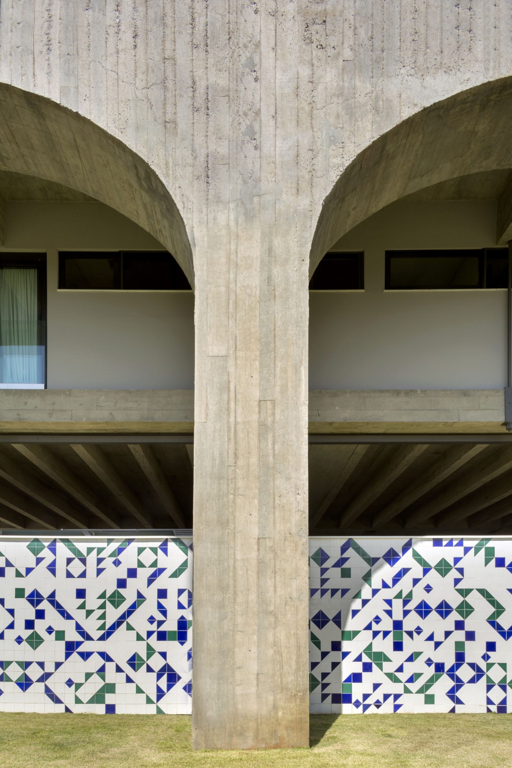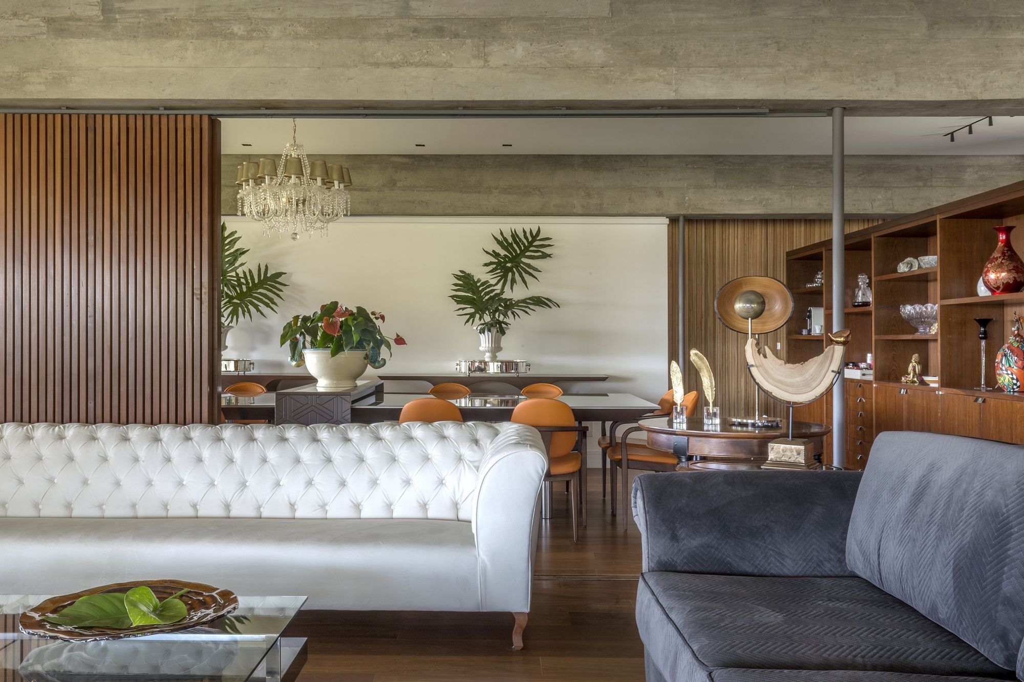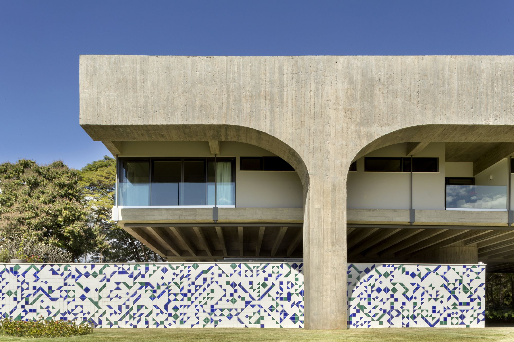 Regarding the old plan, the lack of privacy in the rooms of the residence has always been an observation by the owners. To correct it, the architect invested in new installations and acoustics techniques. Aesthetically, decorative sculpted elements were used to separate rooms and allow natural ventilation. In the finishing touches, exposed concrete, wood, marble and granite. Lighting, which previously had a dismal appearance, also gained new lighting and automation solutions. All rooms in the house have large glass panels with a wide view to the outside. The living room, with glass room dividers which allow for a 270 degree vision, promotes a beautiful view of the garden, of the whole city and of Lake Paranoá. One of the highlights is the Athos Bulcão panel: measuring 170.8 m², it is the largest piece in a private residence in the world.