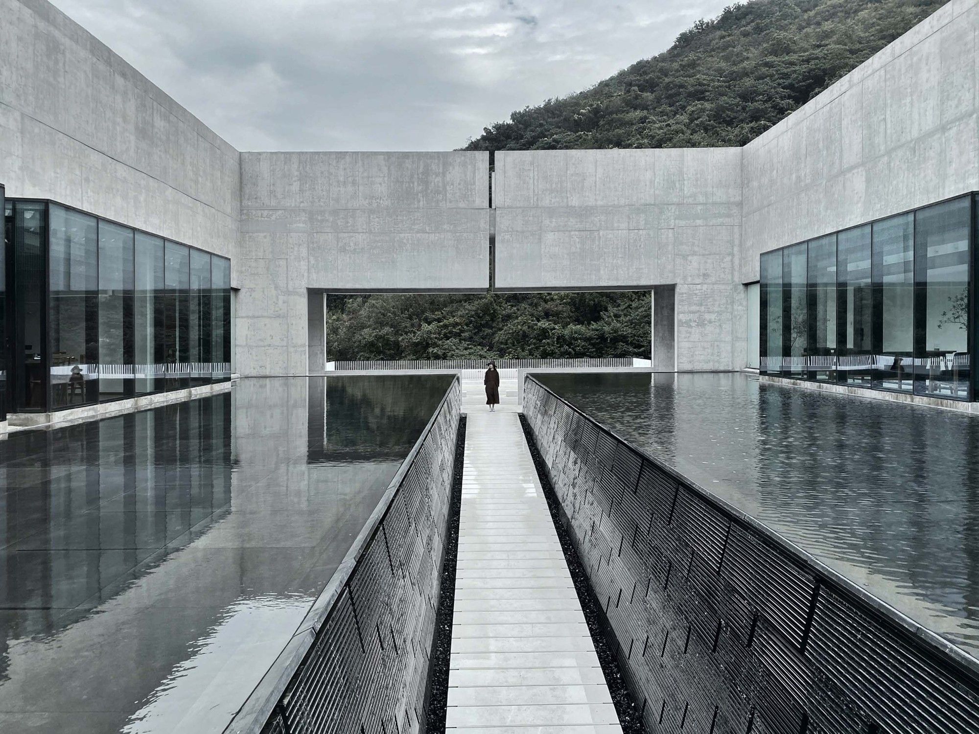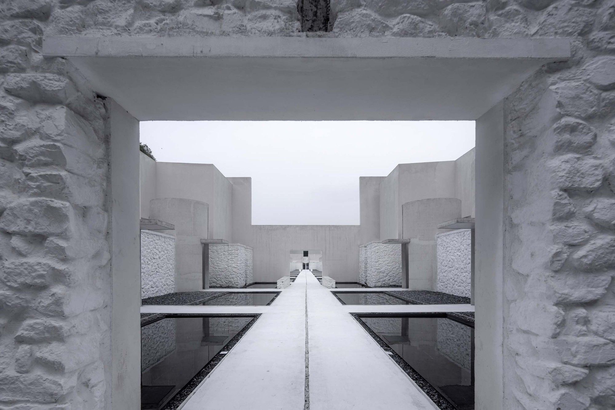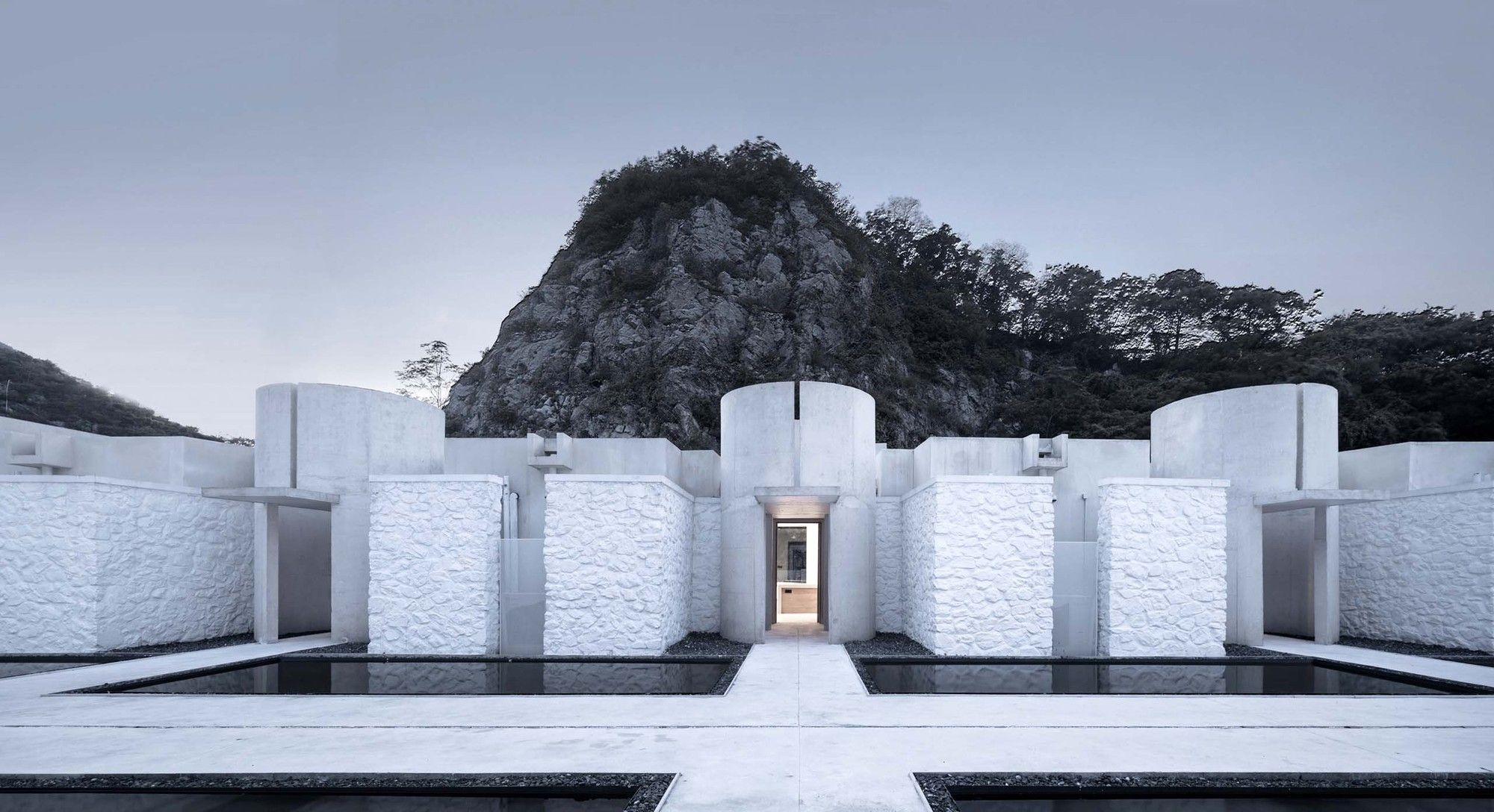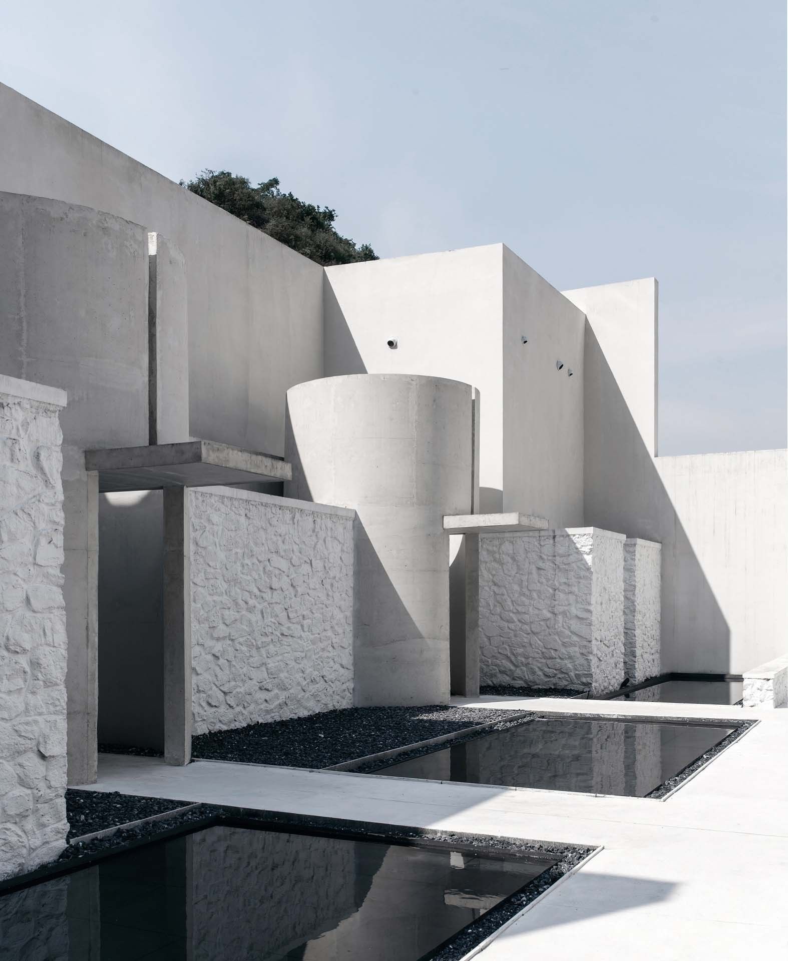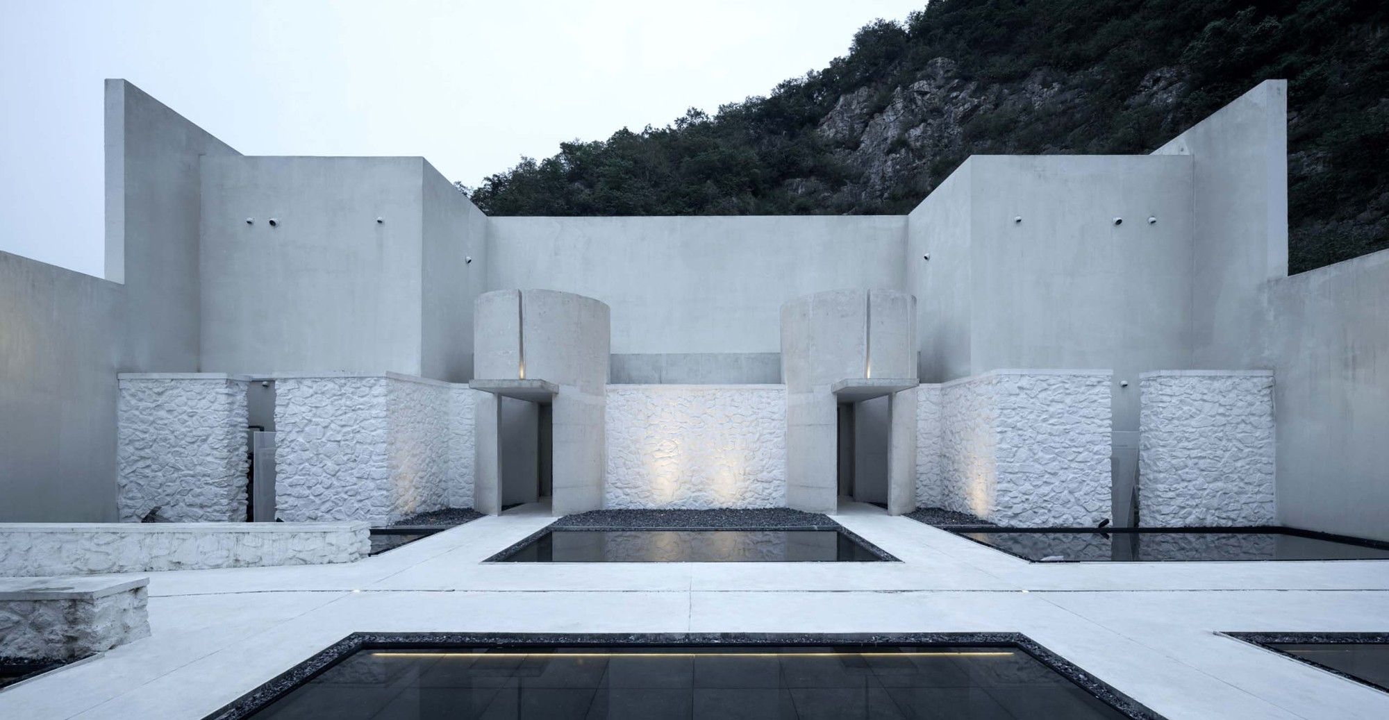 The north-south axis starting from the design library in the rotunda forms the core of the building connecting with nature. For the resort hotel, this space is healing and full of the sense of belonging. As well, the north-south axis is the main motion line connecting the public area with the guest room area. The black shallow pool against the white concrete floor connects 20 stone rooms built with quarrel site stones. The waterscape courtyard of guest room faces the valley cliff, while semi-open-air cylindrical hot spring pools in the courtyard are neatly arranged, forming a vivid boundary of the building.