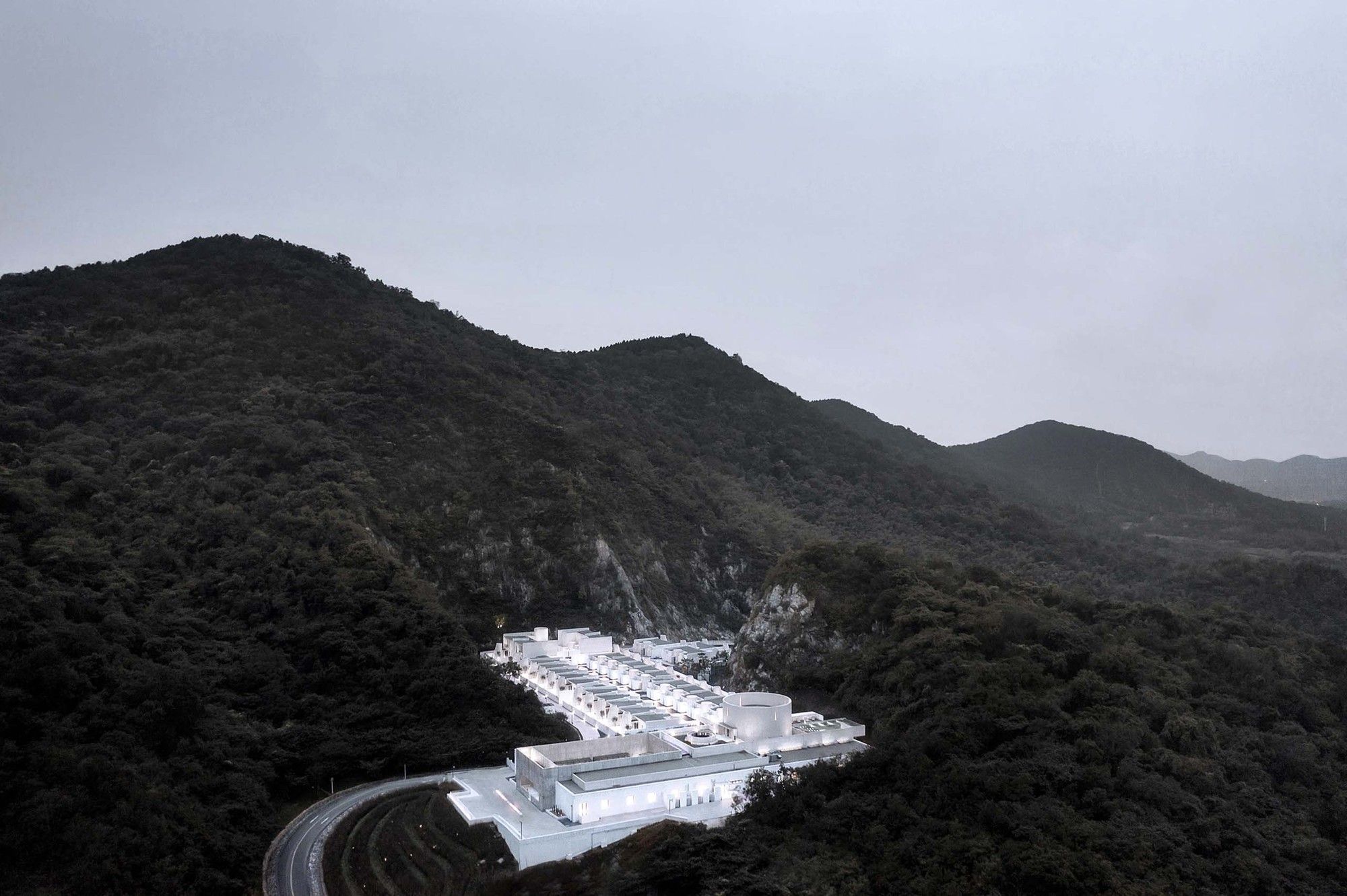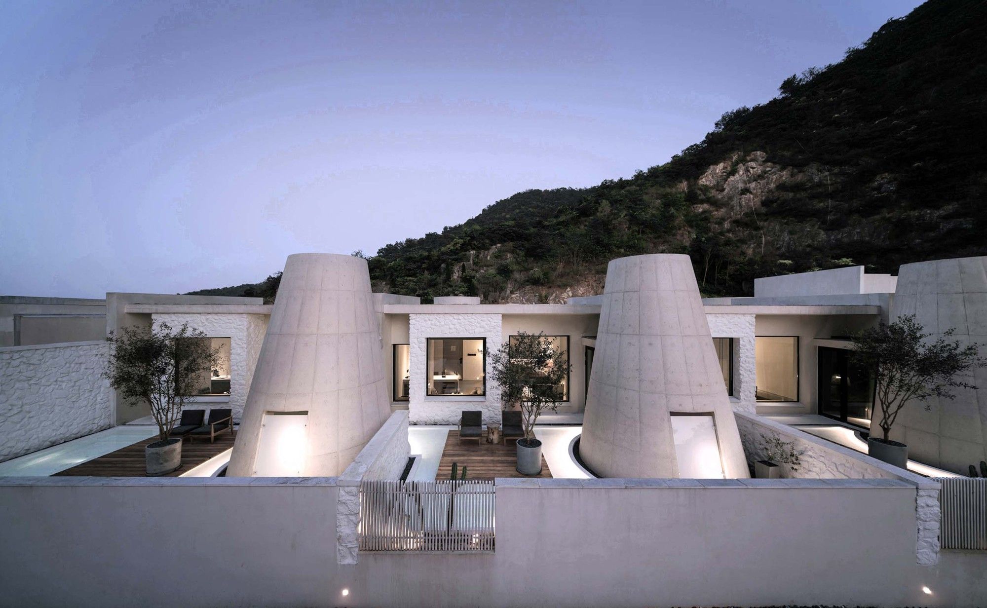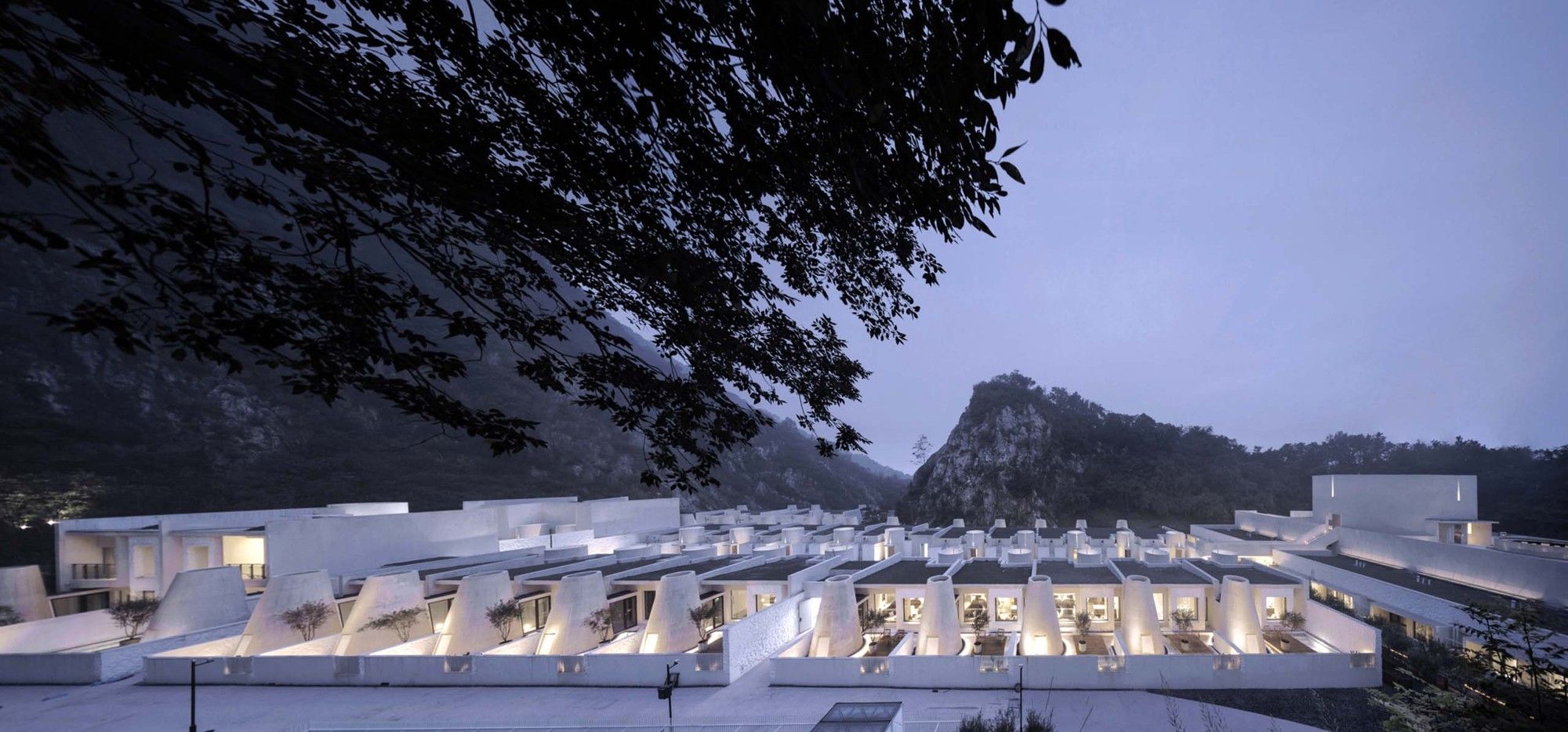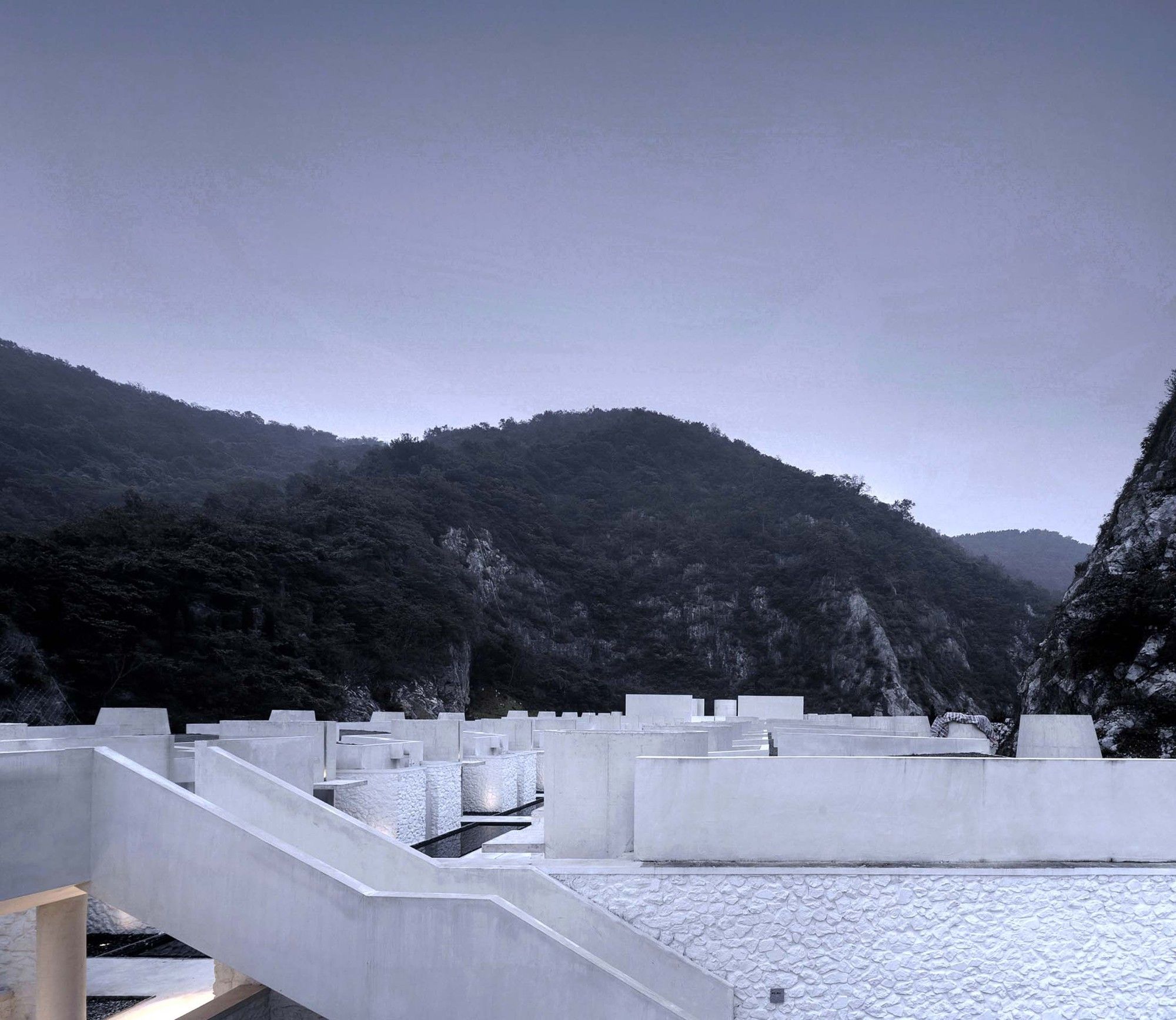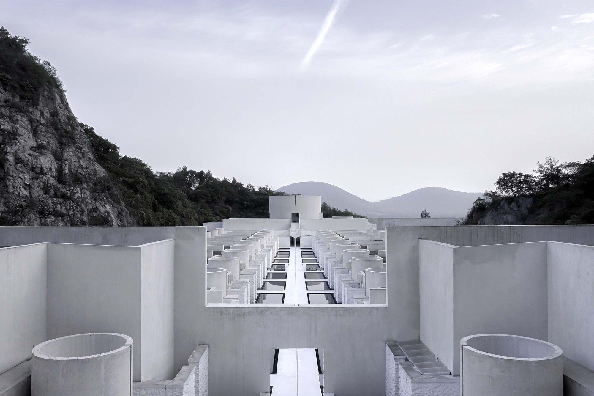 The entire architectural groups surrounded by the valley can be overlooked from the roof terrace. The concrete cylinders with high-density array, stone house roof and the precipice form the relationship between architecture and nature, and create the historical sense like a future site. The meditation space at the end of the north-south axis is a container for time and nature. The energy gathered by the north-south axis is divided here into two parts. One part continues into the valley walls, and the rest part diverts over the valley through the concrete cylinder, connecting sky and earth. Echoing with the local context of Tangshan homo erectus cave, continuous white cement interface is adopted for furniture, walls and floors of the guest rooms to create a relaxing holiday atmosphere of lying on the ground and bring the different romantic experience of “a high-class sense of only four walls in a room” in this hot spring hotel.