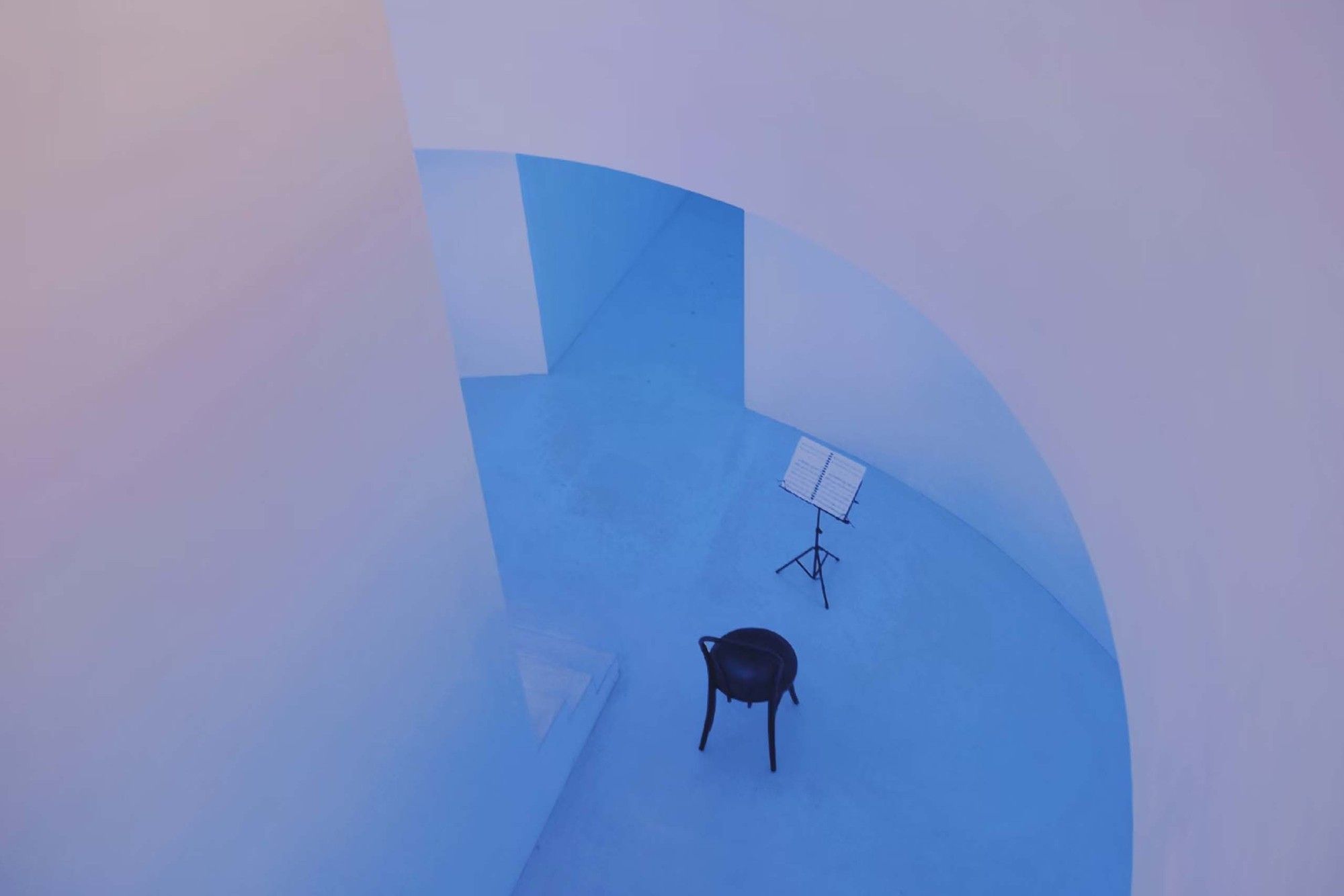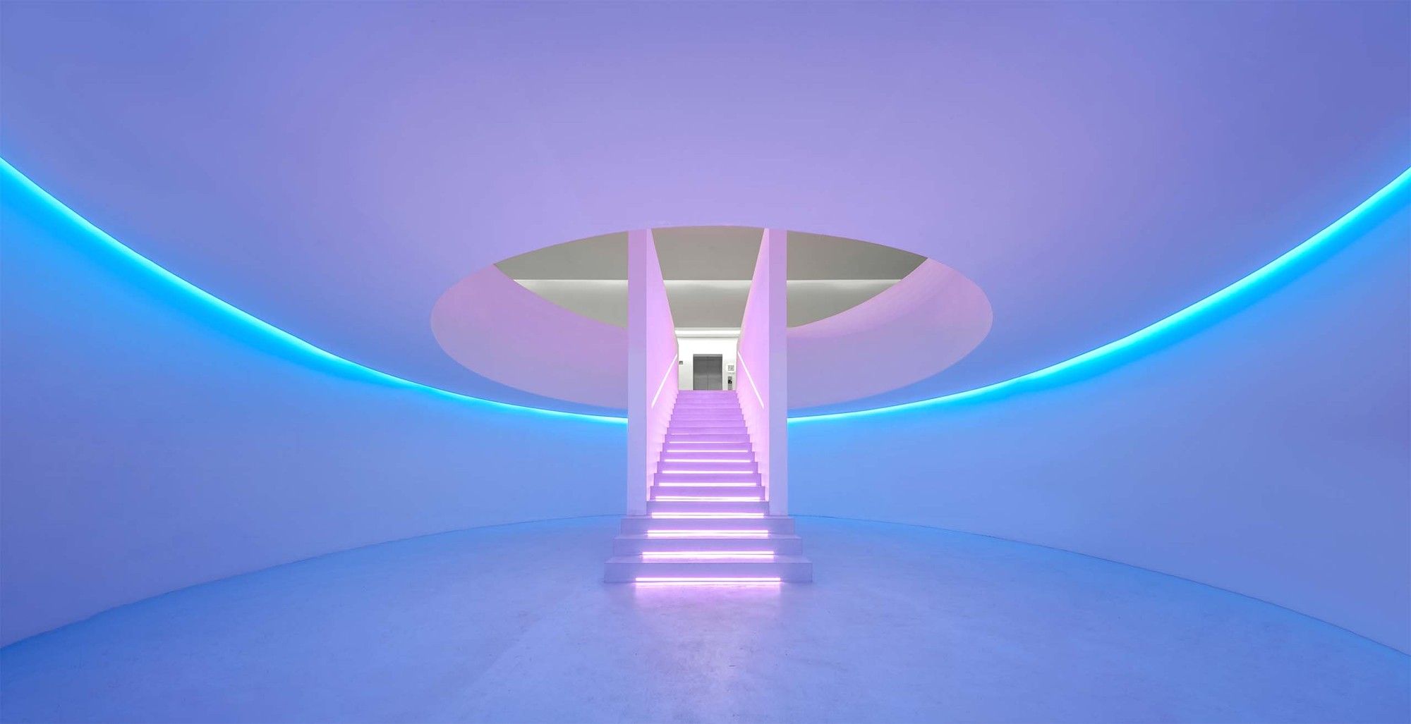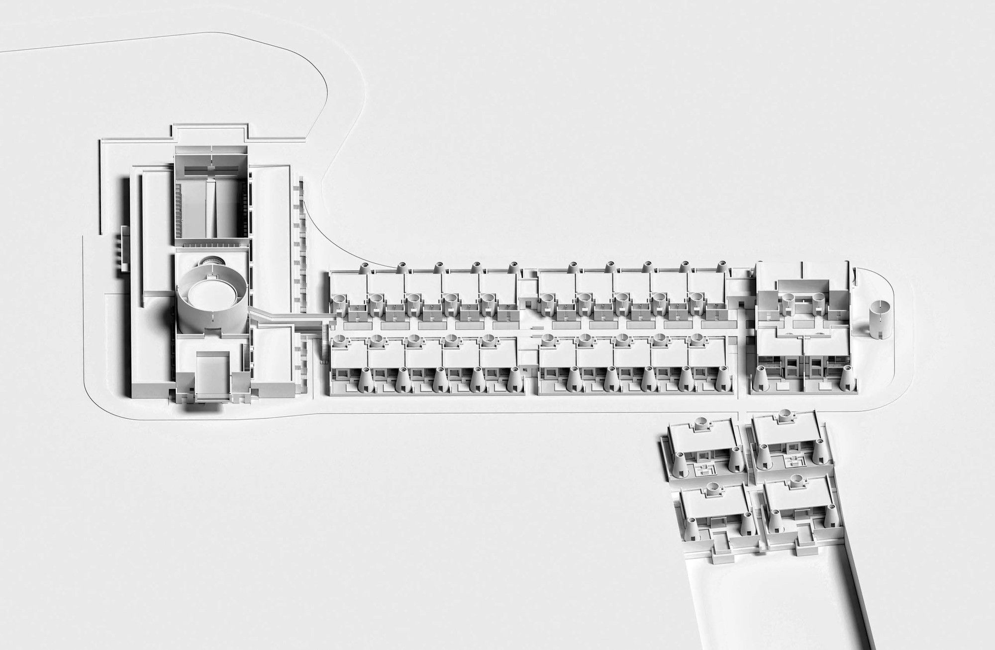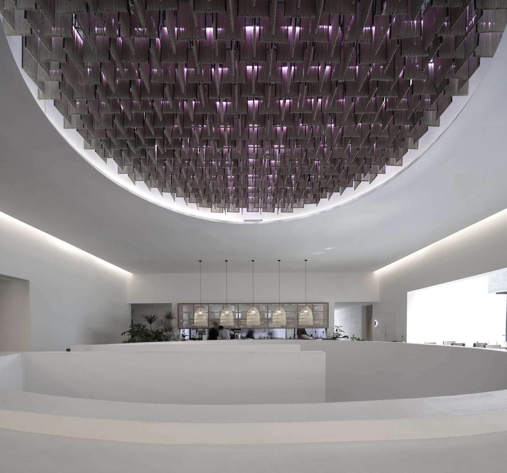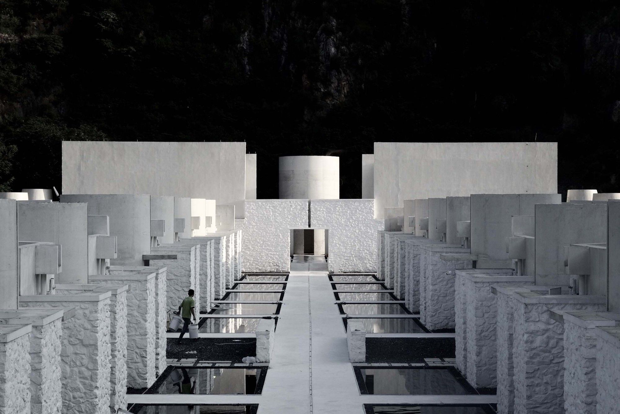 The entire architectural groups surrounded by the valley can be overlooked from the roof terrace. The concrete cylinders with high-density array, stone house roof and the precipice form the relationship between architecture and nature, and create the historical sense like a future site. The meditation space at the end of the north-south axis is a container for time and nature. The energy gathered by the north-south axis is divided here into two parts. One part continues into the valley walls, and the rest part diverts over the valley through the concrete cylinder, connecting sky and earth. Echoing with the local context of Tangshan homo erectus cave, continuous white cement interface is adopted for furniture, walls and floors of the guest rooms to create a relaxing holiday atmosphere of lying on the ground and bring the different romantic experience of “a high-class sense of only four walls in a room” in this hot spring hotel.
