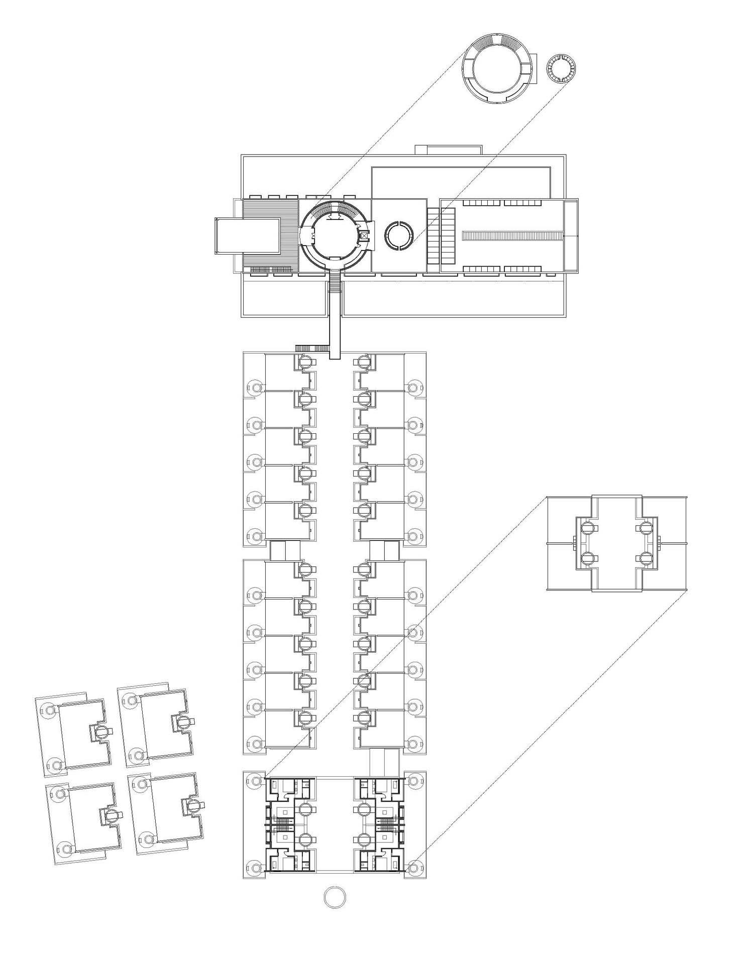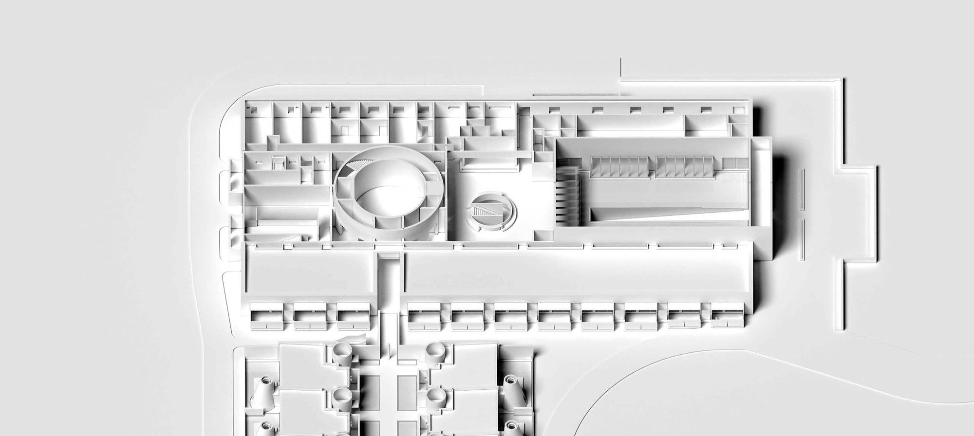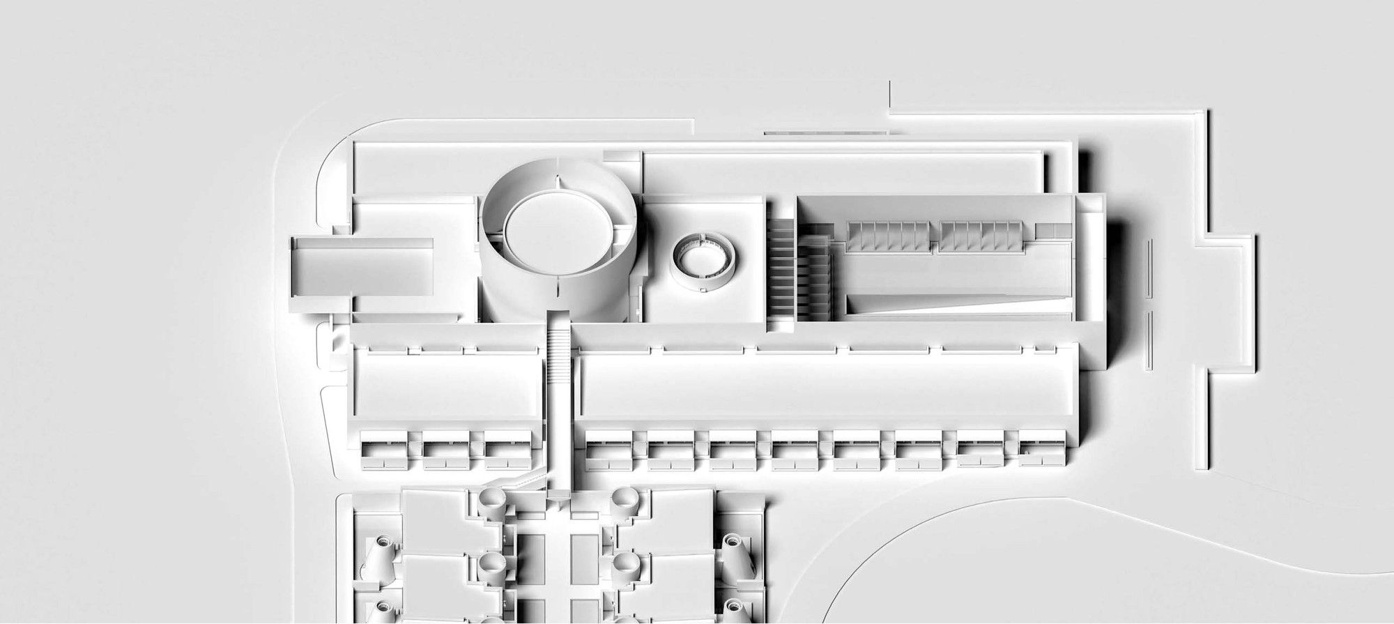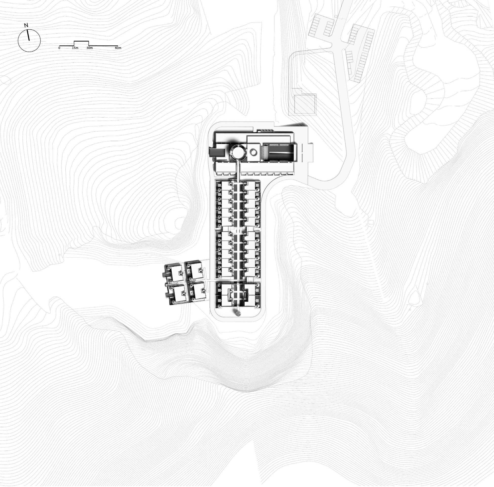 The landform of Tangshan Stele and Neogene Volcano in Tangshan area is silent, coarse, solemn and historic. Stone is an important characteristic of Tangshan area and also the spirit miniature of Tangshan. China Cement Plant and Jiangnan-Xiao Ye Tian Cement Plant in Tangshan area were famous in the industry. Due to urban expansion and ecological protection in recent years, all cement plants in Tangshan area have been closed and removed, but their high-quality white cement used to be symbolic limestone mineral products in the region. A hot spring hotel is built with the stones from foundation excavation, plus white cement, which is the exploration starting from the materiality of materials. Stone and white cement contain the local gene of Tangshan and the quarry site. Based on the clues of the history of Tangshan geological park and the human history of Tangshan Ape Men, Ruralation Museum Hotel creates a historical place like the ruins of the future and let us feel the evolution of nature in time. From the mysterious human origin of Tangshan homo erectus to romantic prototype space of Ruralation Museum Hotel, the space recovery and connection with time never stop.