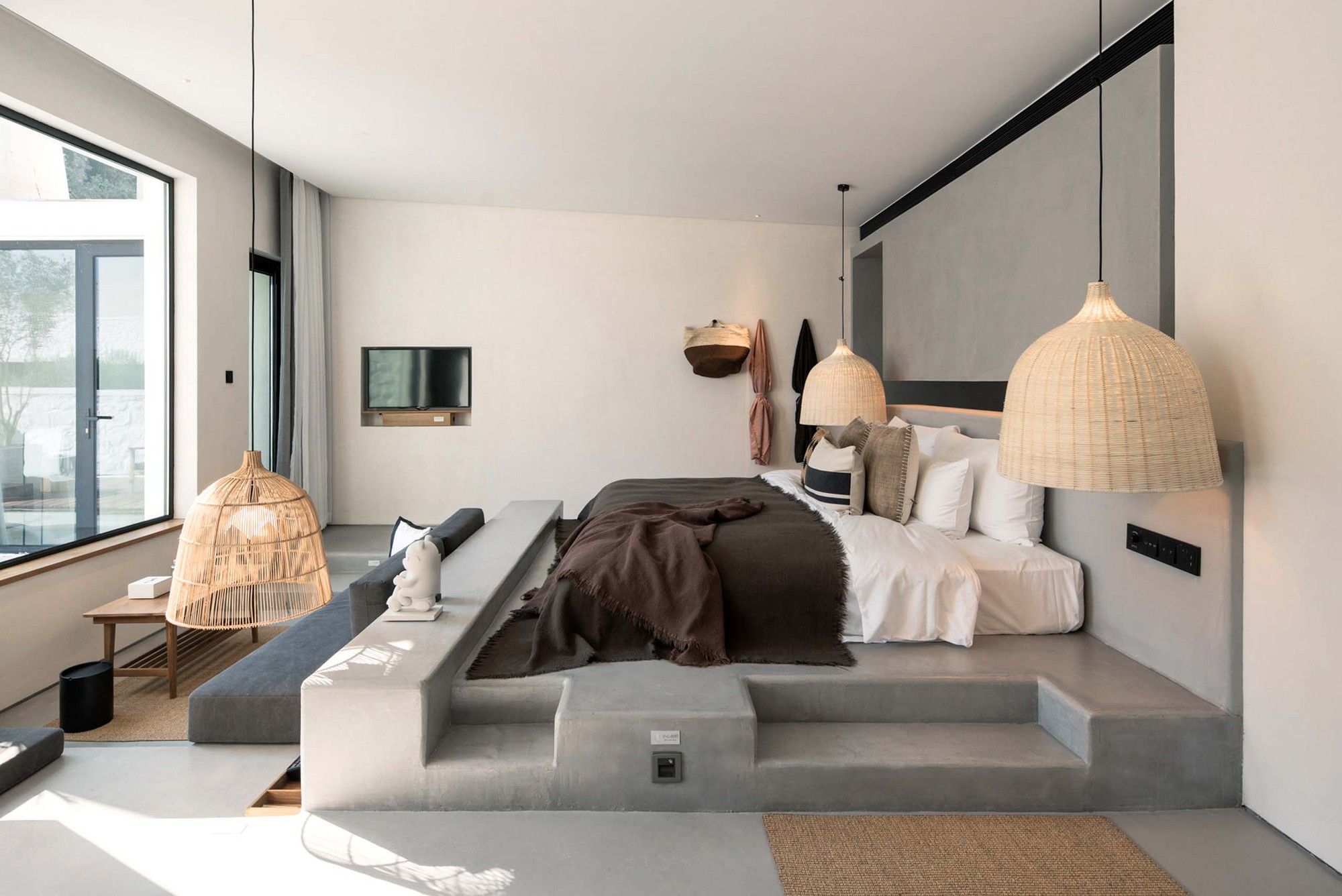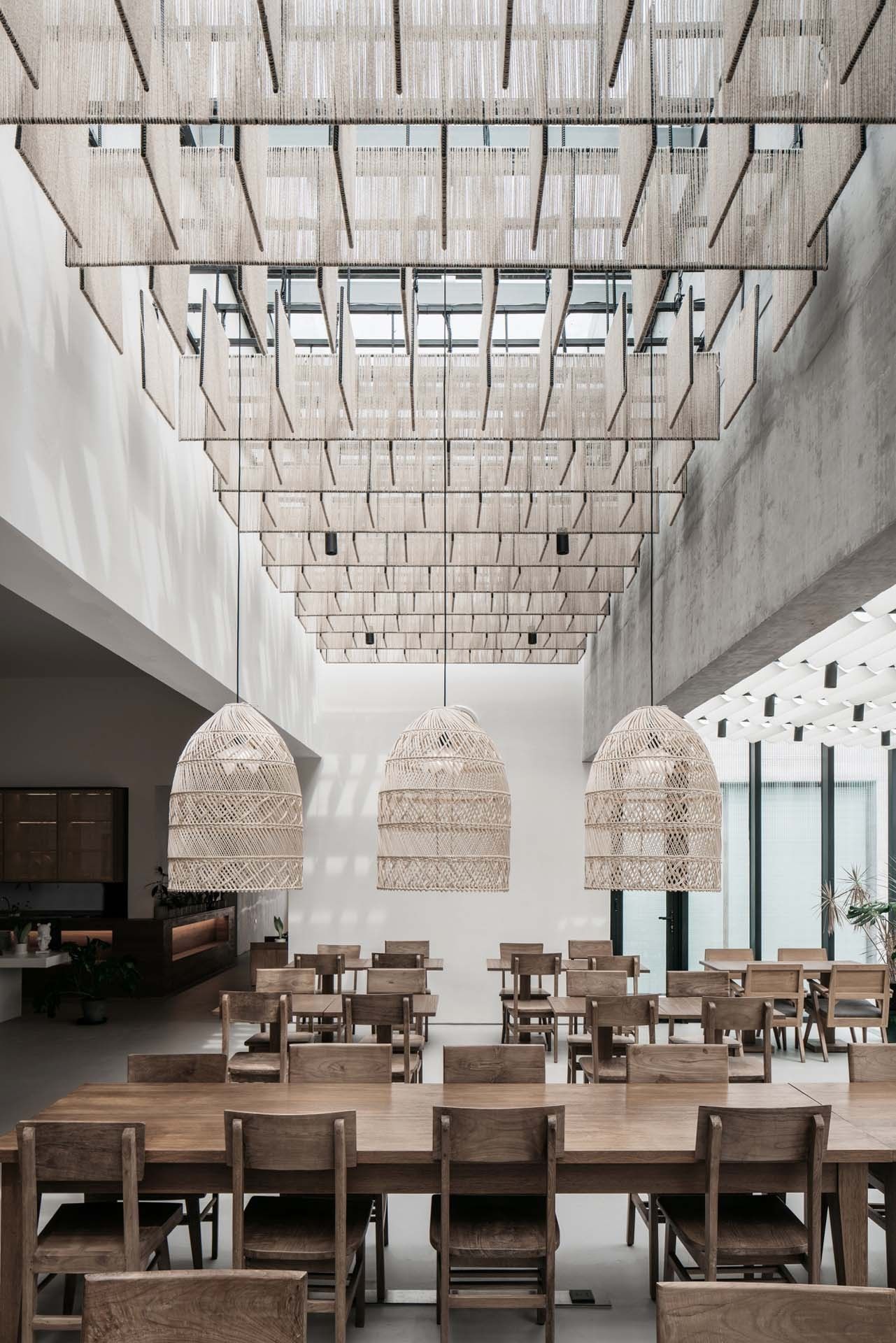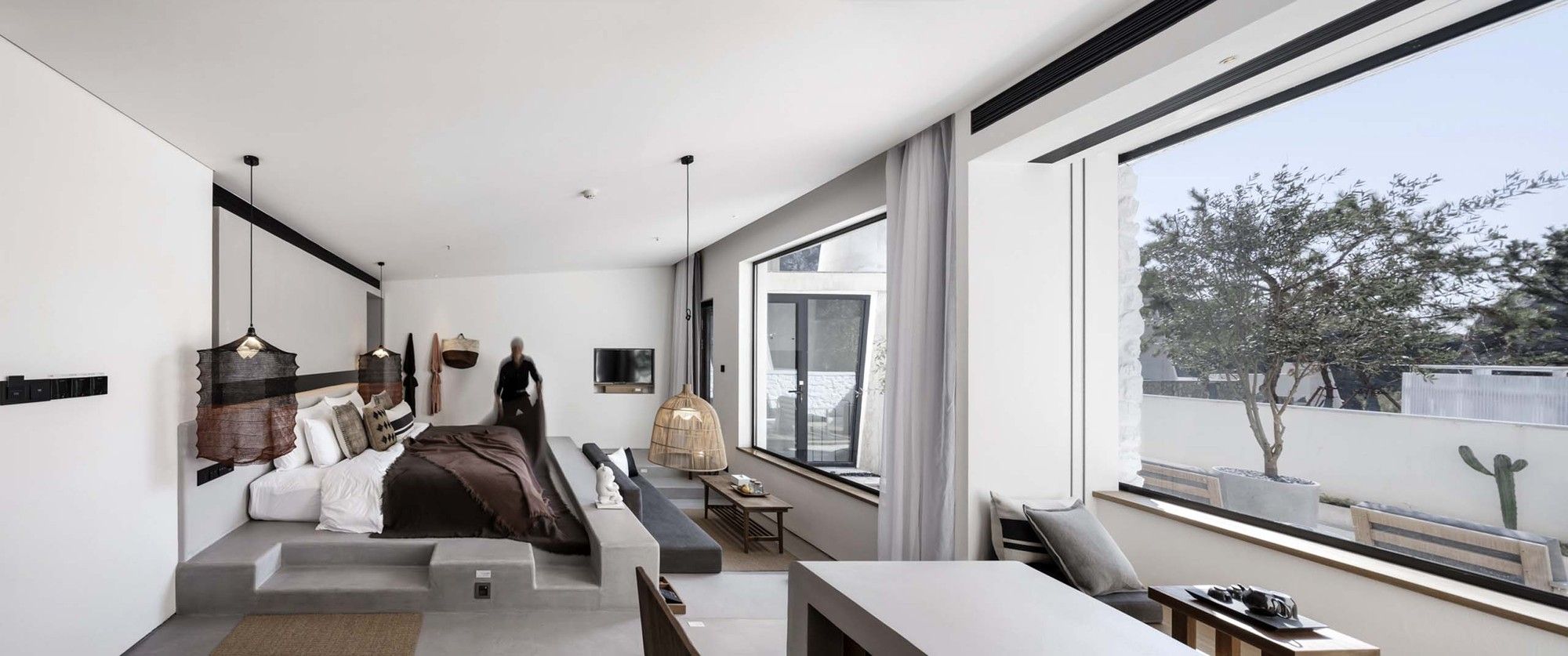 The space creation and immersive experience process of Ruralation Museum Hotel fully embodies the design idea on the relationship between man and space, between materials and construction and between site and place. White cement concrete cylinder, white stone exterior wall, white cement pavement, grey white nanometer cement wall, furniture and platform are entirely used in the building. White as the main space tone creates a simple, pure and romantic atmosphere. Ruralation Museum Hotel is built with the waste stones on the quarry site. The hand-made fabrics such as hemp rope and rattan plaited articles, Lava Lab’s exclusive Tyvek series of household products, and special cement series of guest room products are used, and environmental protection goes through the immersive experience.