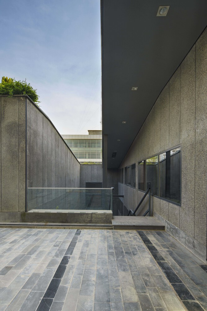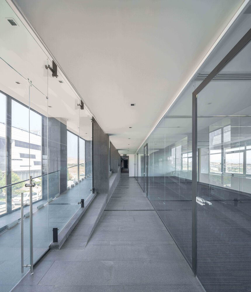 Saman Satellite uses washed cement as the primary material to maintain a neutral appearance and emphasize the building’s net form, in line with the initial design criteria. This material is not only used on the exterior but a lso extended to the interior. Additionally, transparent materials were selected to establish a connection between the interior and exterior spaces, while still adhering to a minimal color and material palette throughout the layers. The layering of internal transparent surfaces creates a visual connection between the corridors, public zones, and workspace. These surfaces are positioned between the two outer layers of the facade, both vertically and horizontally.