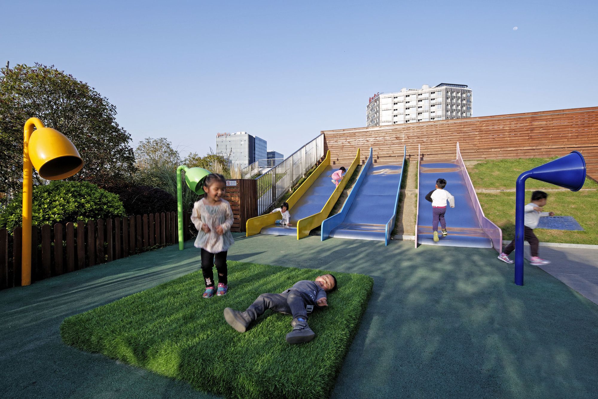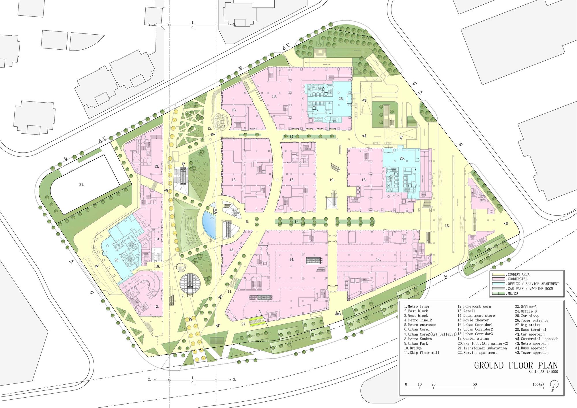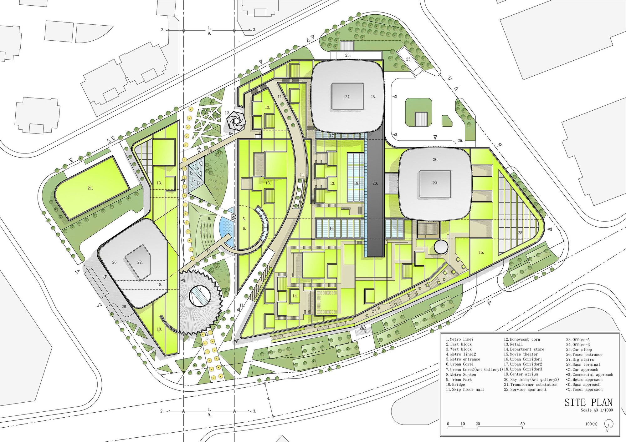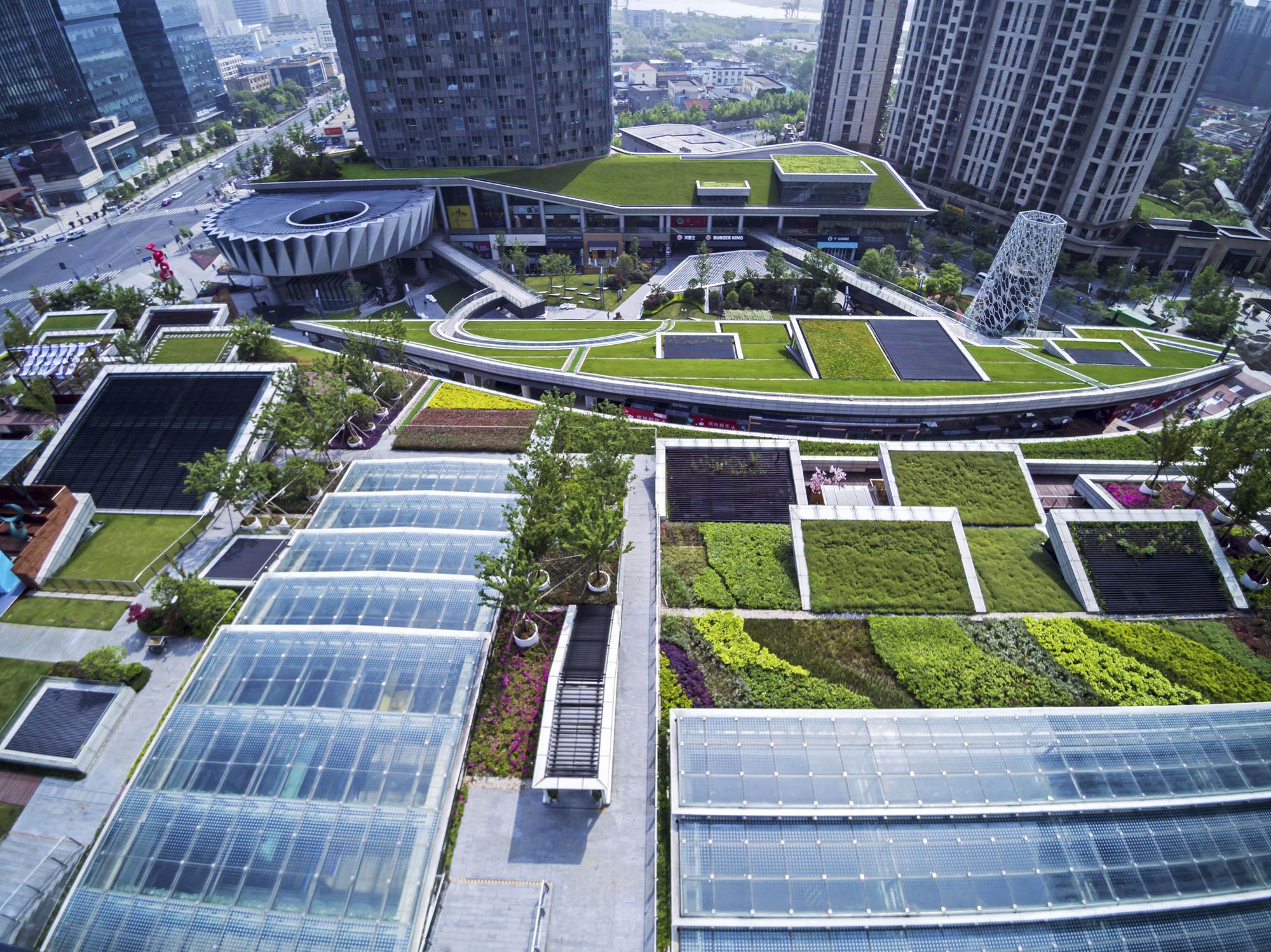 The 20,000 m2 green valley complex, designed with the URBAN FARM concept of merging nature and human space, weaves its way into the daily life of city dwellers through the intelligent roof geometry. The ‘roof’ is split into different scales and connected in various heights, where interesting terraces and slopes outdoor are connected in a 3D way, responding to the architectural functions below and human activities within it.
