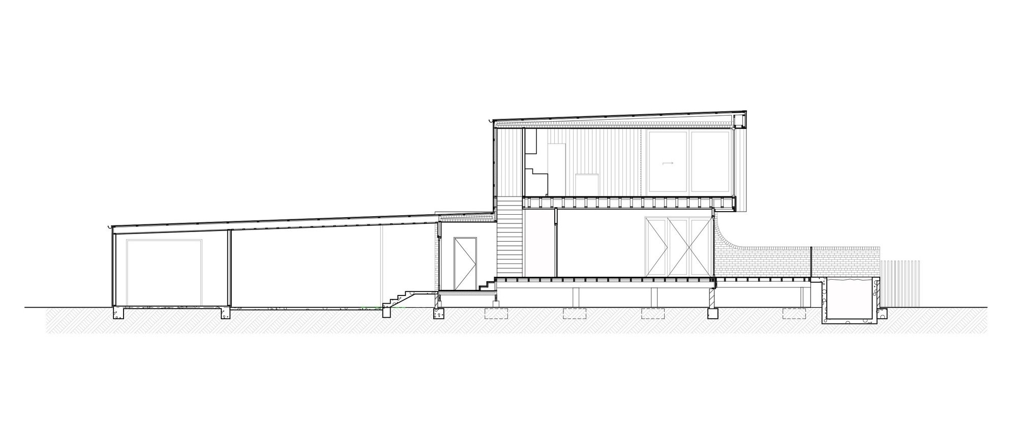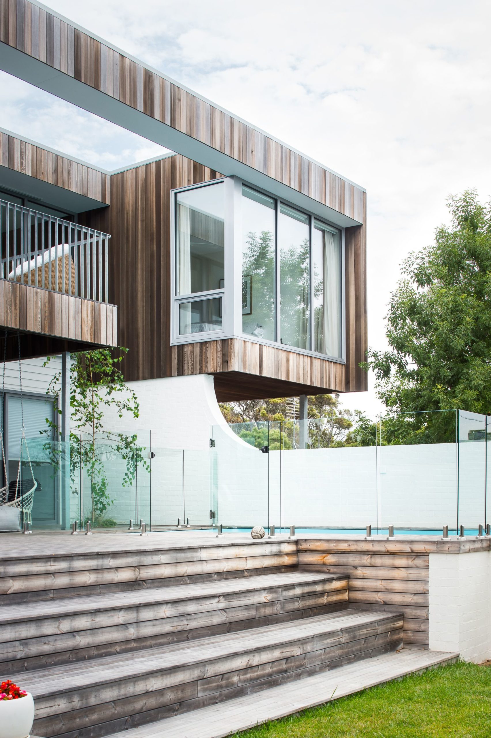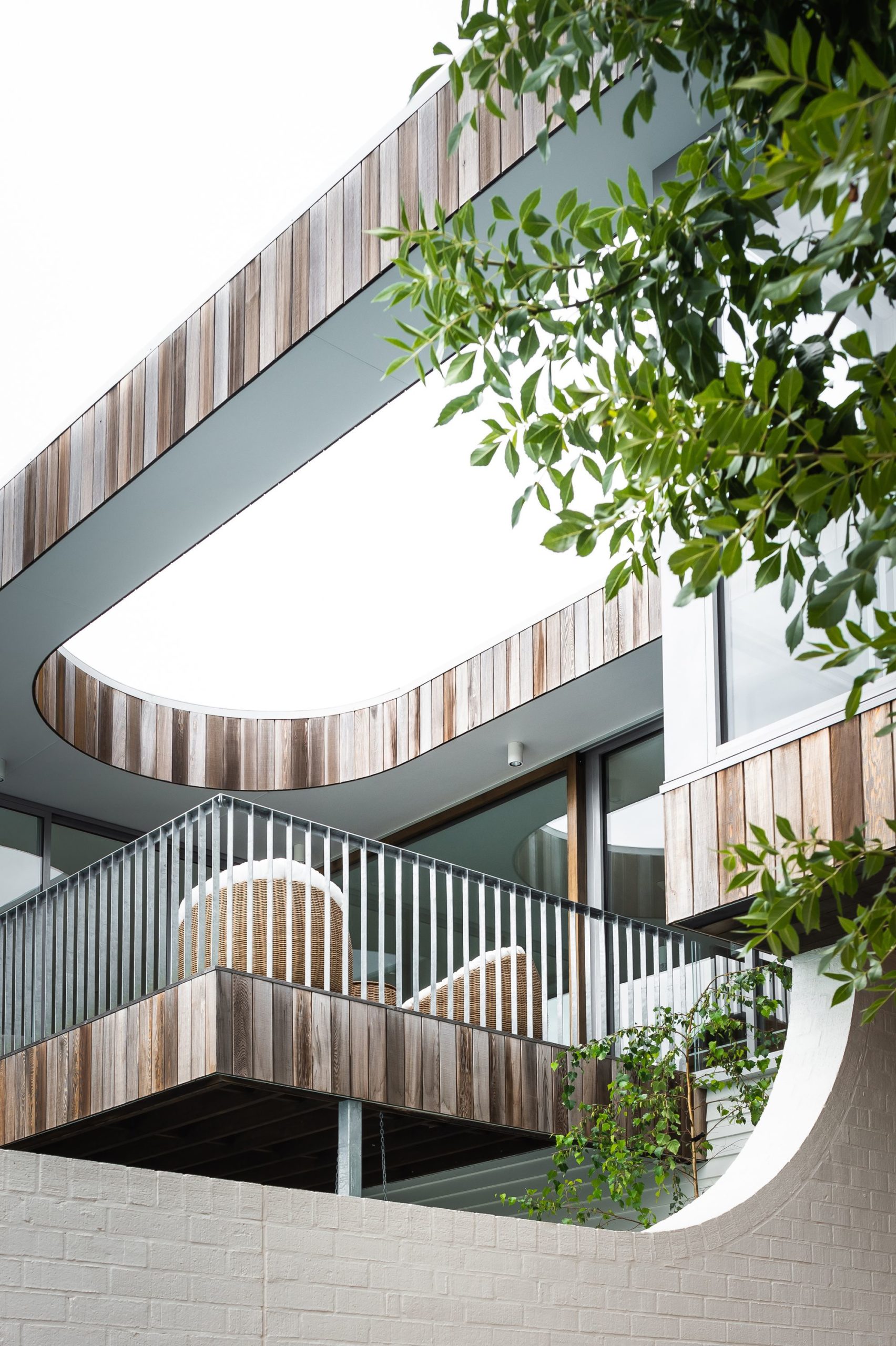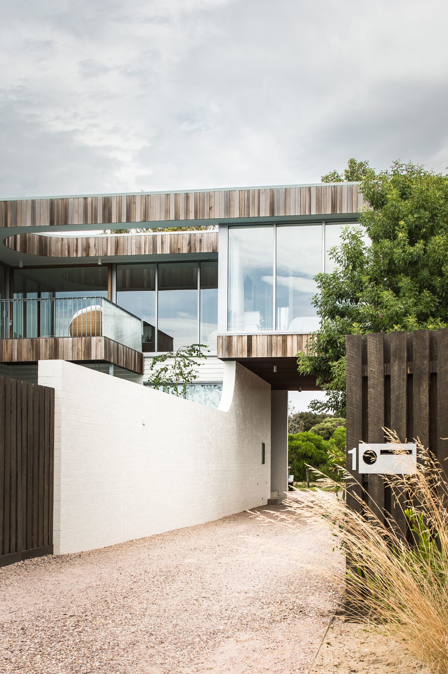 Below, the tiered outdoor pool and entertainment area reflects the shades and materials used in the balcony above, with timber decking intended to grey to the hue of Freers Beach driftwood. Finally, a series of new trees aim to further occupy the landscape, led by the courtyard centerpiece, set to grow through and beyond the curved roof cavity.