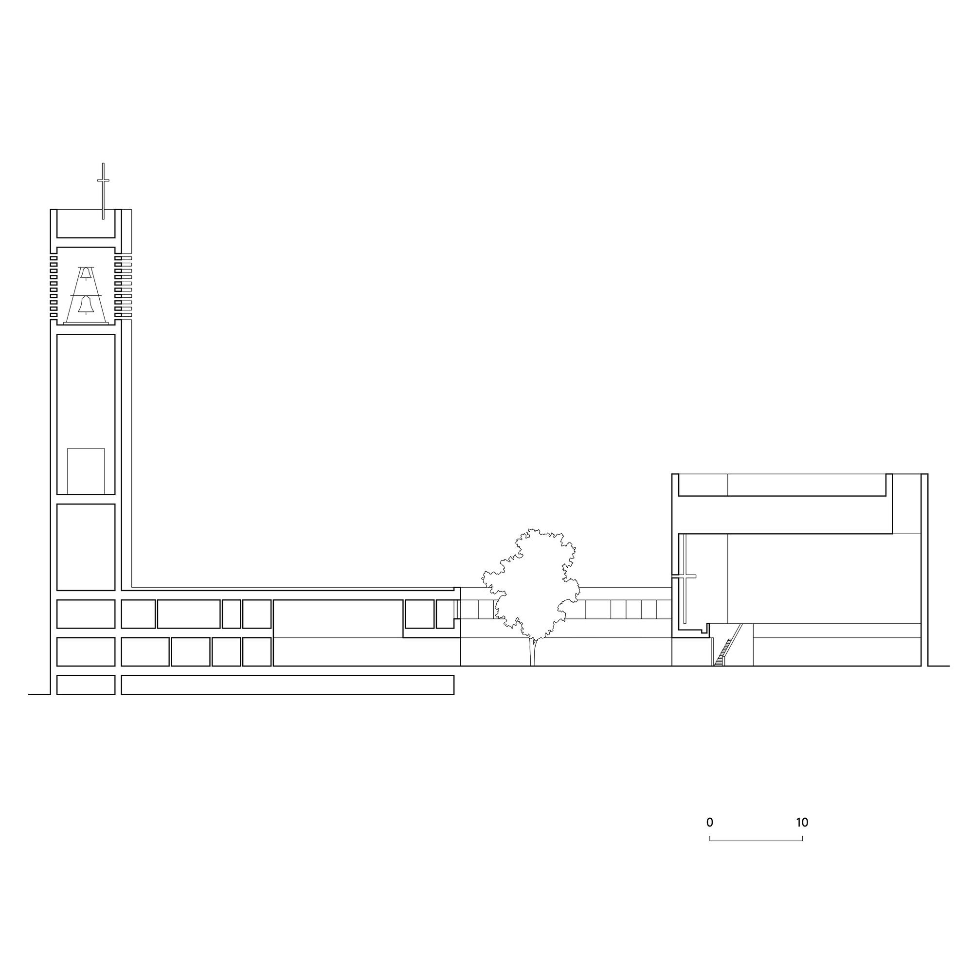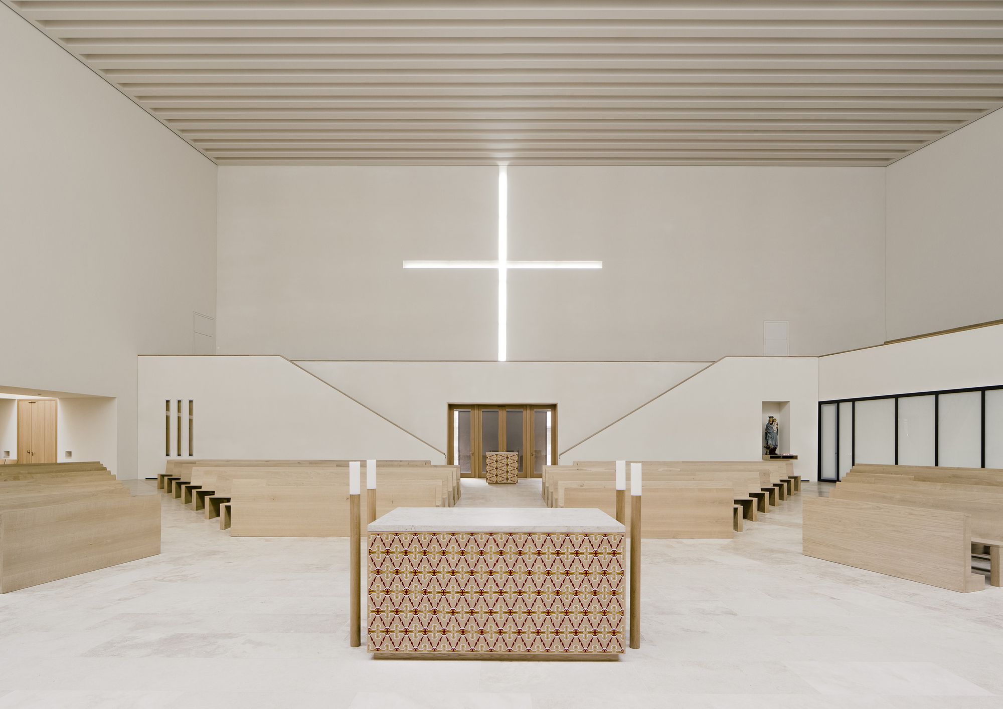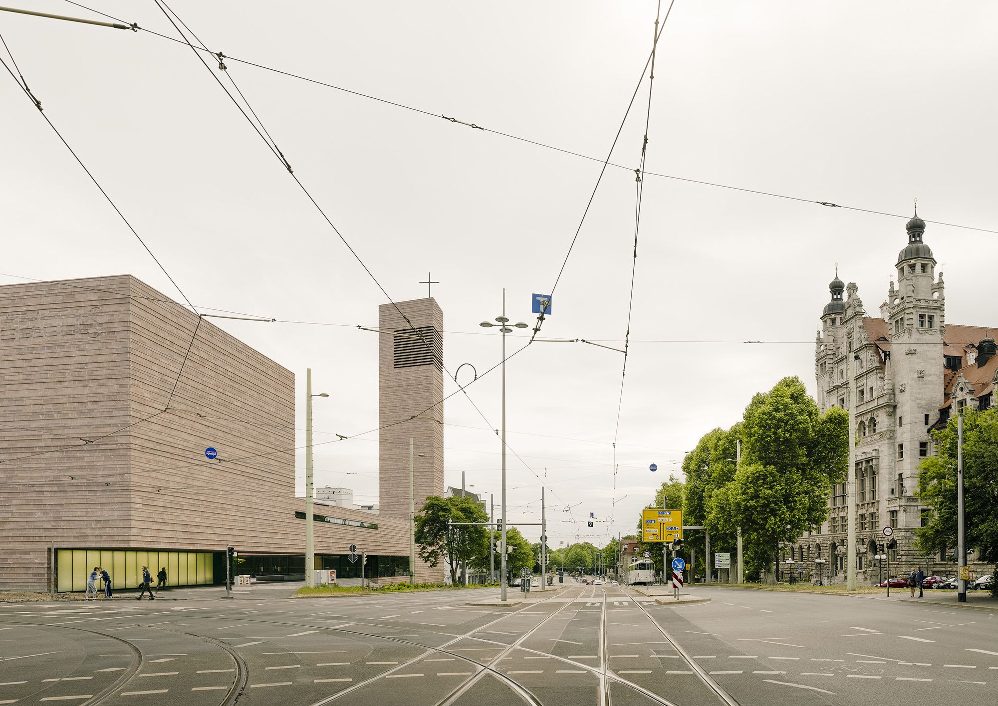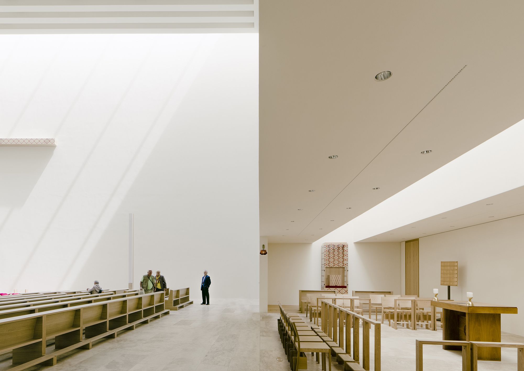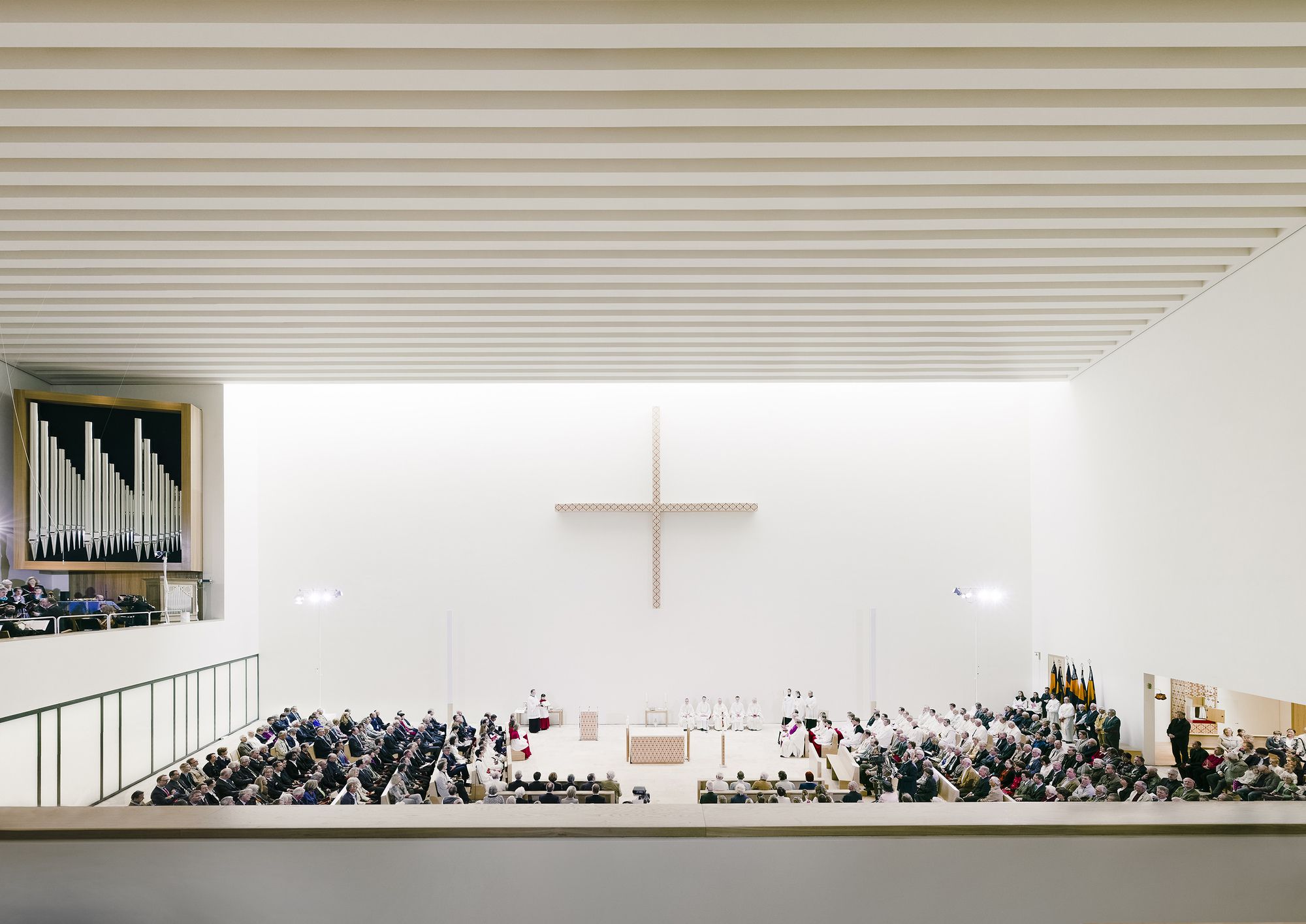 The church hall is situated crosswise and creates sufficient room for the arrangement of the community in an open surrounding area whose optical and scenographic center is the chancel. Partitions separating the community were eliminated, additionally opening the chancel as a multidimensional space usable for various forms of liturgy. Merely a gentle slope surrounds the chancel and permitting optimal visual perspectives. Across from the large cross on the rear wall of the altar (by artists Jorge Pardo) is a second cross carved into the large wall area above the gallery as a negative imprint that opens the church hall to the light of the setting sun in the west. The gallery offers room for the organ, the choir, and additional pews to be set up here. Facade made of Rochlitz porphyry. By using Rochlitz porphyry is continuing a tradition of construction of the city of Leipzig, such as with the Old Town Hall, and of the region, such as with the Benedictine Priory of the Holy Cross in Wechselburg. The horizontal layering of the various heights firmly anchors the building with the plot of land and allows it to symbolically grow out of the ground. The projections and recesses in the layering convey the rich