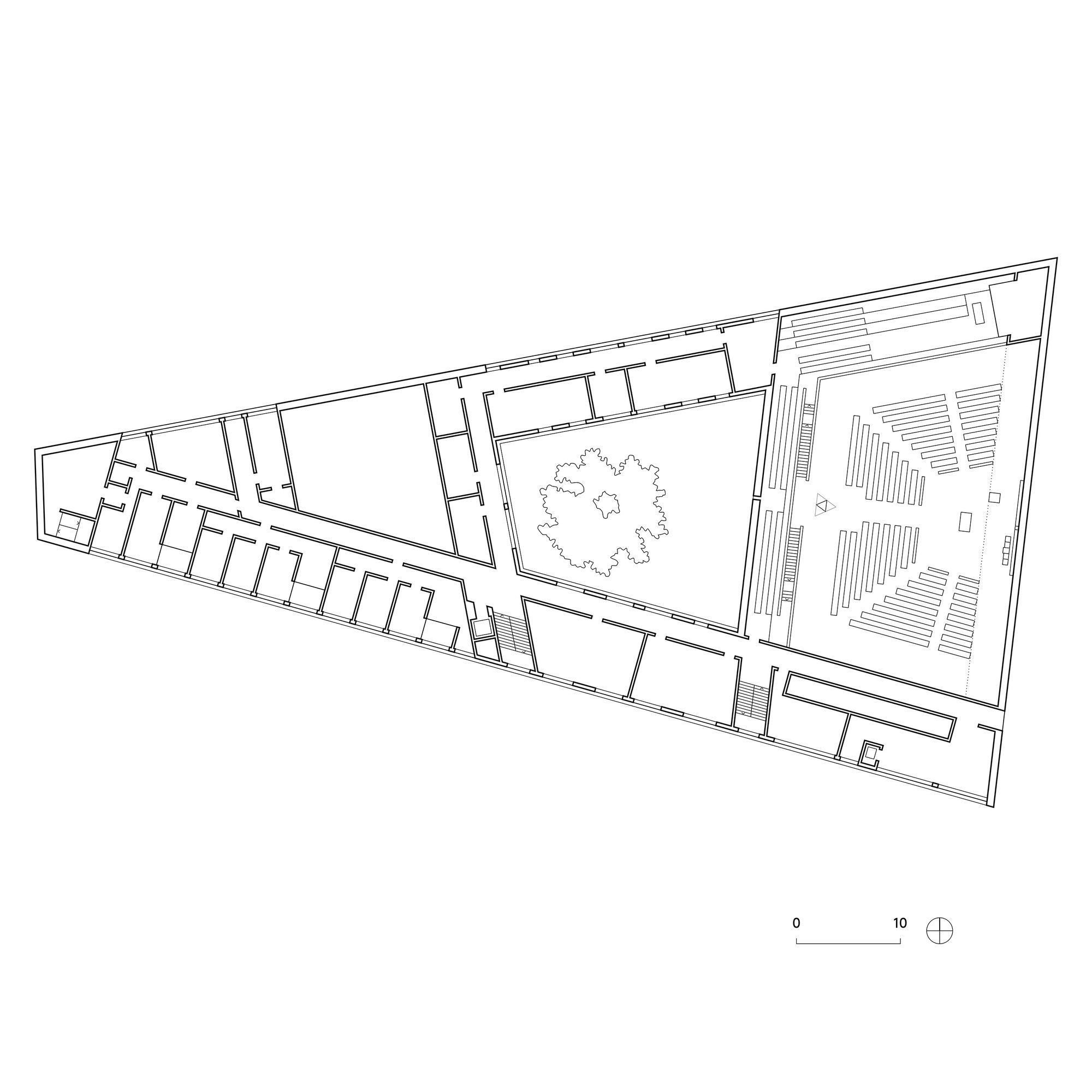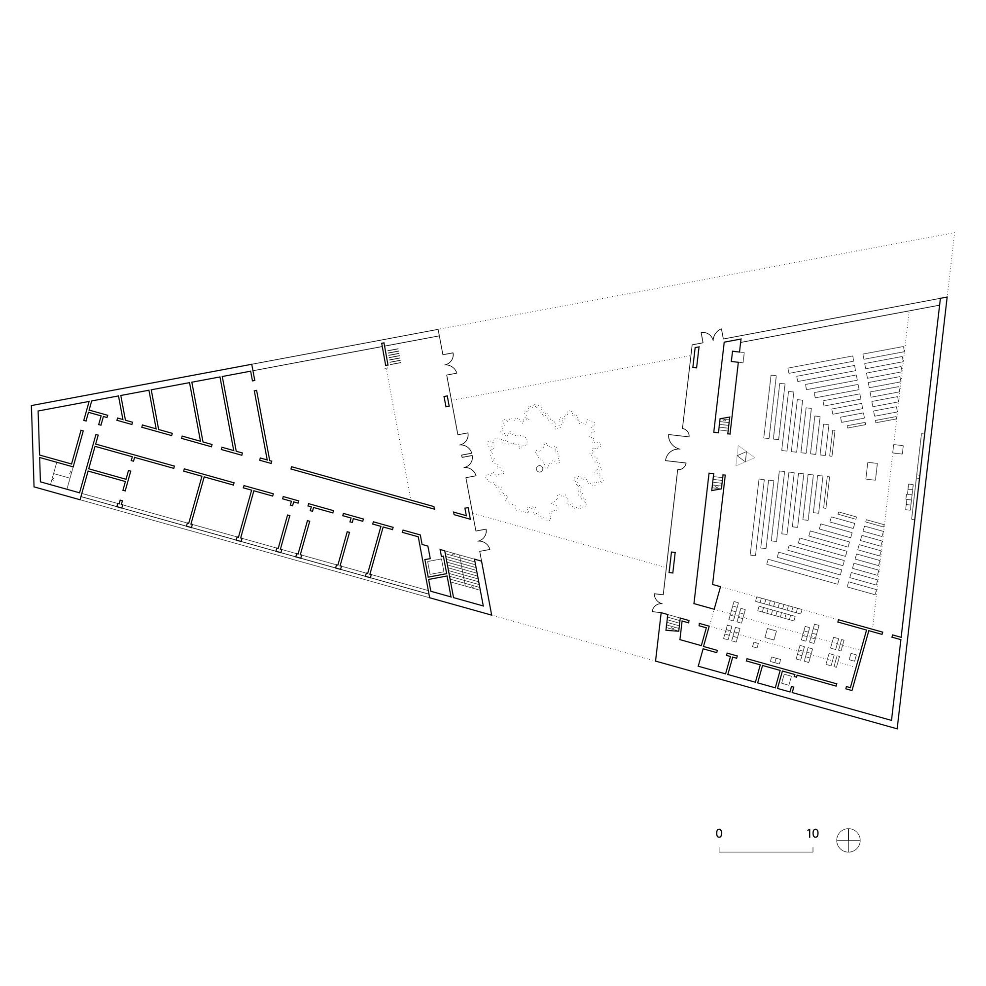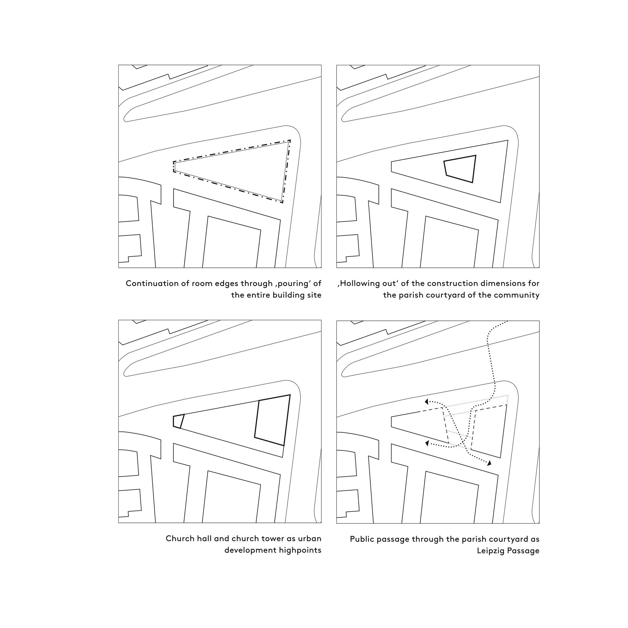The consecration of the church ended the odyssey of the Leipzig parish community that has lasted over seventy years. Its permanent return to the center of the city is manifested in the construction of the new Trinitatis church. The new parish church is developing out of the organism of the surrounding city. It obtains its presence through its high church hall, church tower and inviting openness of the parish courtyard. In a prominent location across from the New Town Hall the Trinitatis church define a site that respectfully integrates into its surroundings and forms a clearly distinguishable edge along the city center ring. The structure is now being put up with the ‚pouring‘ of the triangular plot of land and the concreting of the poles of the church hall and church tower on opposite sides. The parish courtyard was cut into the area between the two highpoints to create a new central meeting location. The silhouette of the new church marks the beginning of the further development of the underused neighboring urban area. The Trinitatis church is primarily characterized by light, space, and material. With its interior height of over 14 meters, the church hall enables a transcendent spatial experience that is further intensified by the large skylight located in 22 meters high. Daylight of varying intensity falls from this along with the rear wall of the altar in the church hall and defines the atmosphere of the hall. Another important element is the large ground-level church window (by artist Falk Haberkorn) that produces the communication between the community and the city as if through an interactive store window. It opens and delimits the church hall at the same time while serving as a targeted opening as an interface between the world of the profane and the realm of the sacred.