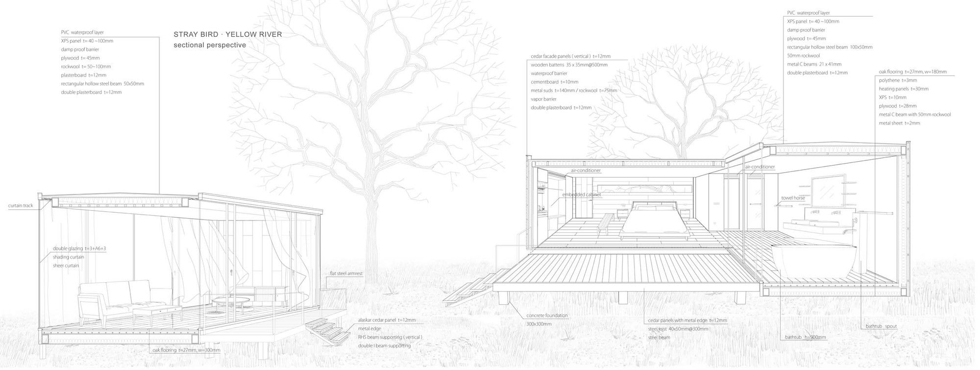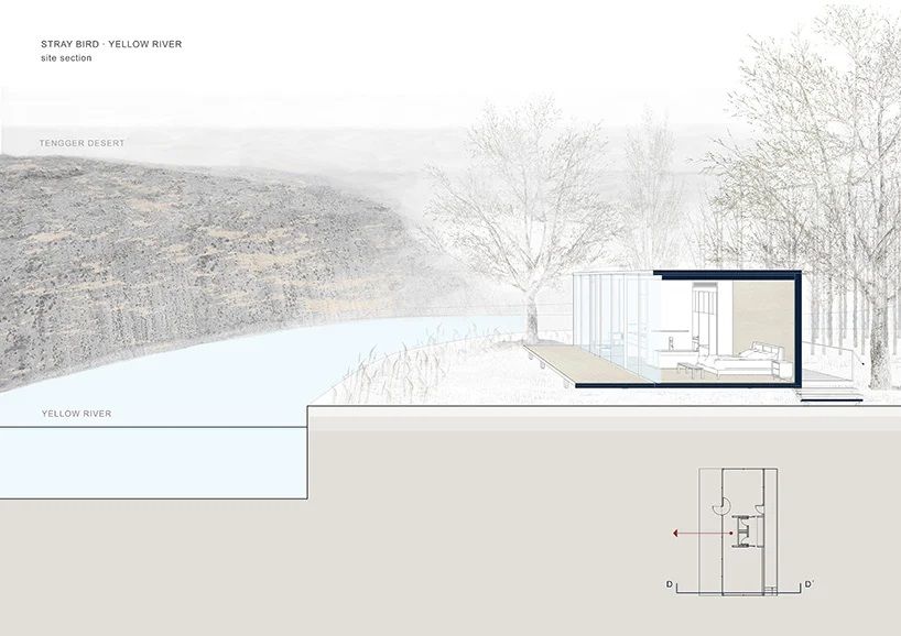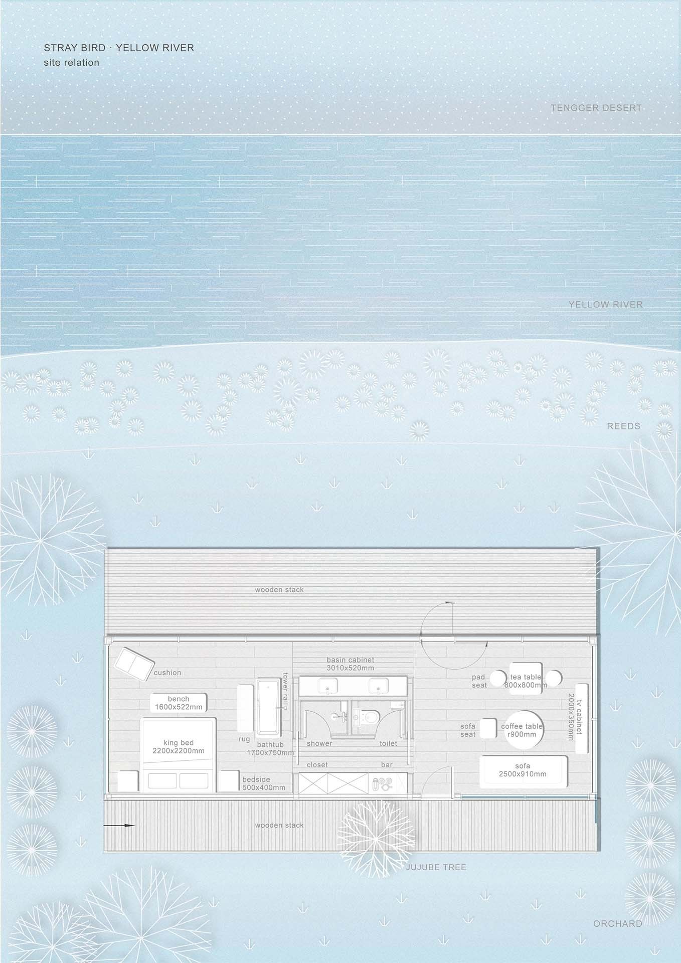 STRAY BIRD invites the Yellow River and deserts into space by the interplay of transparency. It blurs the boundaries between architecture and nature while interrogating the traditional means of construction and the separations rendered by layers of solid walls. For STRAY BIRD, the absence of structure and material is fashioned for the appreciation of the grand landscape. The architecture is now filled and imbued with light and air.