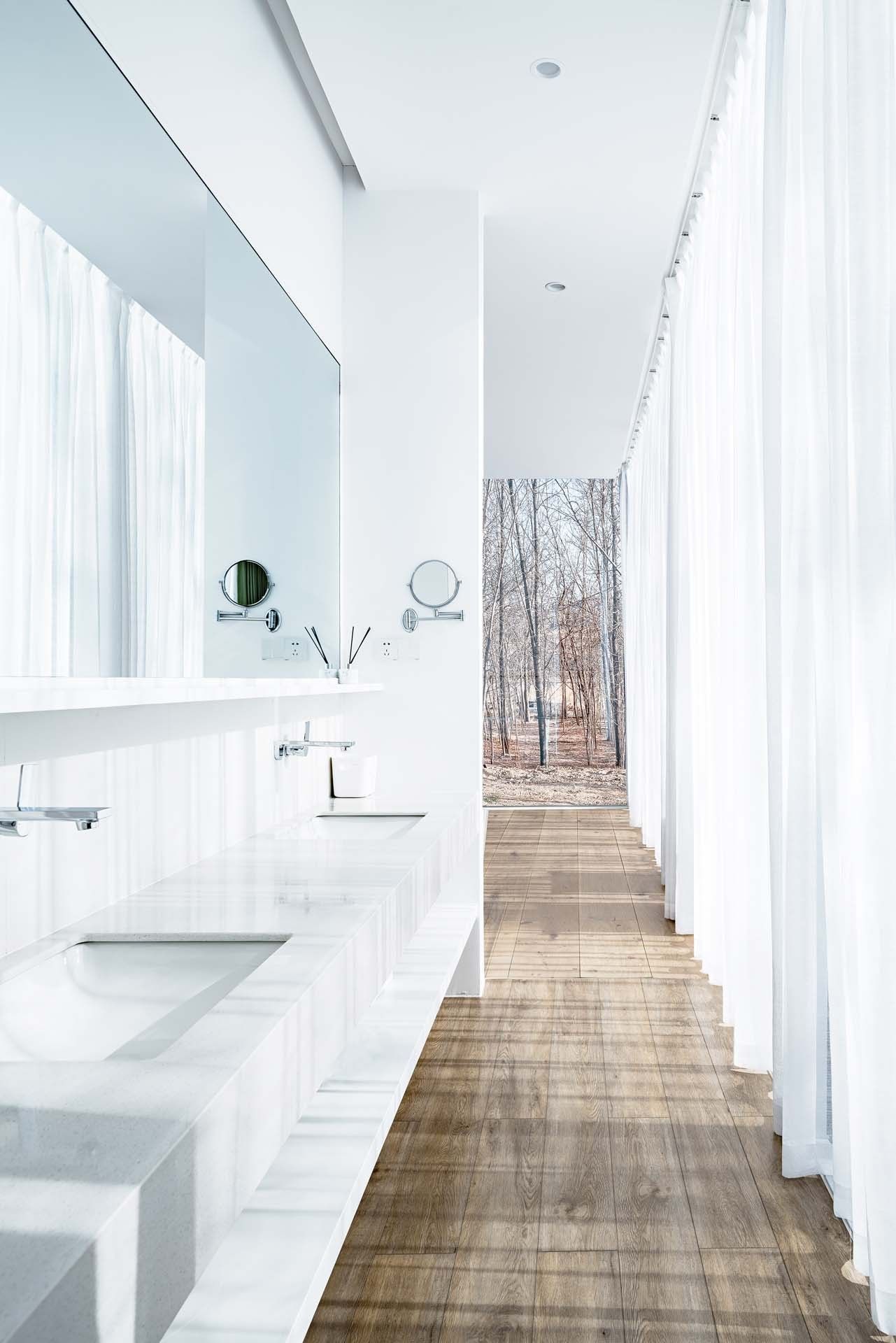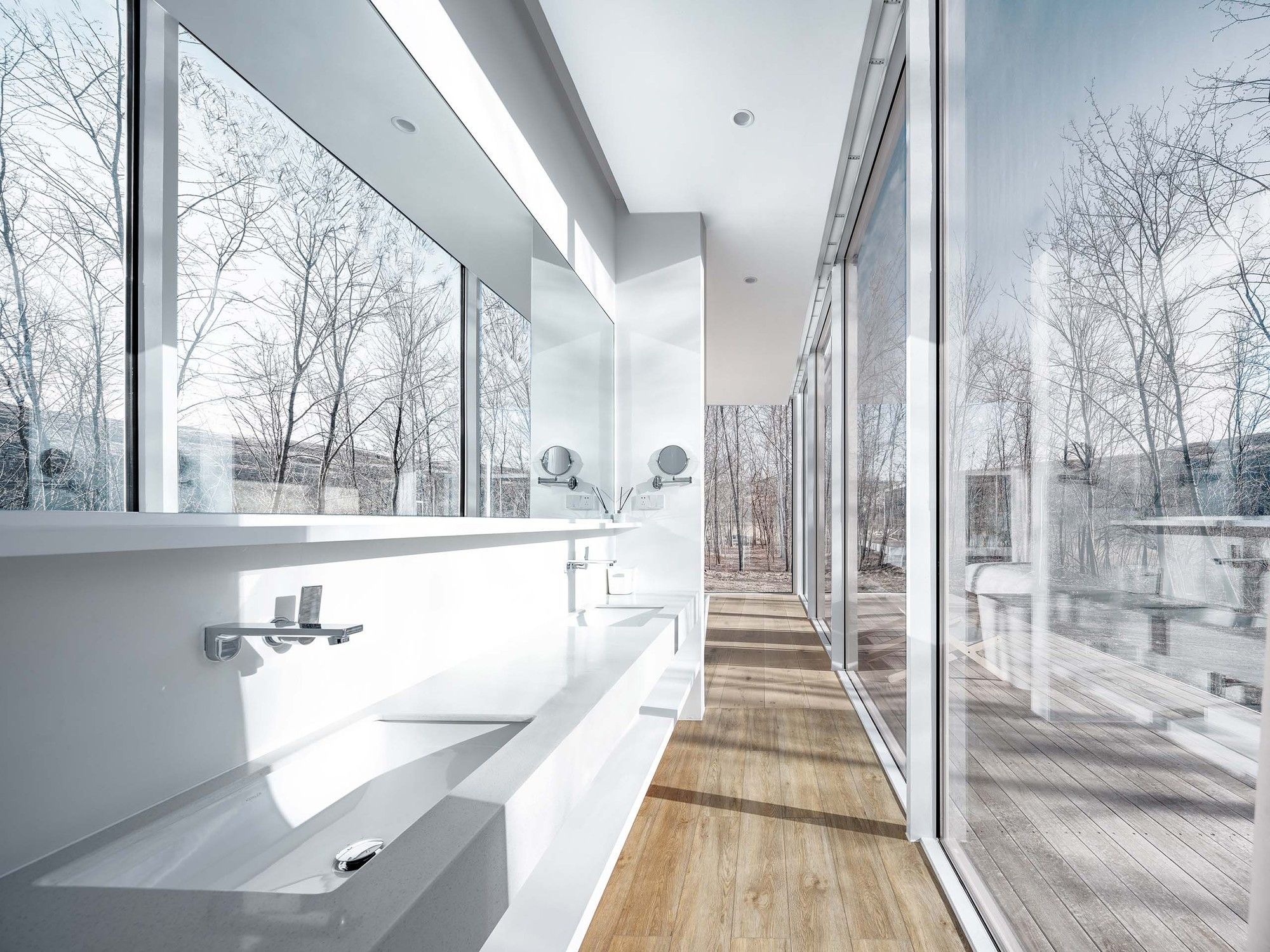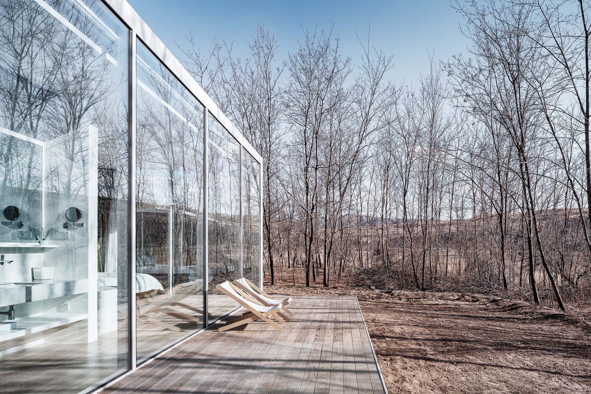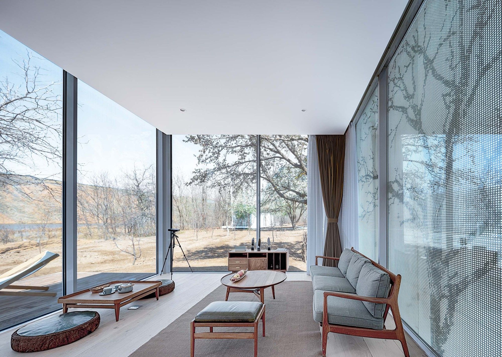 Locating only 10 meters from the Yellow River, pre-fabrication services as both design and construction strategy, providing varied solutions to most all the challenges and difficulties for building in rural, western China. Taking transportation constraints and structural limitations, all into consideration, the design was finalized in modules of a 14m*4.5m steel frame format, with sophisticated interior details and finishes, along with a unique entrance deck and front-terrace. Three-sided Low-E glass curtain wall system is introduced, given that architecture is regarded as the medium between living conditions and the grandeur of nature.