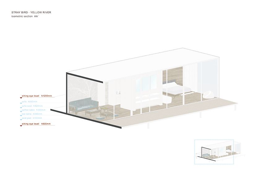 As a holiday resort place, STRAY BIRD focuses on conditions for relaxation and leisurely experiences. According to the definitions of spatial events and actions of the body; space is therefore divided into three distinct programmatic zones as sitting, standing, and sleeping. Both sleeping and sitting are considered as the most desired experiences, which are placed at the corners of the module on opposite sides, and are surrounded by full-height glazing system and exposures to Nature’s magnificence. At the same time, all practical uses are compartmentalized into a central area, which also makes internal circulation much more efficient.