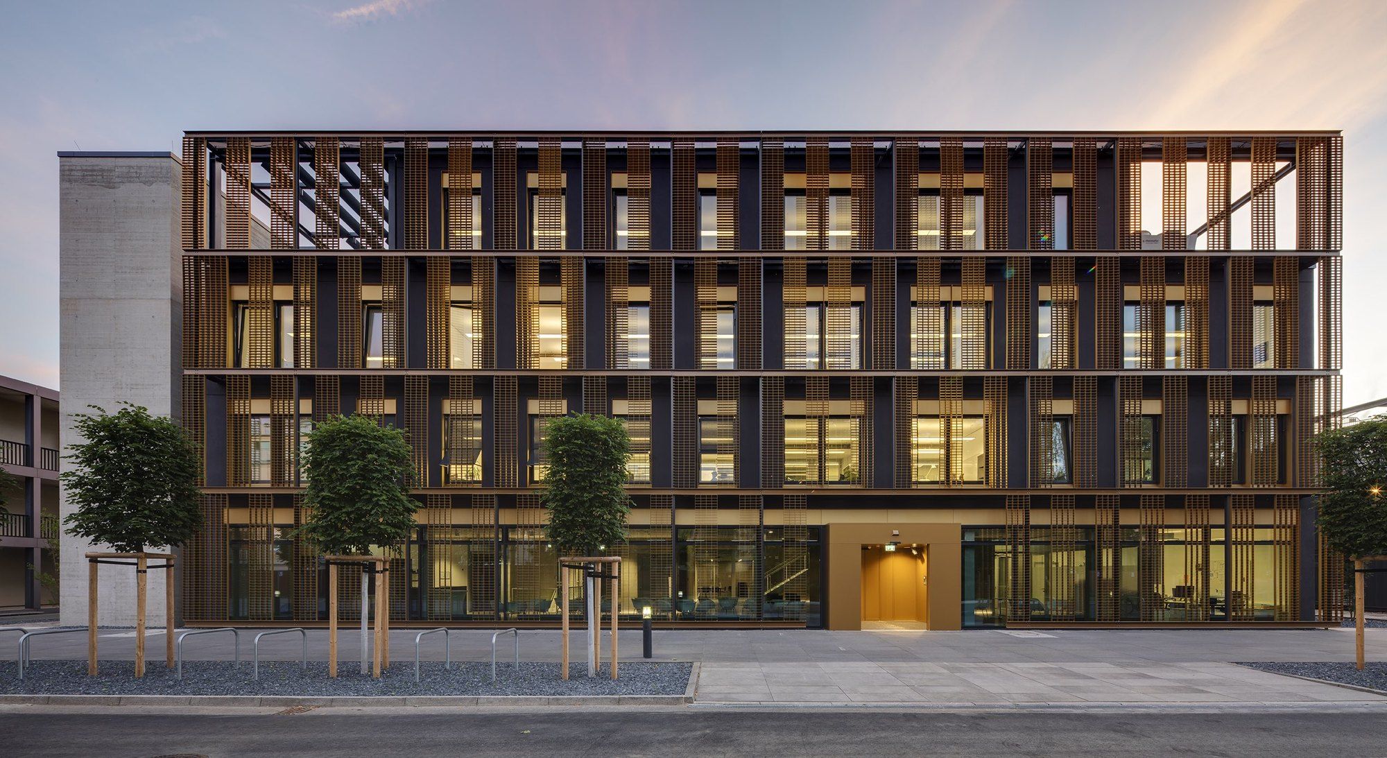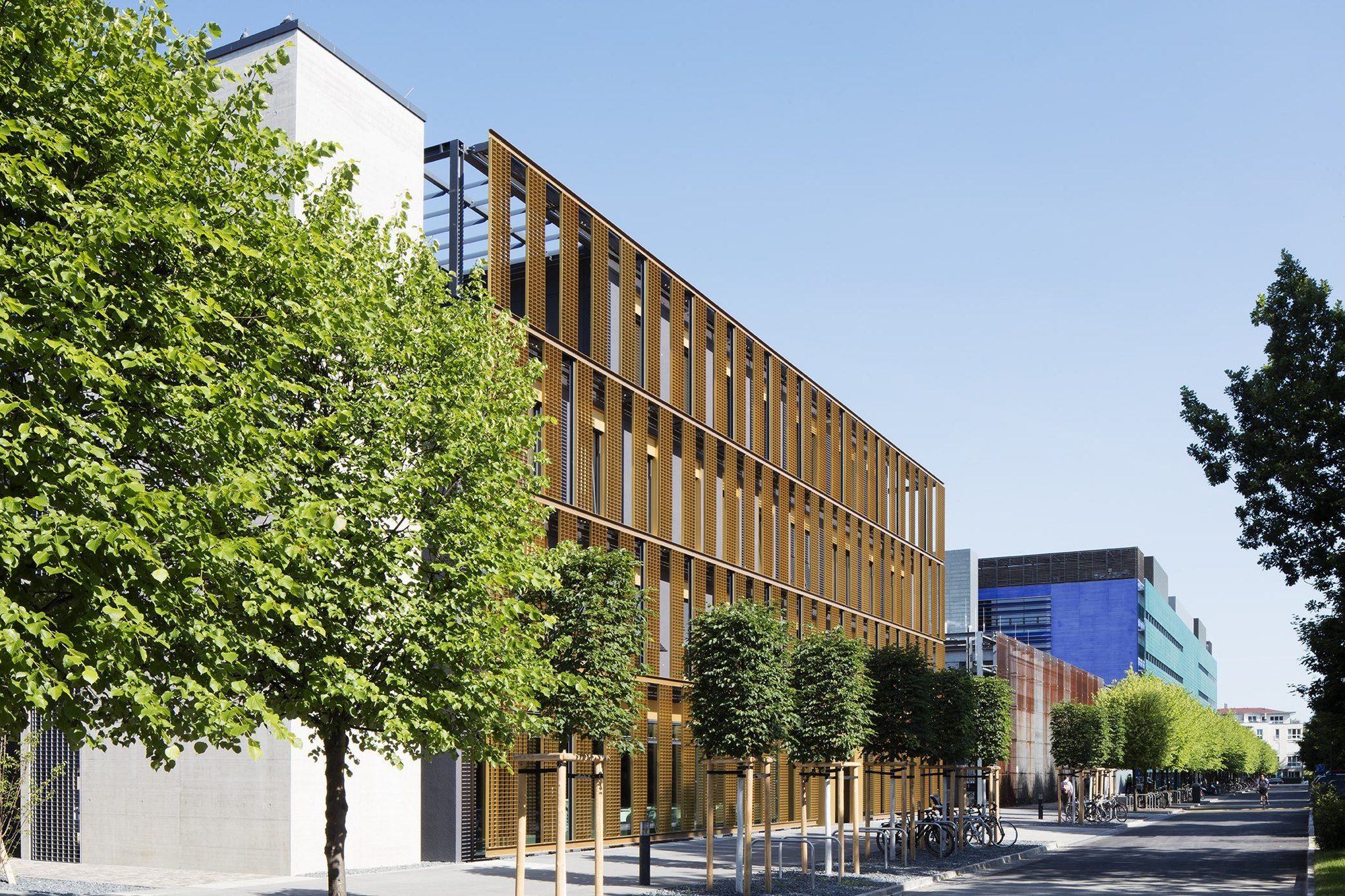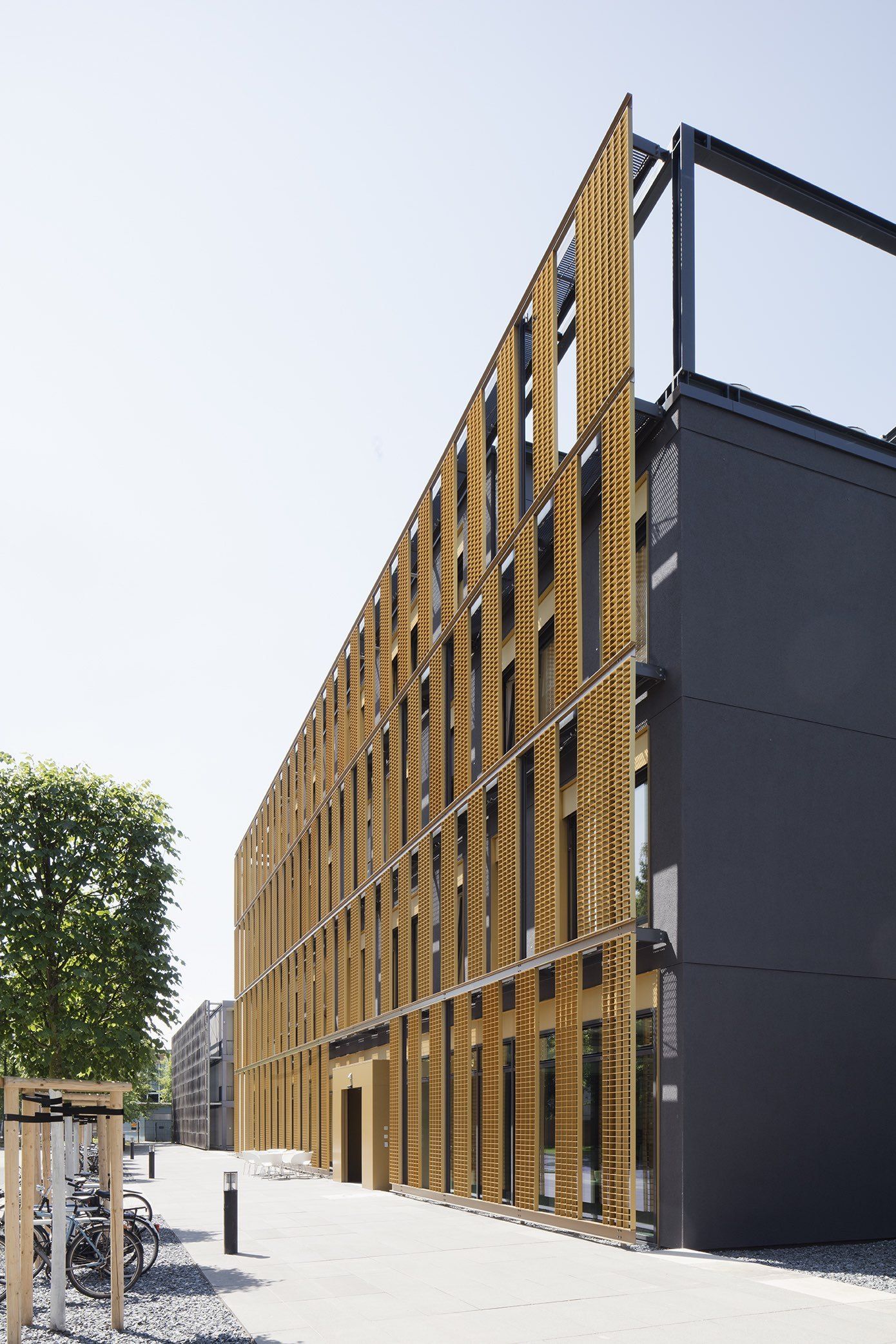 Along the outer perimeter are bright and quiet work spaces where the research work can be completed.The new building follows the urban planning principles for the campus. It is placed in line with the other buildings on the campus and its main façades are protected from excessive sunlight with a double facade. The sun-protection louvers on the façade are yellow anodized aluminium, the dark exterior walls are plastered solid brick, and the building frame is in-situ cast concrete.