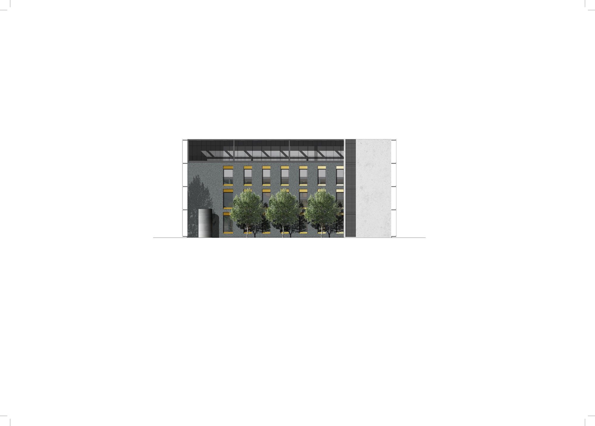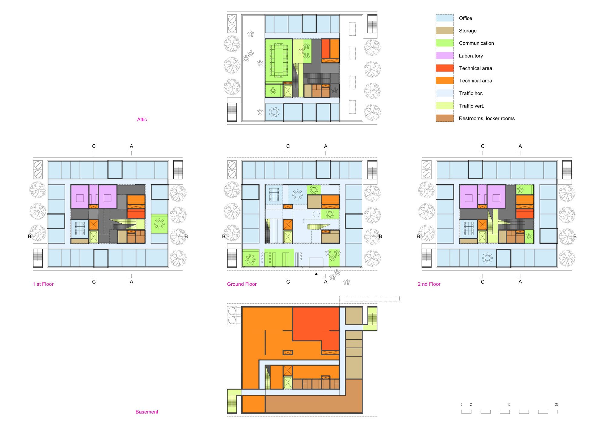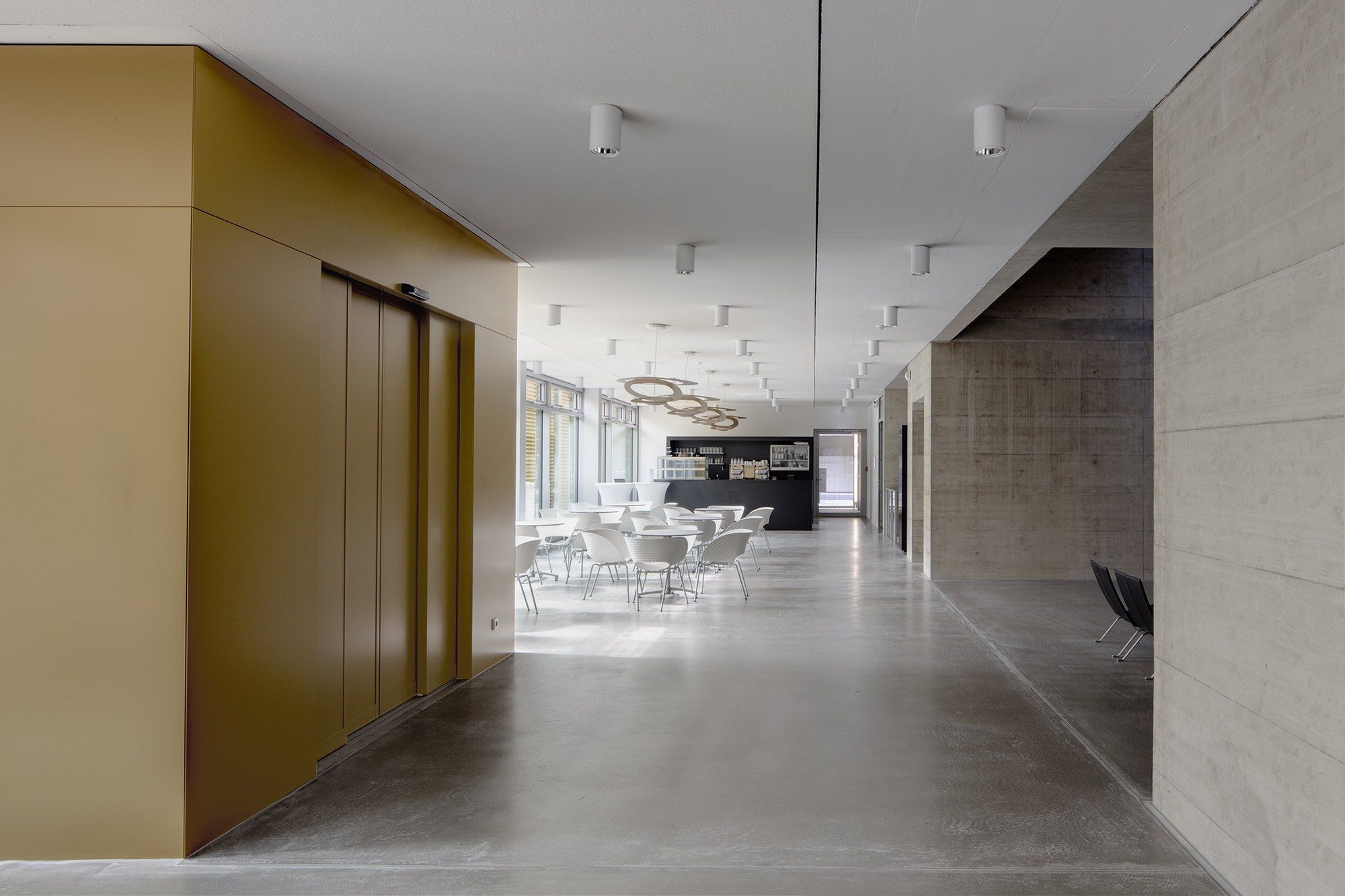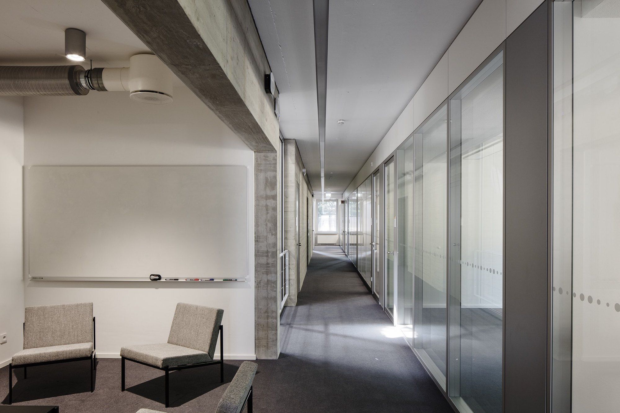 Along the outer perimeter are bright and quiet work spaces where the research work can be completed.The new building follows the urban planning principles for the campus. It is placed in line with the other buildings on the campus and its main façades are protected from excessive sunlight with a double facade. The sun-protection louvers on the façade are yellow anodized aluminium, the dark exterior walls are plastered solid brick, and the building frame is in-situ cast concrete.