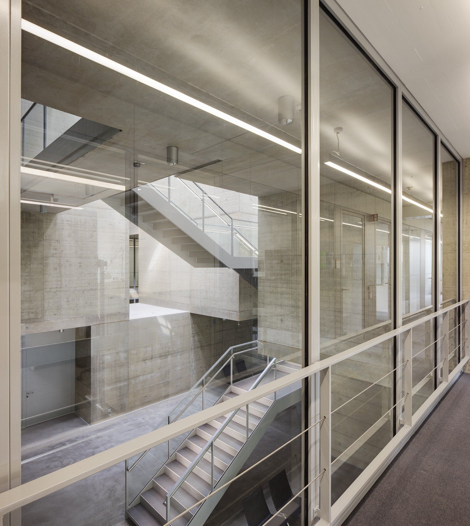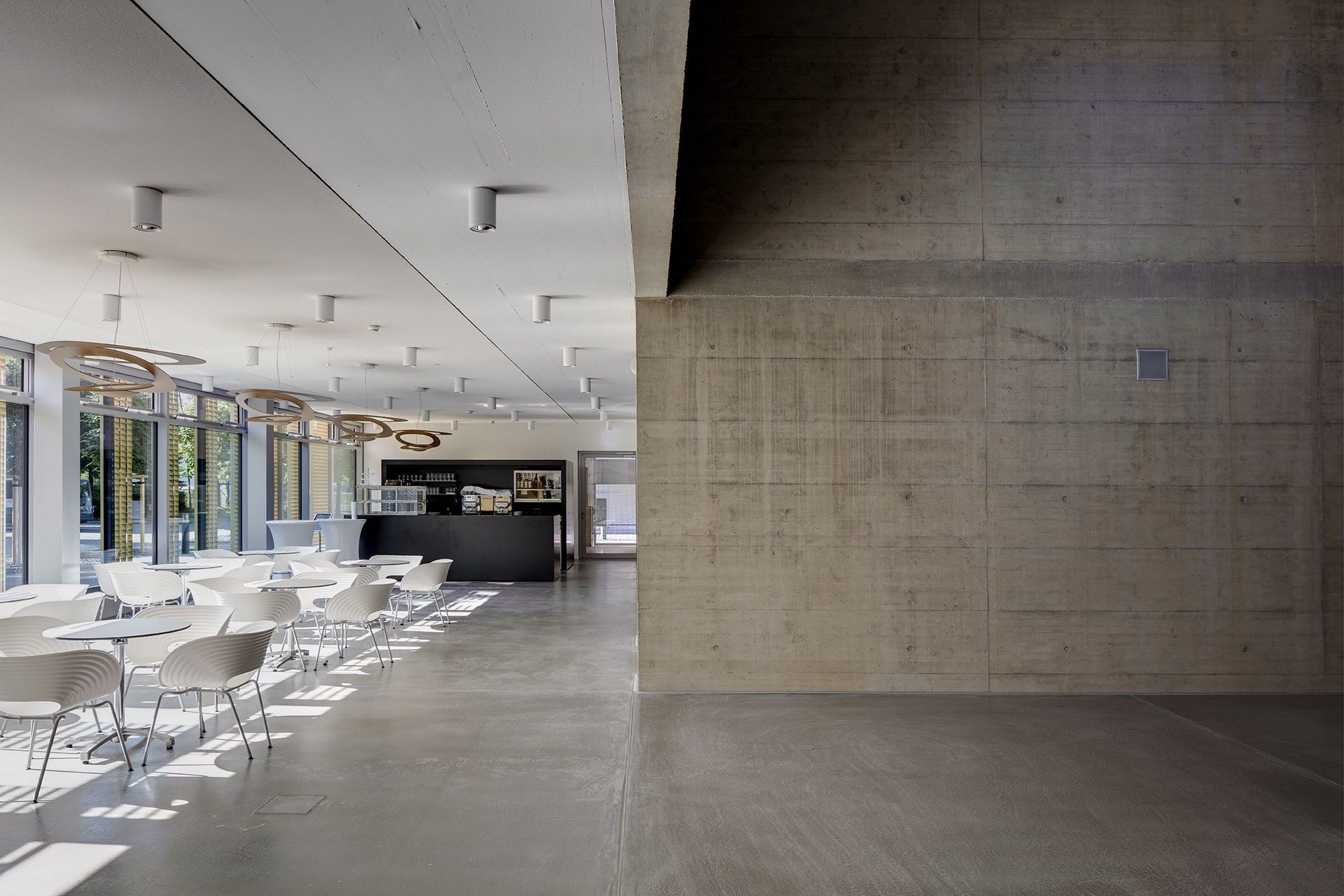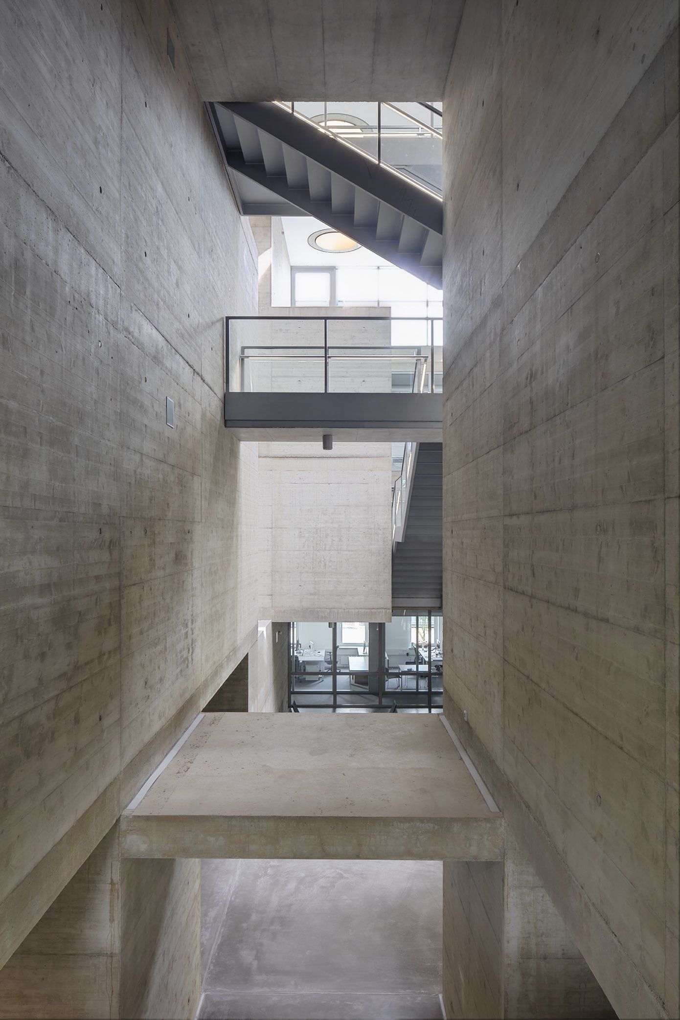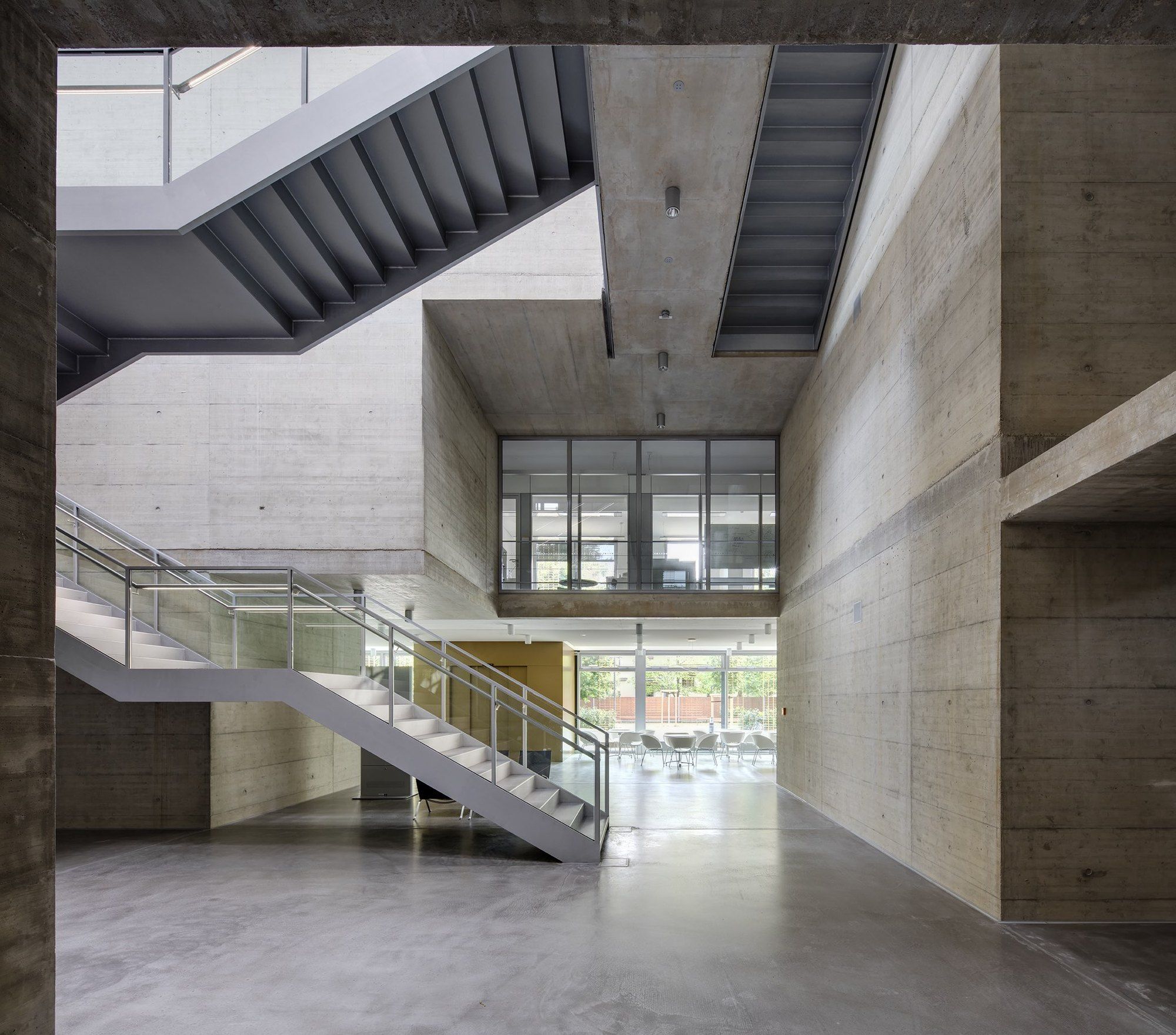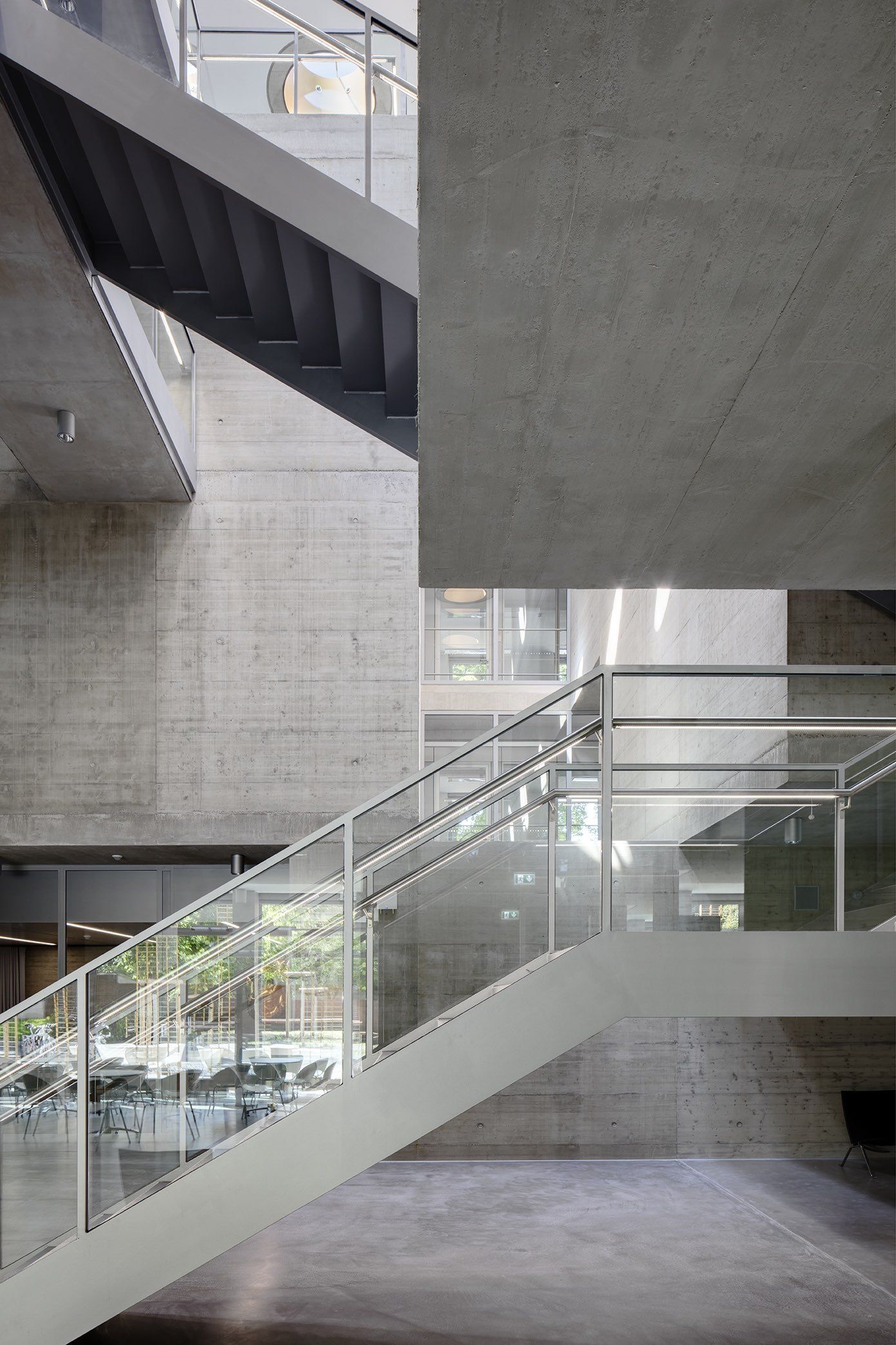 The architecture of the building is itself a metaphor for the positing and solution to a problem. One passes via a complex and dim core towards light and clarity. The concrete labyrinth sets the stage for the encounters and interactions between researchers and provides facilities for scientific experiments.
