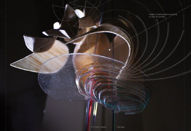 Climate-responsiveness in architecture is usually enabled with the help of electronic sensors, regulating devices and mechanical movements but by researching biological systems, a far more integrated approach is found; the responsive capacity being ingrained in the inherent qualities of the material itself.