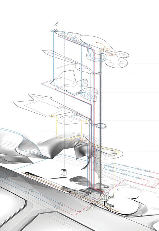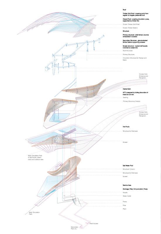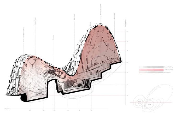 Two main issues of the site are addressed; 1. the expanding urban heat island, the increased temperature in Taipei caused by dense transport infrastructure around the mainstation and 2. the complete disconnection between the river and the city by a 10m tall buffer wall installed to protect the city from flooding. The response to these issues include removing the existing buffer wall and replacing it with a landscape able to respond to varying levels of water. The landscape filters the water from River Danshui and the water is used to extract redundant heat from existing underground transport infrastructure, constructing an environmentally sustainable system directly influenced by the varying levels of water and the heat produced by the flow of people through the site. The heated water is used with a heat exchanger to warm up water for the pools in the bath, the steam areas and saunas.