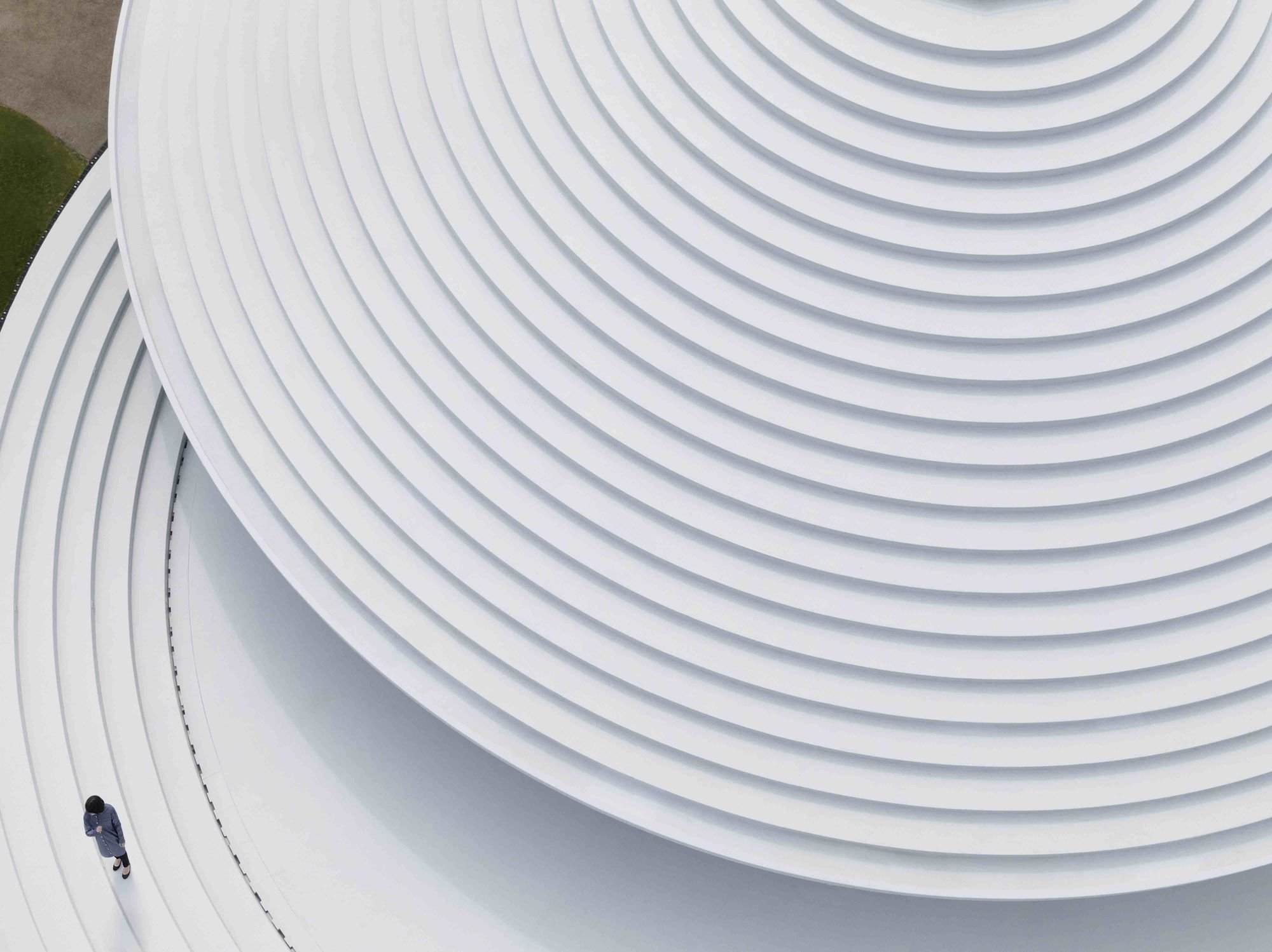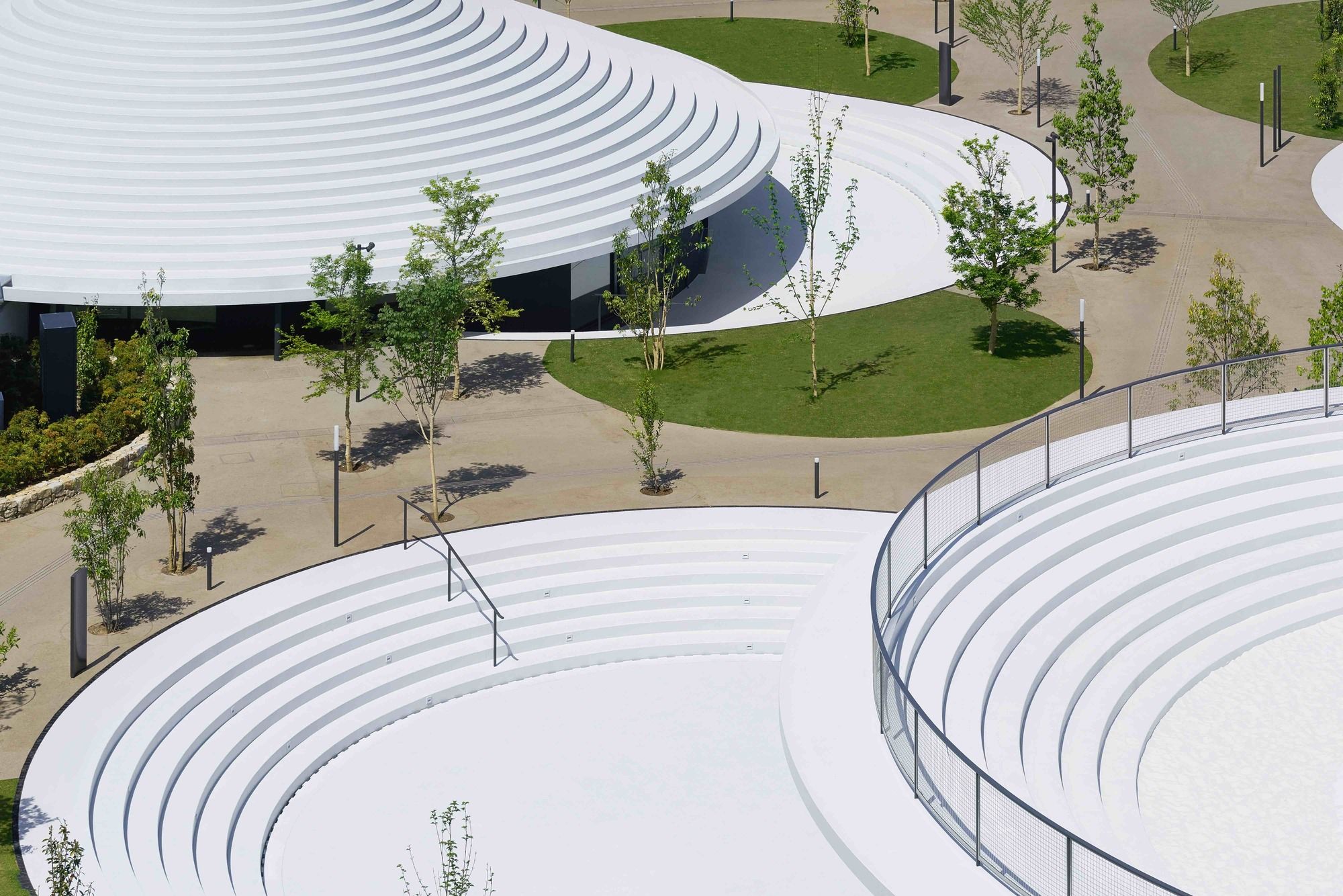 The construction technique used to create the plaza’s round cofun structures consisted of fitting together pieces of a precast concrete mold resembling a huge pizza. Because precast concrete molds are formed at the factory and then assembled onsite, the resulting structures are precise and the same mould can be used multiple times, ensuring excellent cost-performance. The pre-formed parts are pieced together like building blocks using the same massive cranes used to build bridges. Large spaces can be formed without the use of columns or beams, and because of the round shape, the well-balanced structures offer stability against forces applied from any direction.