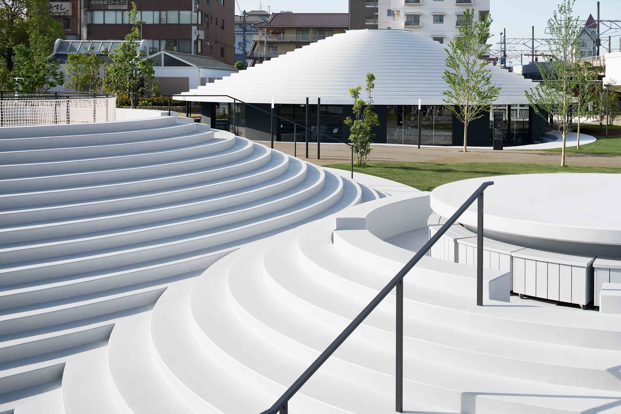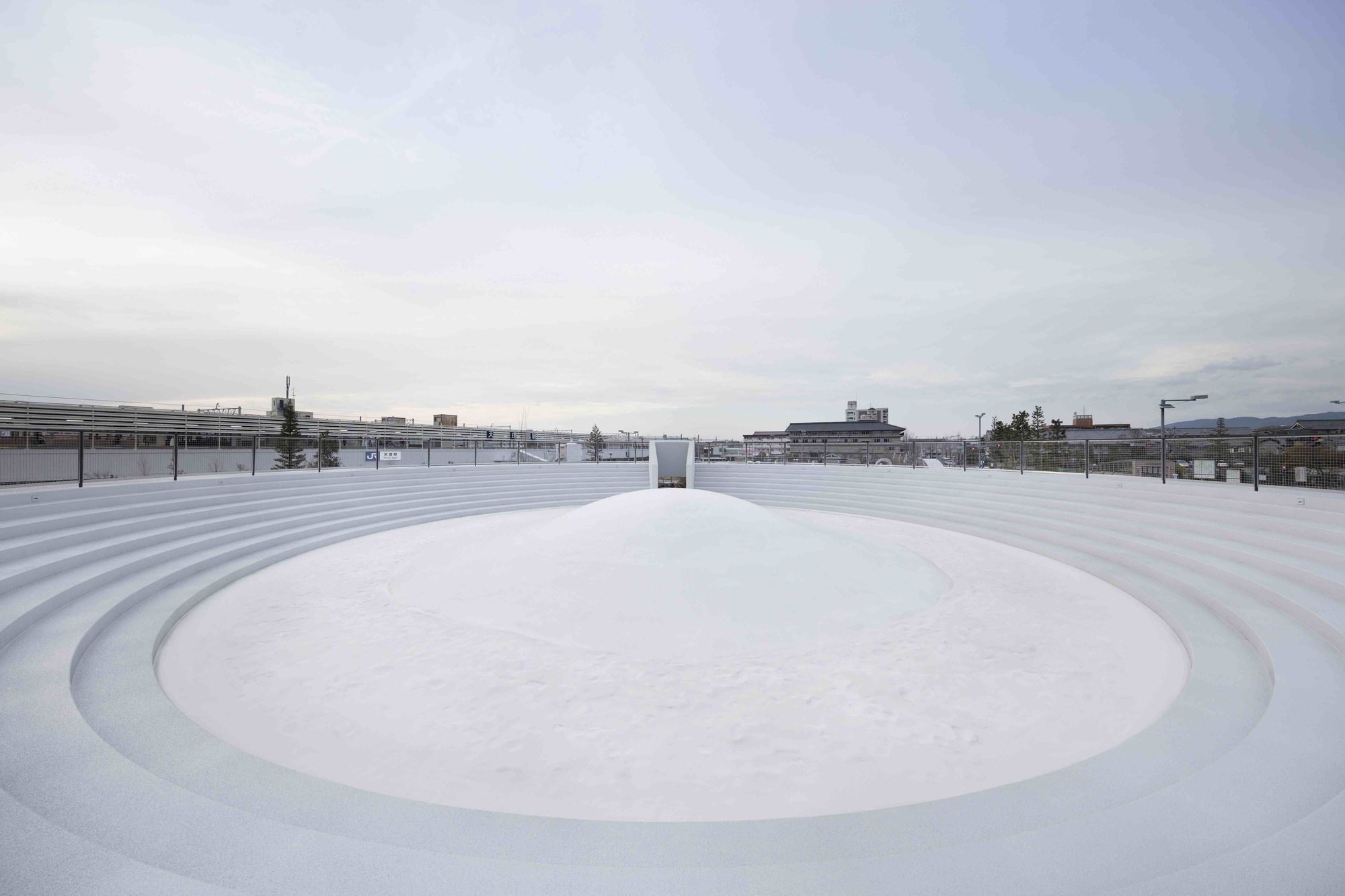 Tenri’s urban boundaries include a number of ancient Japanese tombs, known as “cofun”. The cofun are beautiful and unmistakeable, but blend into the spaces of everyday life in the city. The plaza’s landscape, richly punctuated by several of these cofun, is a representation of the area’s characteristic geography: the Nara Basin, surrounded on all sides by mountains.