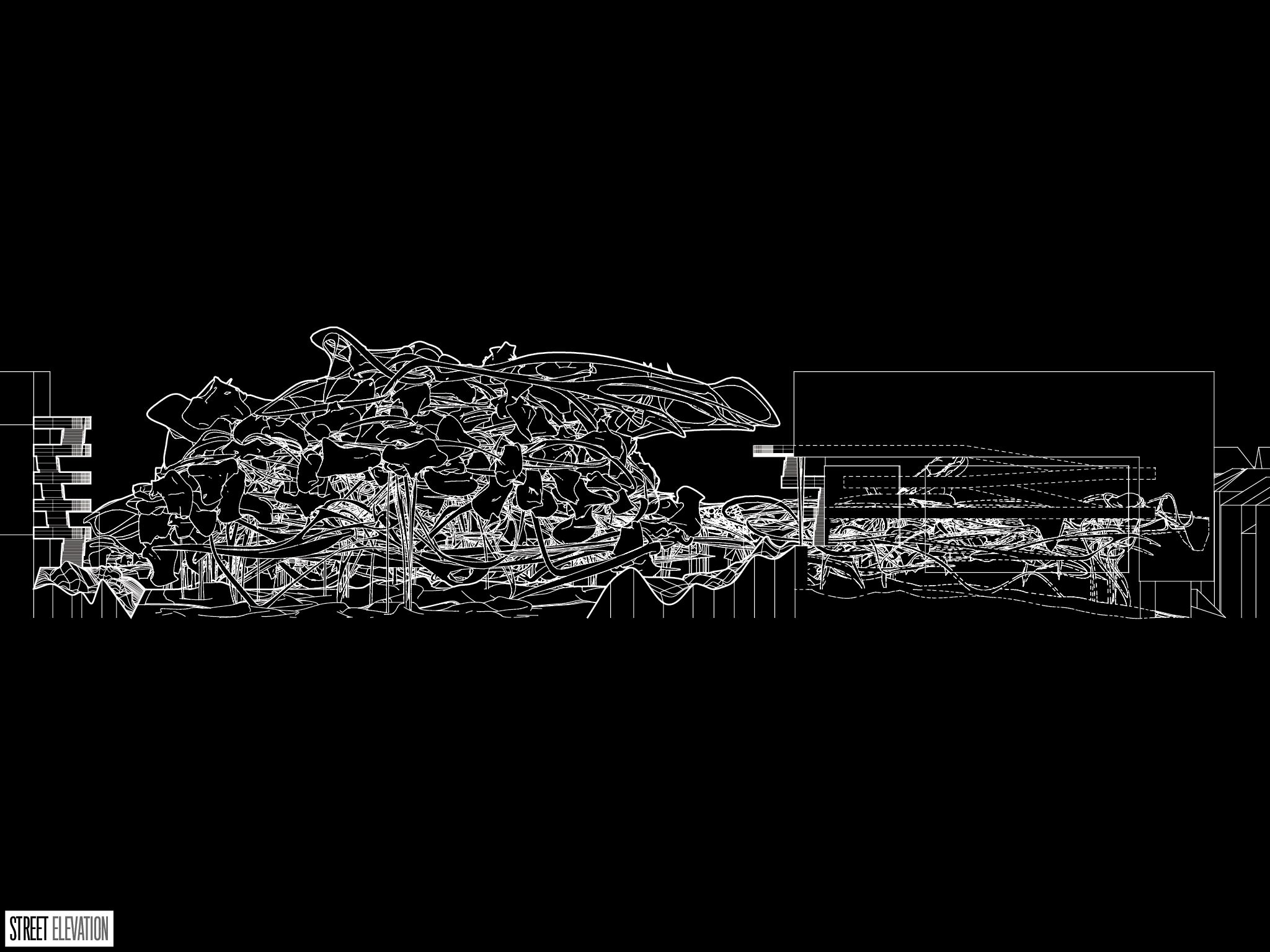 The morphlogical language which was developed during a one year period was used in a series of repetition and mutation in similar scales that lay in a warped grid and in a such array in section so that the Lazarus church becomes a focal point for a visual relationship.