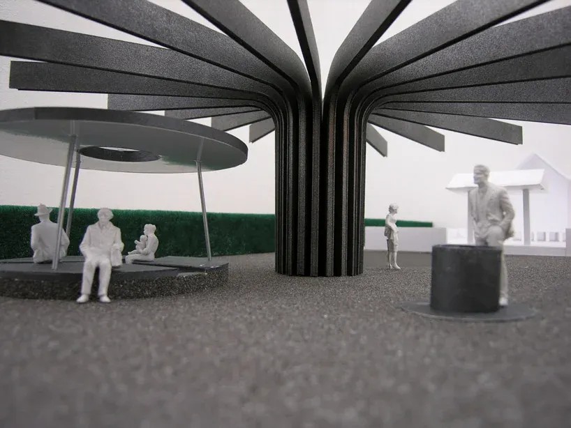 One of the most entertaining things is reading descriptions of projects and then looking at project images. You read exciting phrases such as; “a new type of square where the public is encouraged to experience the city in a totally different way” and “People experience a new activity they never got in the previous town.” But then when we look at the images we see no trace of people or their presence and interaction with the design. Nonetheless, this project, comprised of three different park spaces, is meant to engage people and provide them with new spaces to enjoy and gather in. In site A, people walk around three basins, while in site B, they walk along pipe lines. Site C is centered around a tree-like object.