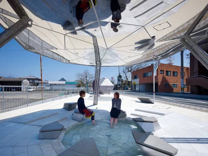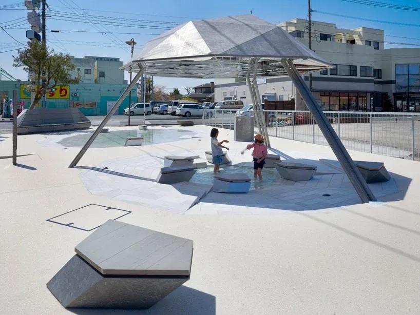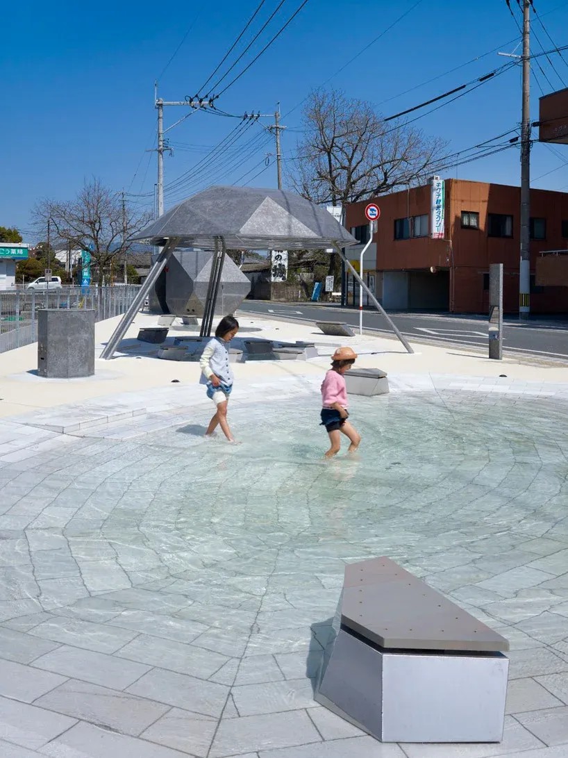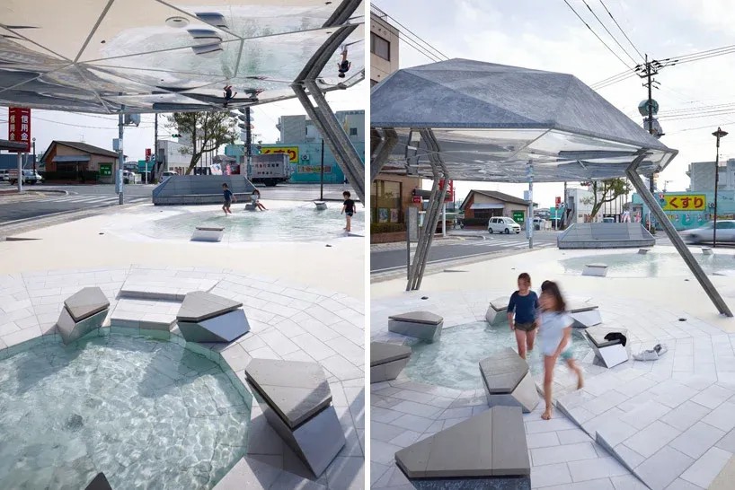 It is a water park using agricultural water way. The motif of three basins is scenery of the puddles where water collected naturally in the ground which became hollow. Pavement where white stone is spread. Public lavatory, bench, and shelter suggest stone and rock. These are like the relation between white sand and the stone of a Japanese rock garden. It is appearance of primitive scenery.
