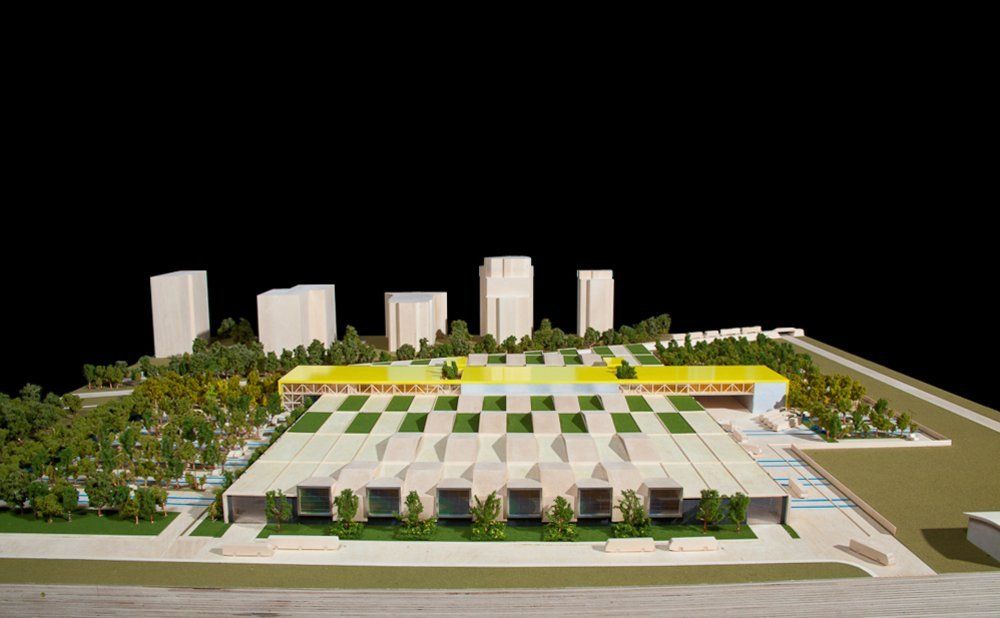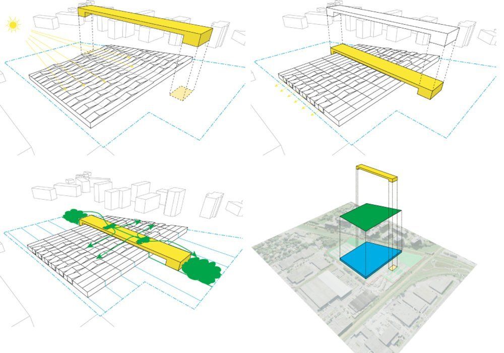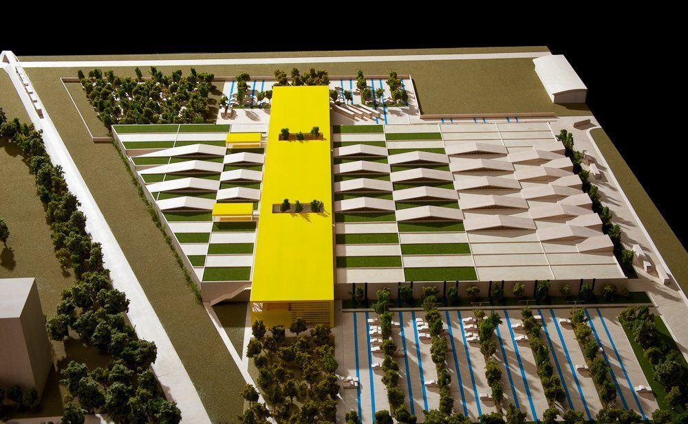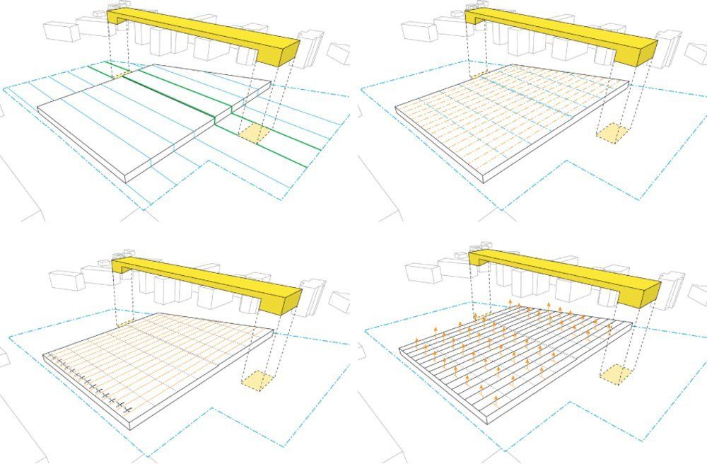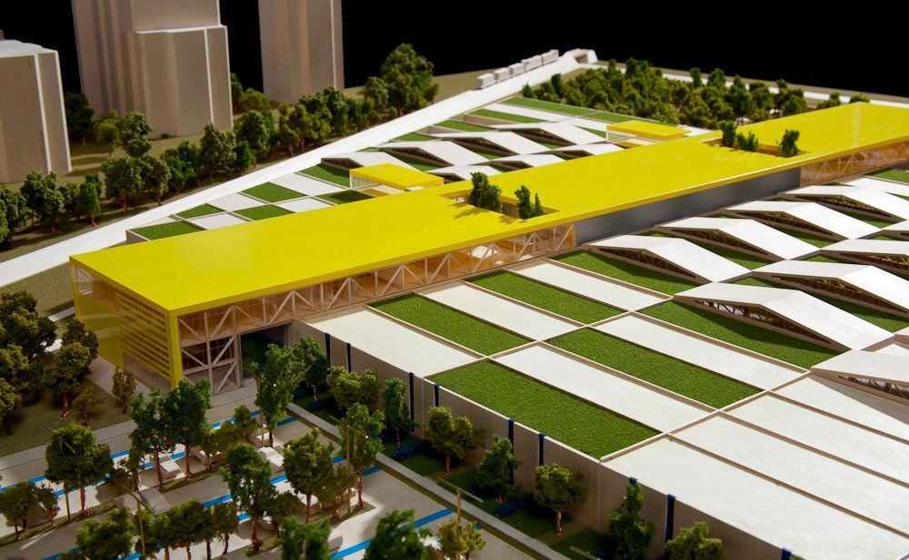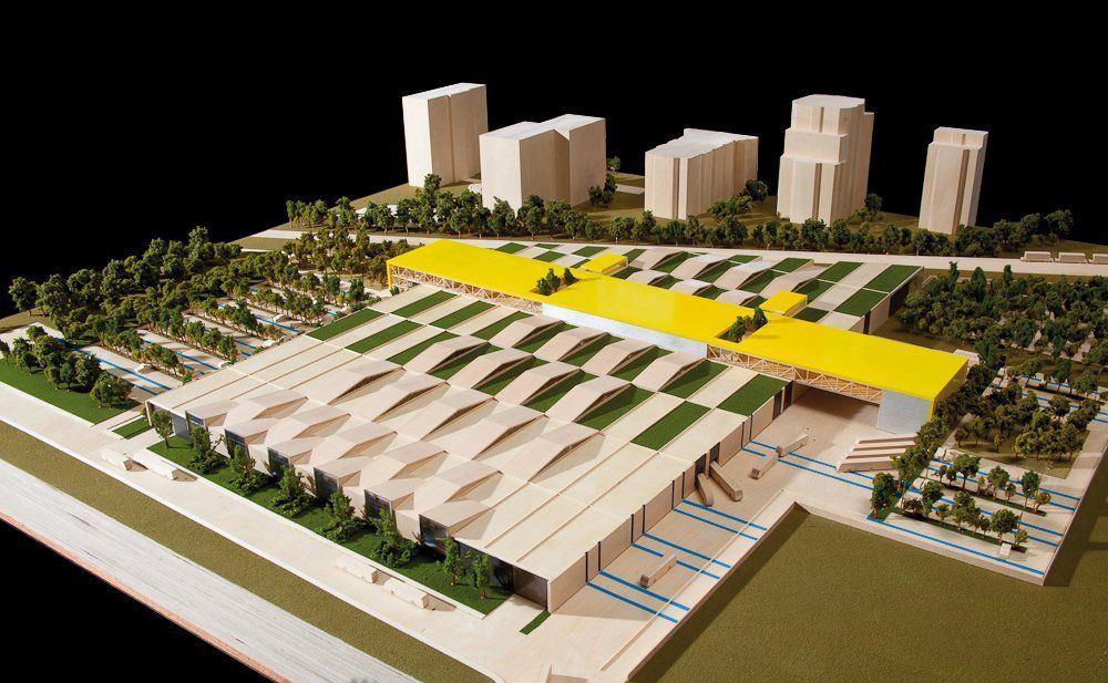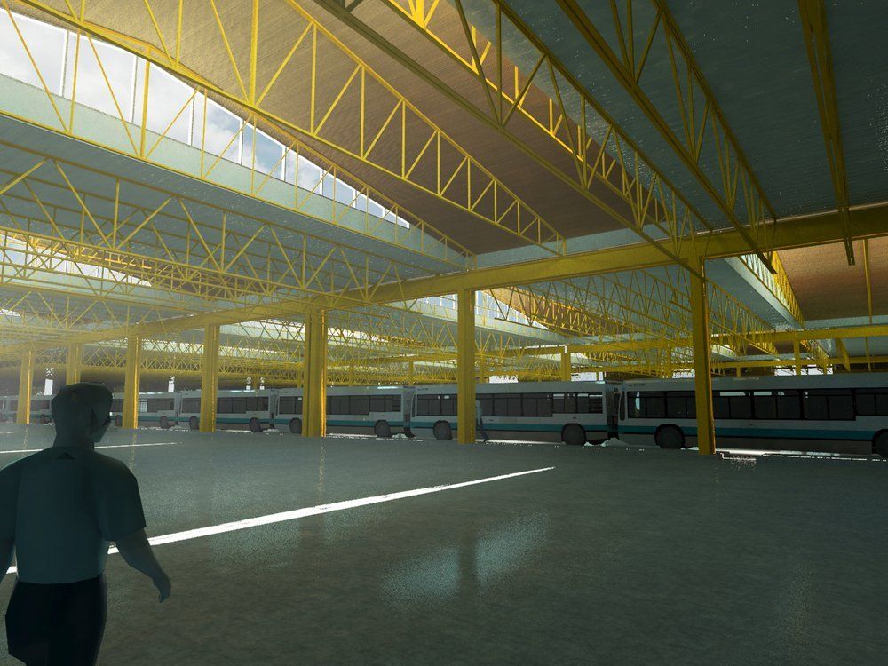 From the urban aspect, to avoid the noise and visual pollution generated by a high concentration of buses, the new building was consequently conceived as an entirely closed structure, covered by a roof of 35,000 m2, or the equivalent of 7 football fields. Then, to improve the view of the neighbors in the nearby high-rise apartment buildings and establish a symbolic dialogue with them, the designers have strewed this immense surface with garden-tapestries and enormous ventilation skylights of about 30 m long shaped like roof trusses, which reproduce the street pattern found in the neighborhood.