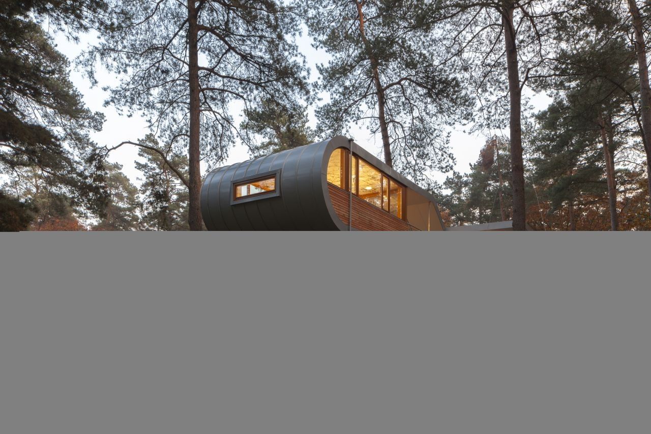 The Tree House winds its way through the trees and is based on five elements consisting of two cabins on different levels, connecting terraces, a staircase and a connecting roof. The lower cabin is designed to be a coffee lounge, pantry, restroom, and technology room so that the upper room is dedicated to housing meetings and other events. The building itself rests on 19 angled steel stilts that are connected to the ground with foundation screws so as to have minimal impact with the environment, and allowing the structure to truly feel incorporated amongst the trees.”