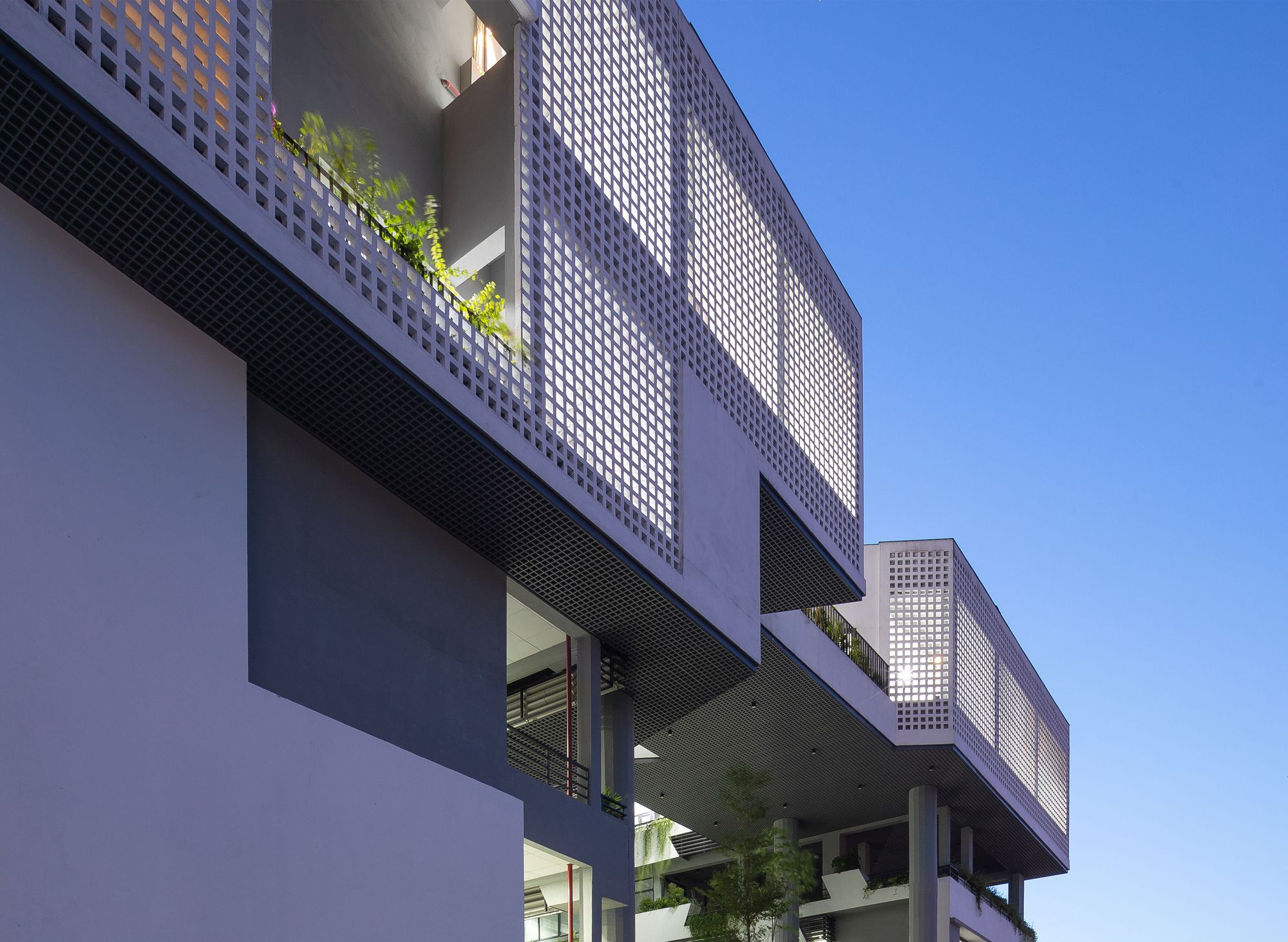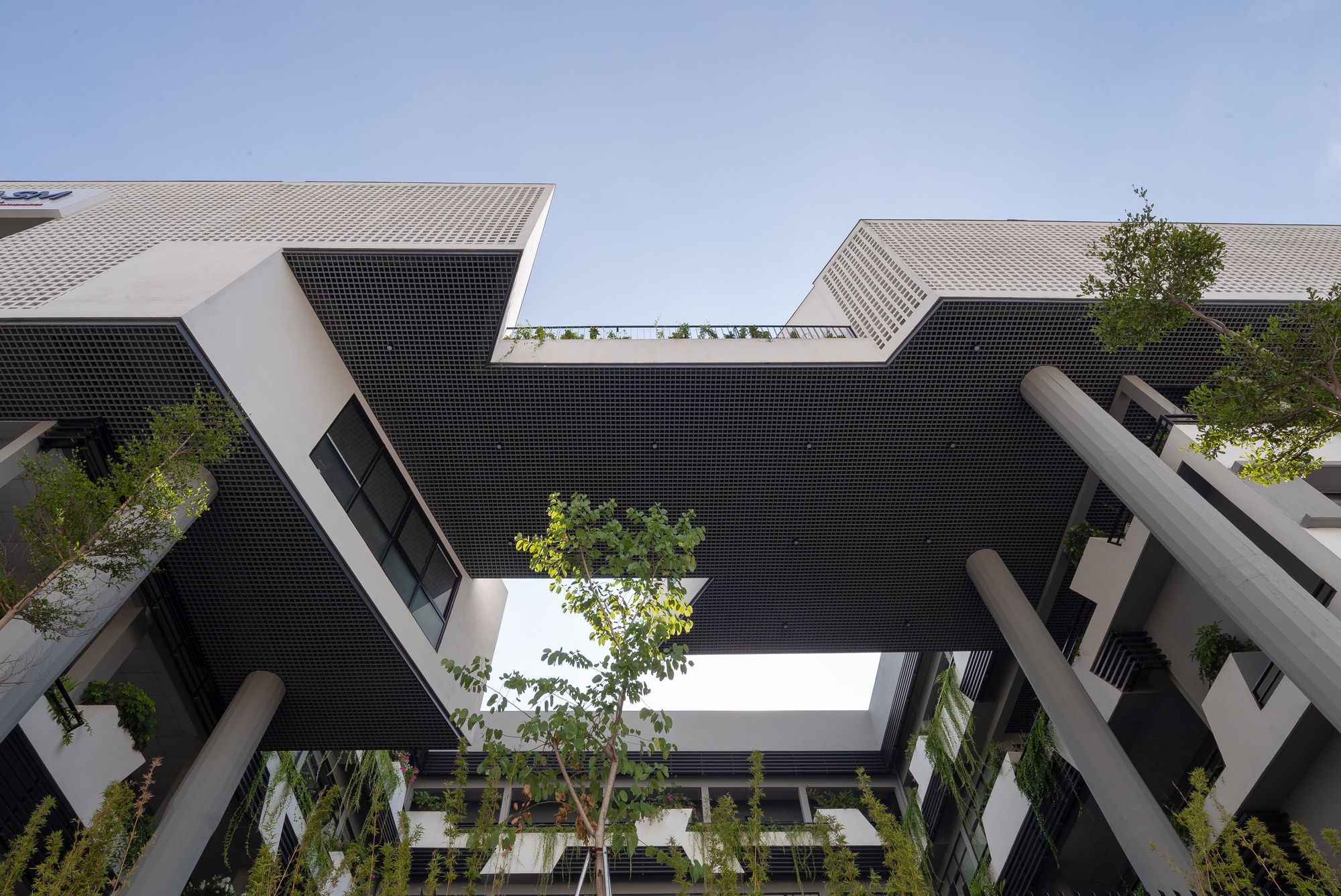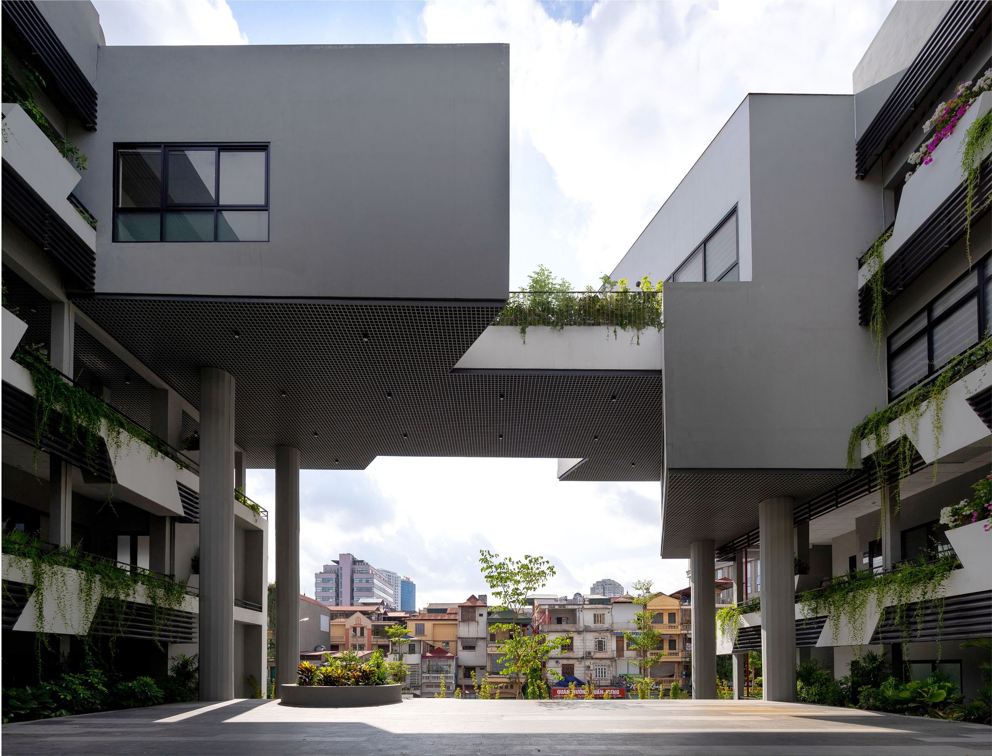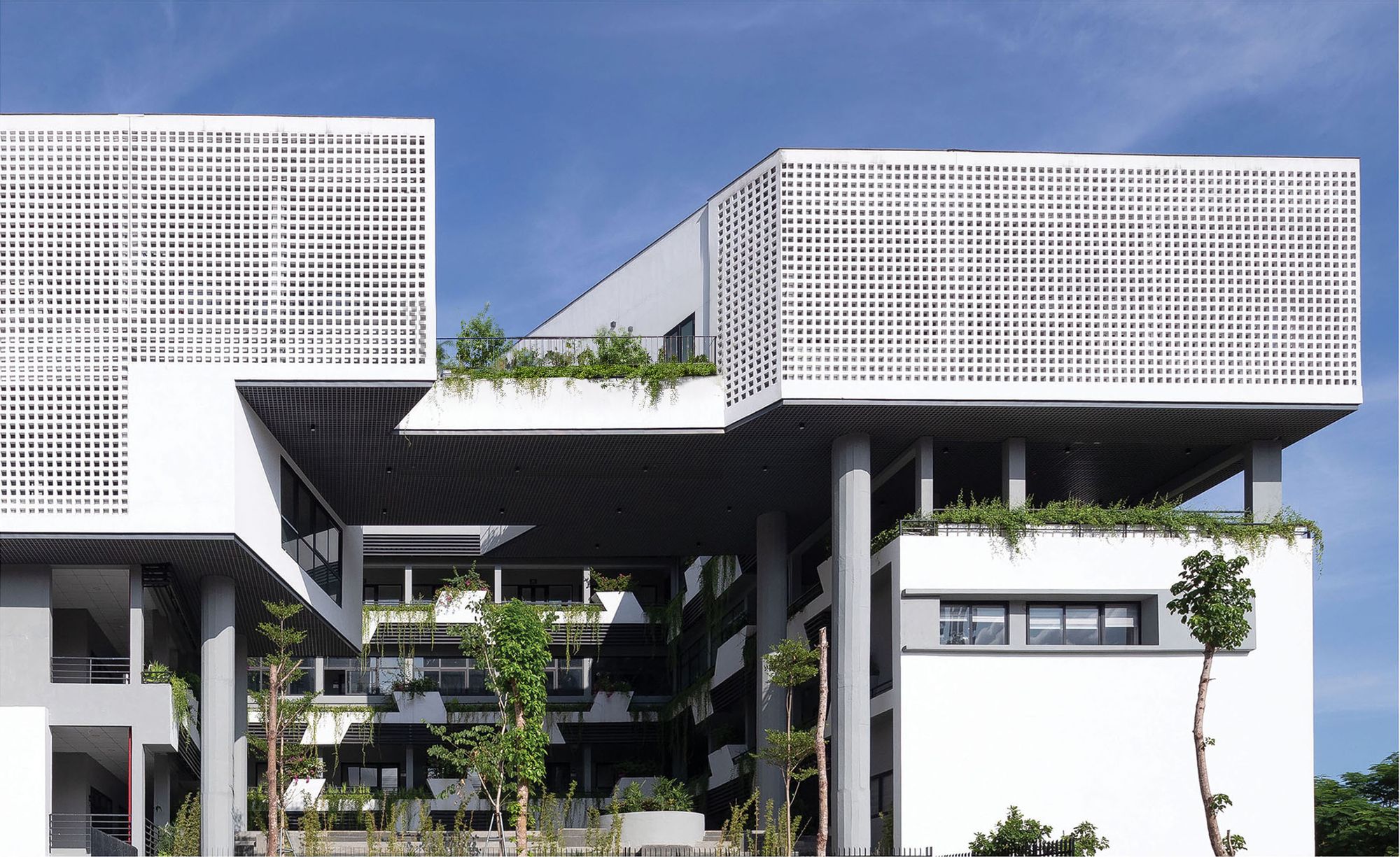 The original courtyard is turned into a multi-functional hall with its new courtyard atop. Given the tropical heat, the Vietnam Institute is consistently adorned with a double skin in all its facades, giving visual hooks and contrasting details of light, shadow, tree, wind, and bird. The idea is to enable a liberal and inspiring environment by being one with nature.