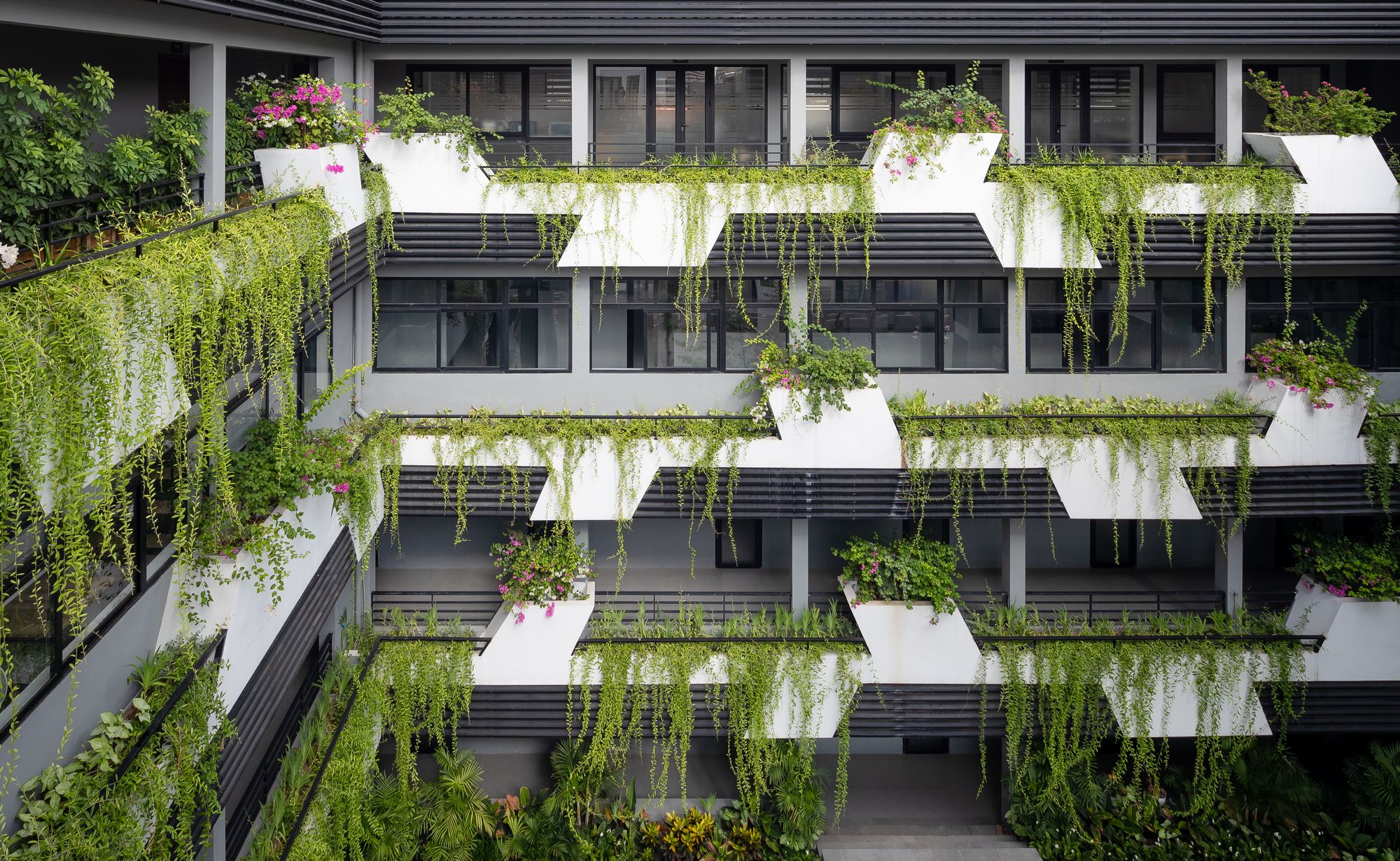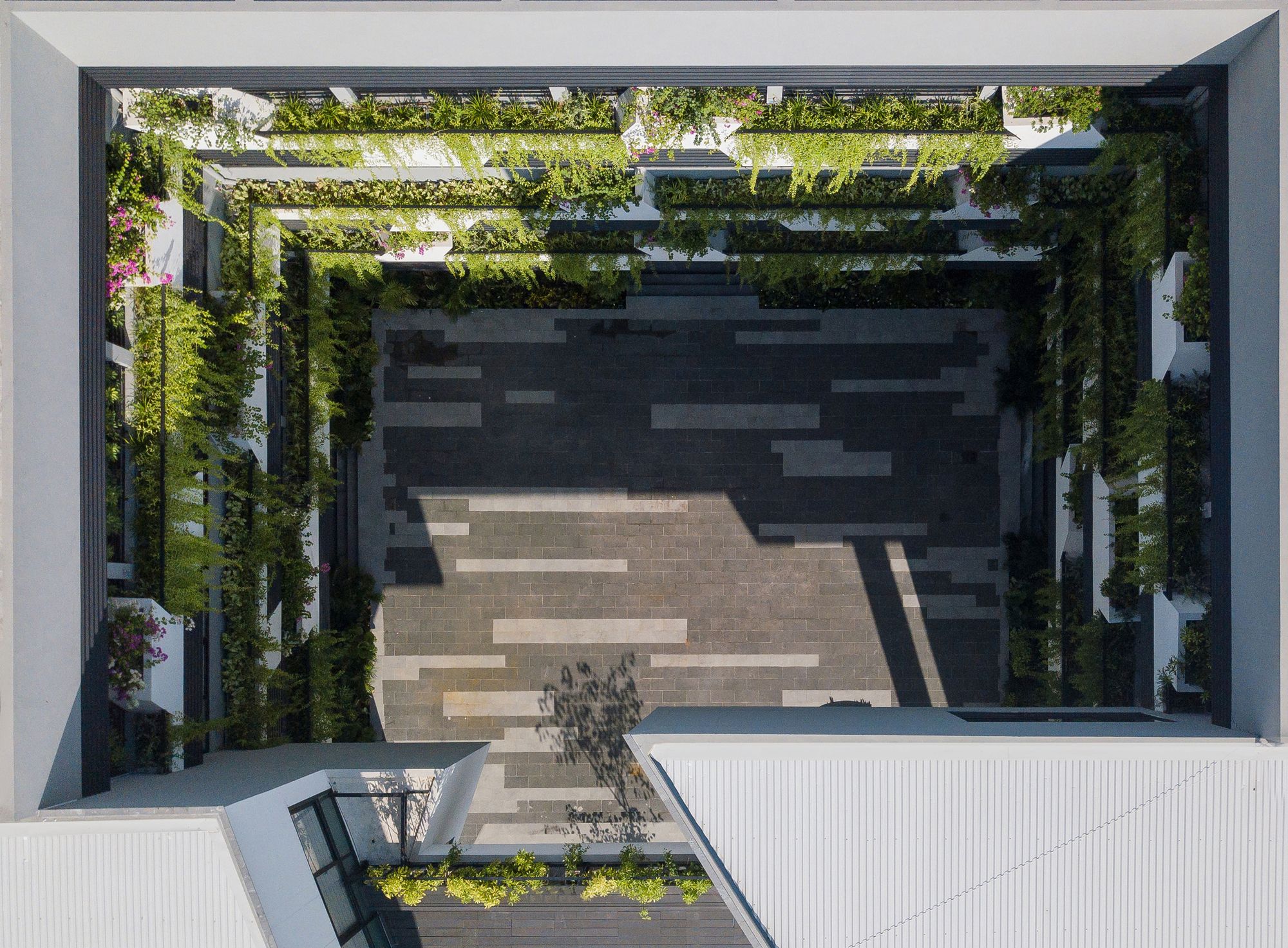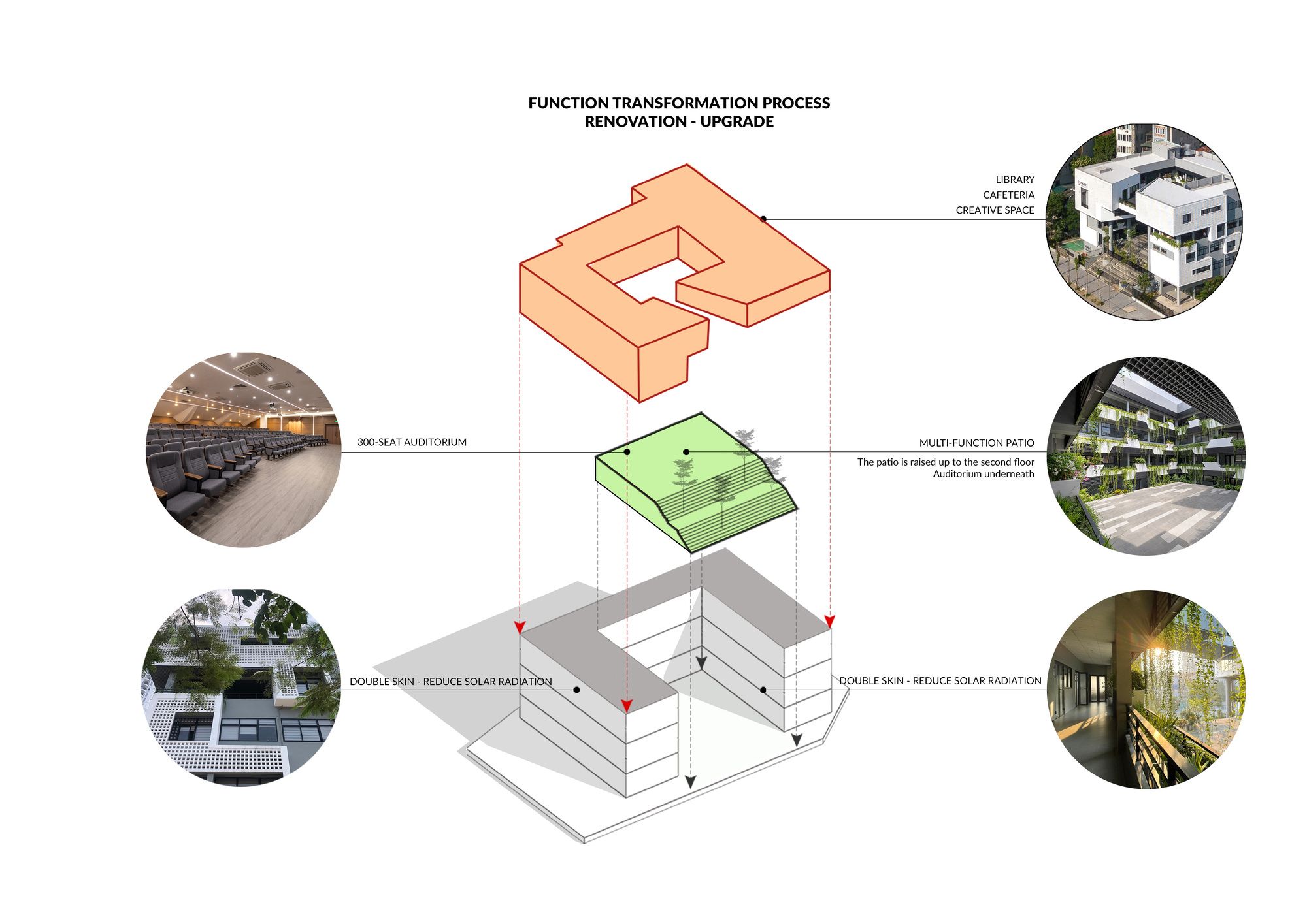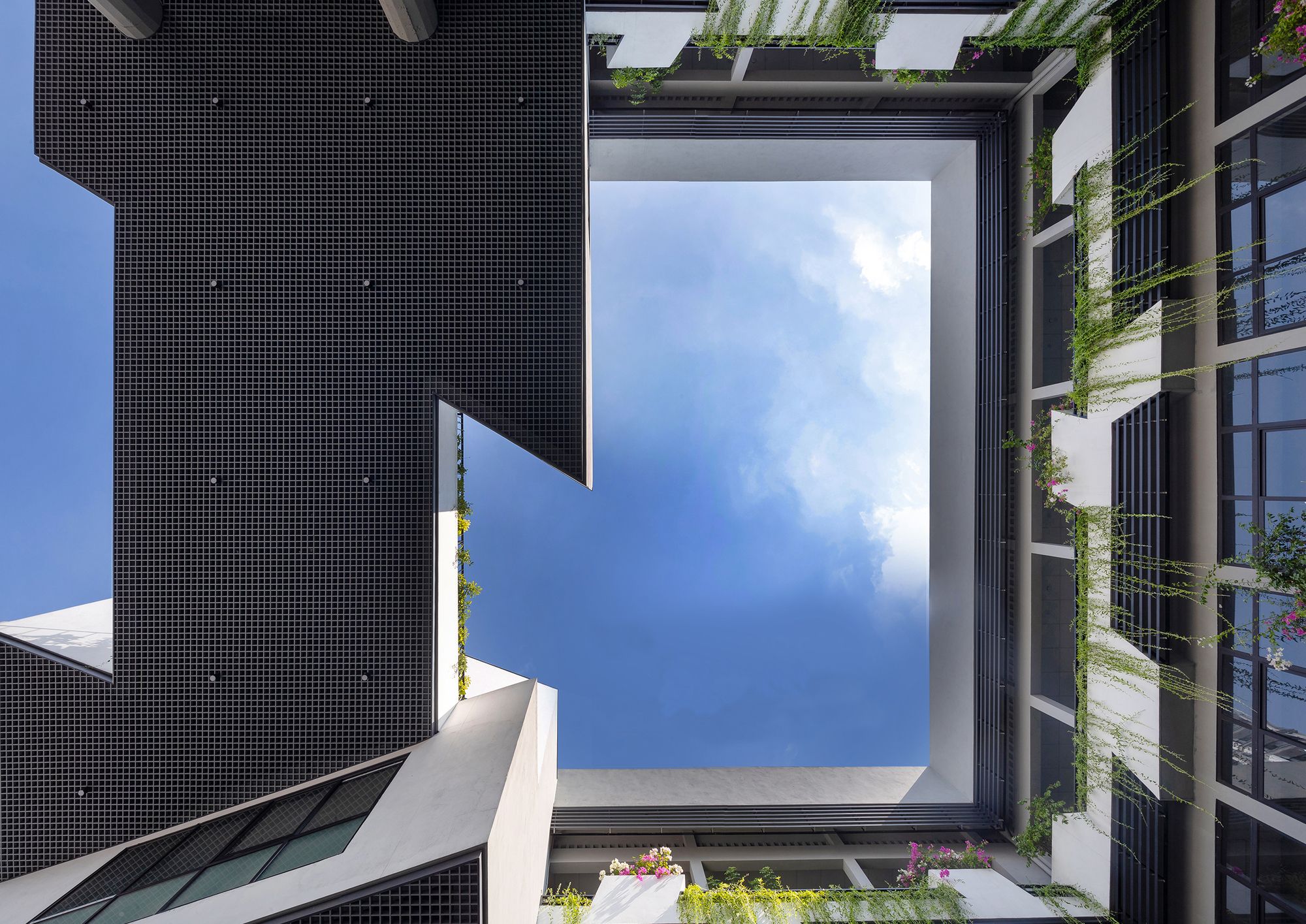 The original courtyard is turned into a multi-functional hall with its new courtyard atop. Given the tropical heat, the Vietnam Institute is consistently adorned with a double skin in all its facades, giving visual hooks and contrasting details of light, shadow, tree, wind, and bird. The idea is to enable a liberal and inspiring environment by being one with nature.