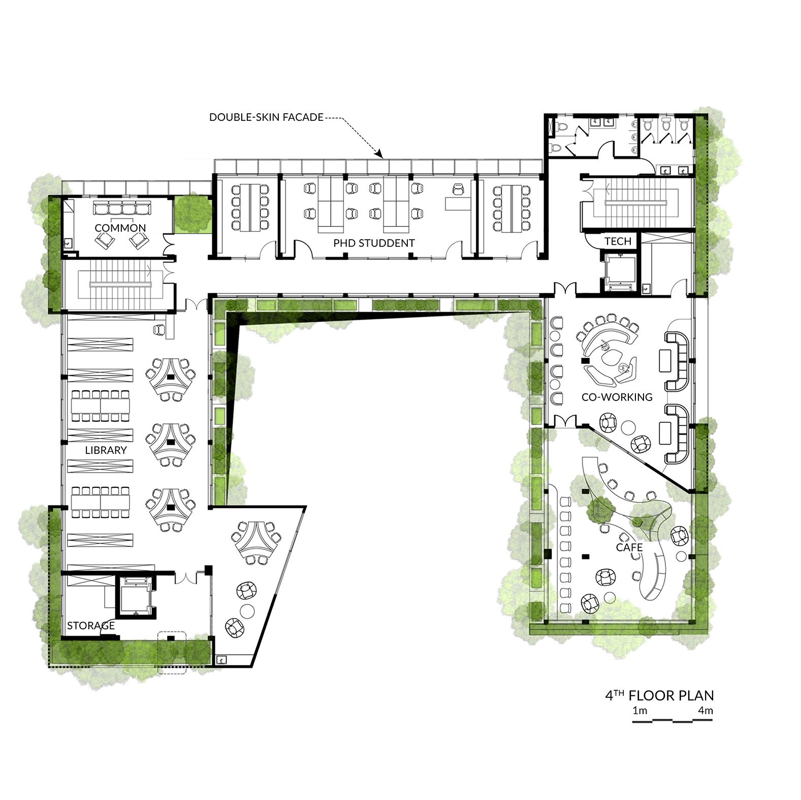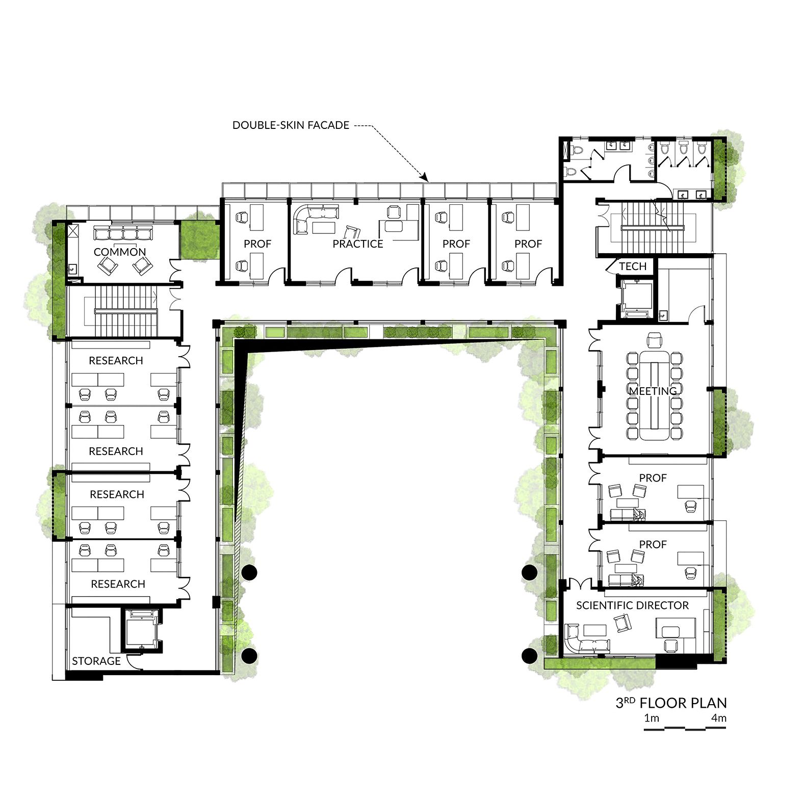 The structure exhibits a harmonious architectural language, skillfully incorporating asymmetrical patterns across all perspectives as a nod to mathematical symbols. While preserving the original U-shape, the design elevates it by introducing a connecting bridge on the top level, forming a more compact block. A seamless flow is established through a corridor linking all functional spaces to an open inner courtyard, maintaining an airy and interconnected ambiance throughout the Vietnam Institute.