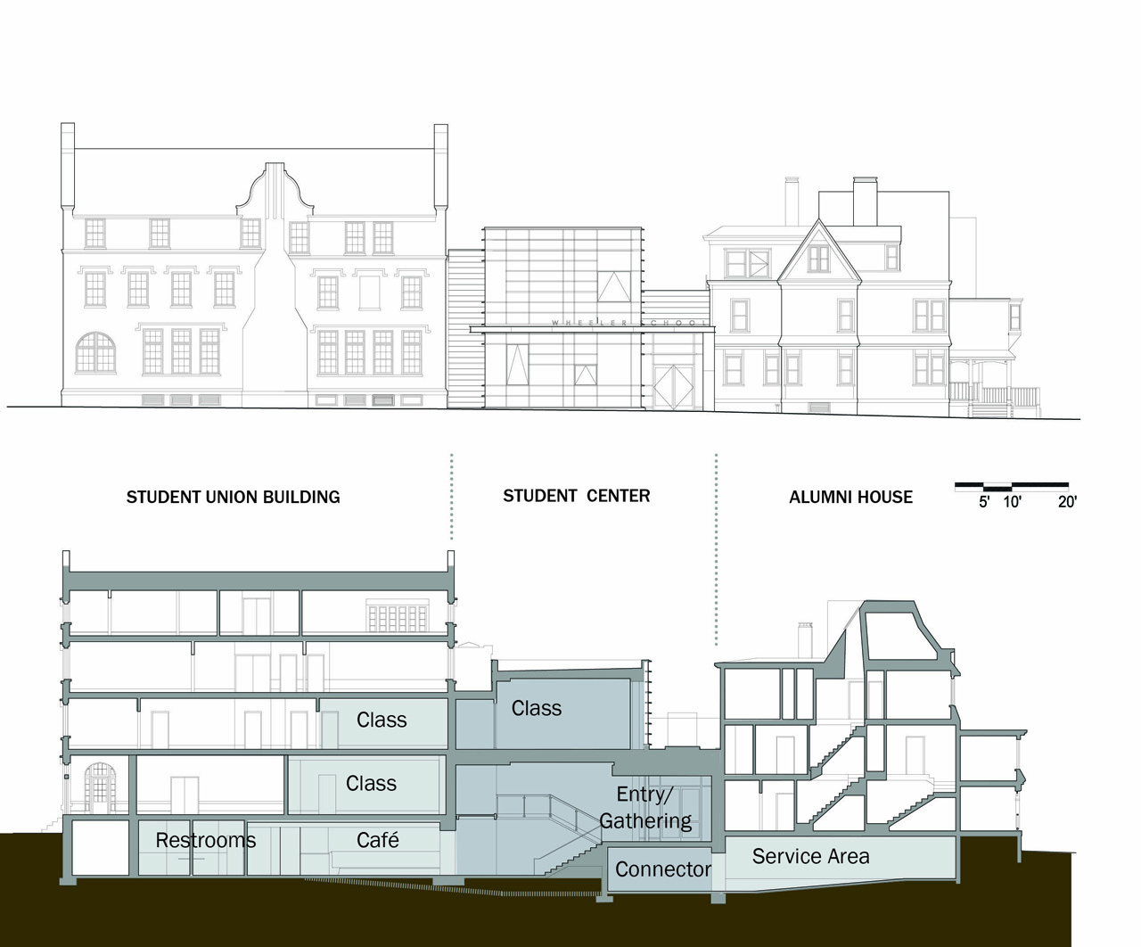 Programs for student centers can be expansive and expensive. With only a 5,000 sqf footprint, this modest connective building has helped make adjacent spaces more useful to the school program. The selected site, a former maintenance, and dumpster area, now strengthen a campus edge and creates a connection to the enlarged campus courtyard. The new building links two historic buildings, the Alumni House and Student Union, and provides the easy passage along a new campus spine.