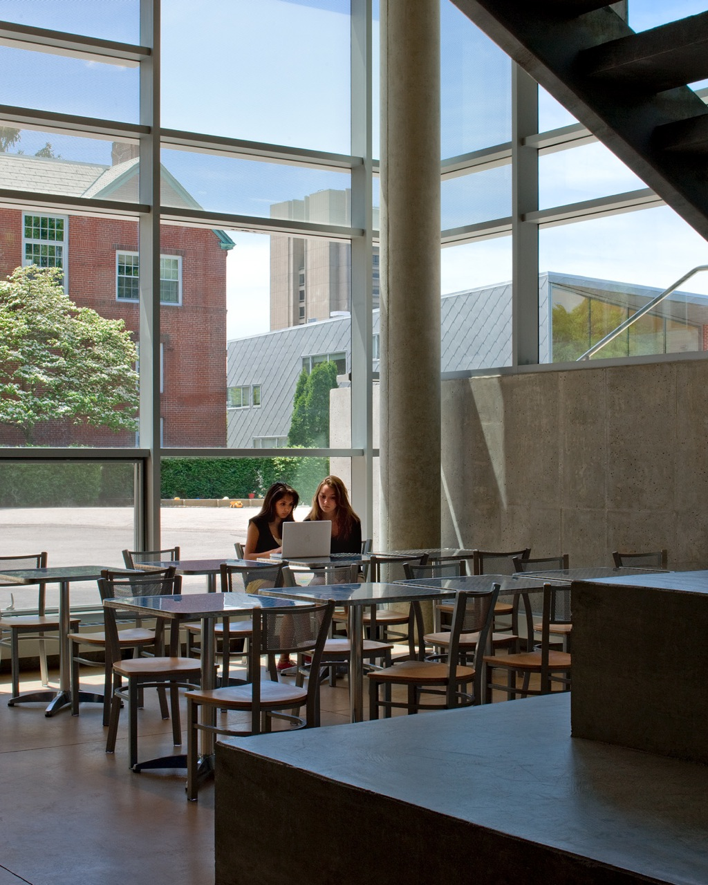 Clad with a distinctive horizontal glass and zinc panel curtain wall system, this building combines visibility and opacity. Its massing relates to the residential scale of the adjacent historic neighborhood and responds to the architectural organization and horizontal datum of its companion buildings. On the interior, the building’s cast-in-place concrete structure is left exposed as a continuous and durable finish for walls and floors. Through this intentionally simple and less “finished” design, students see how the building was put together. A steel stair with glass balustrades connects the levels of three buildings. As part of the landscape and site design, a stepped concrete plinth on the campus side of the new building provides a place for gathering.