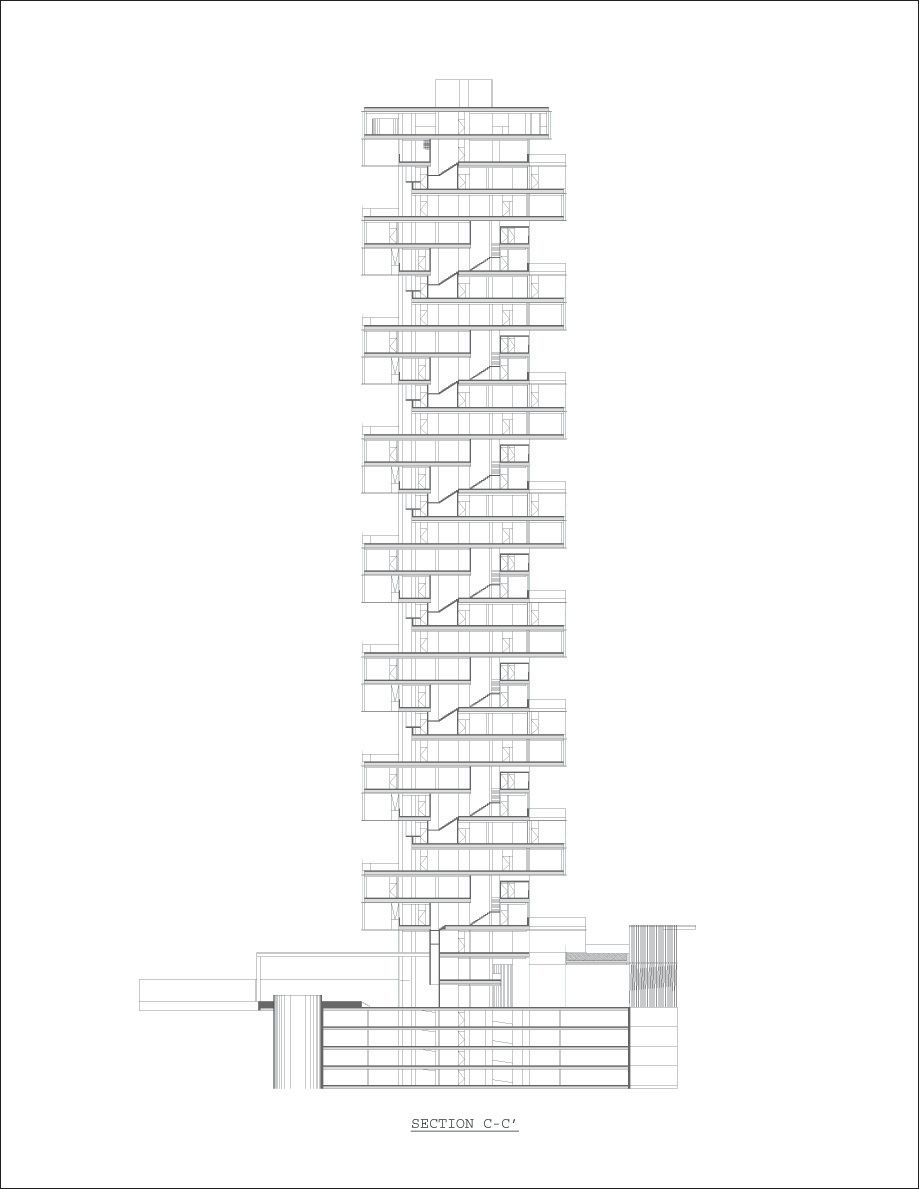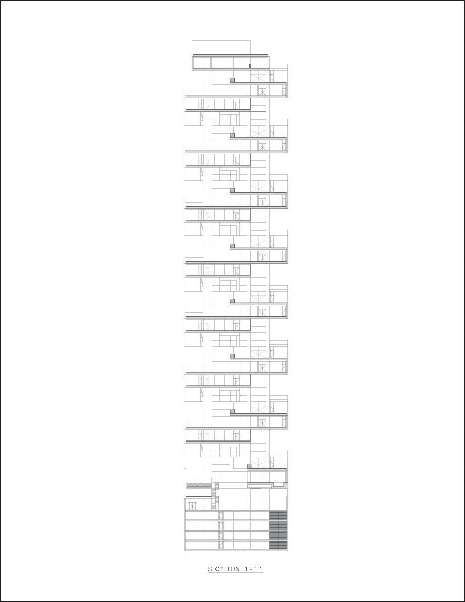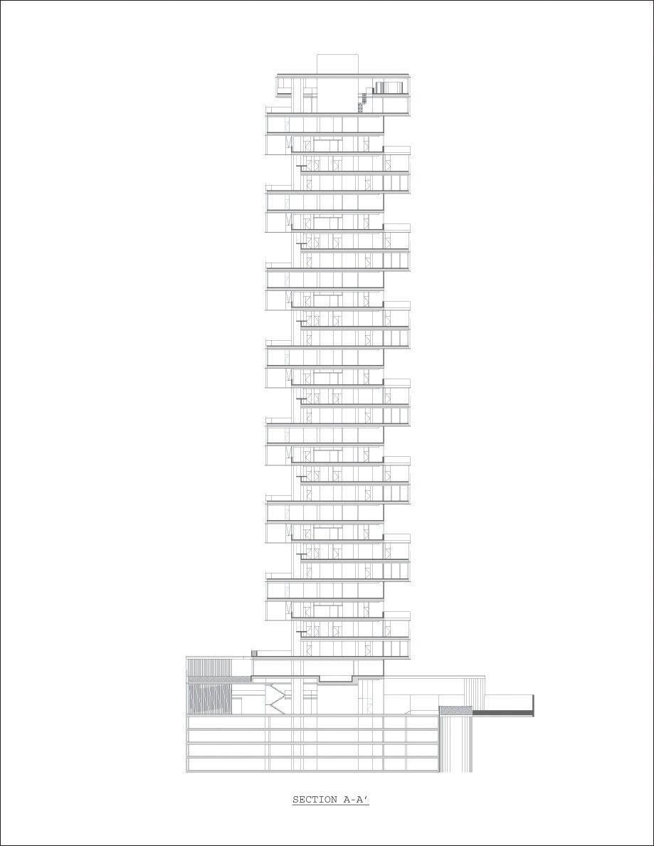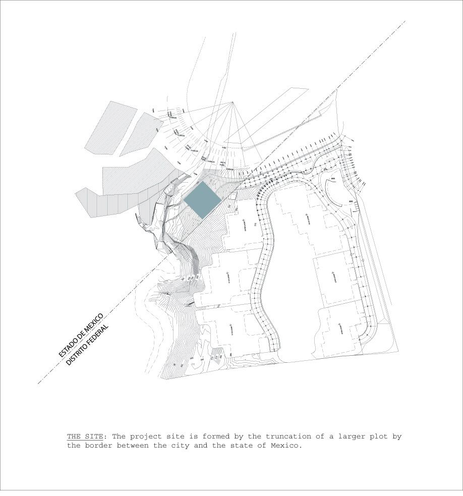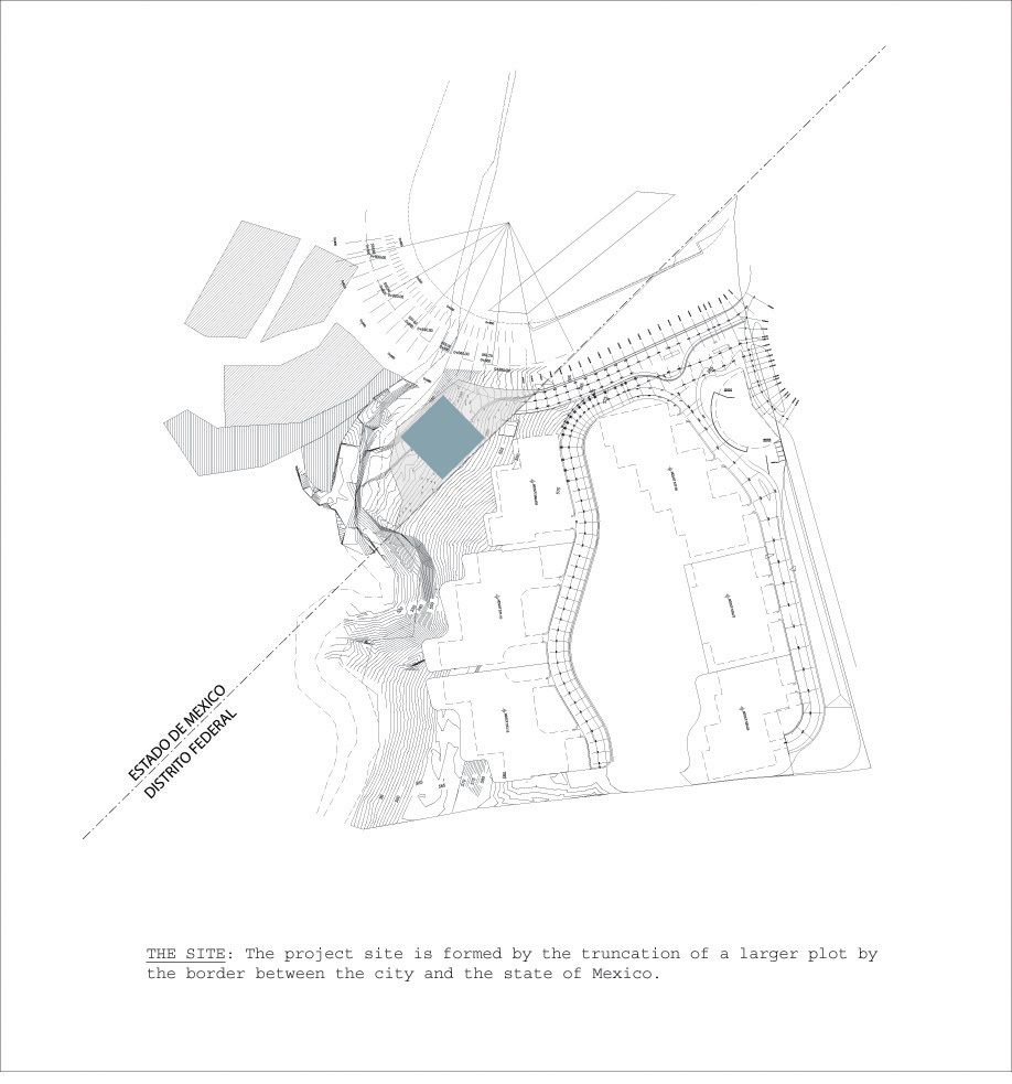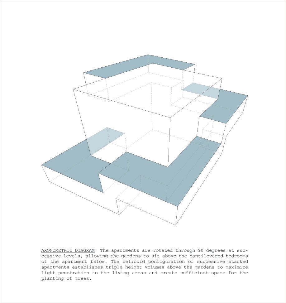 The project brief called for a reimagining of the typology of the residential tower, to emulate the quality of living in a single-family residence in a skyscraper, in a site formed by the truncation of a larger plot by the border between the city and the state of Mexico. The design challenges posed by the inclusion of large landscaped areas and trees at each level framed the requirements of a complex 3 dimensional puzzle which would: enable sufficient height between levels for trees to grow and for the penetration of daylight into the apartments, maintain privacy and minimize overlooking between levels, include gardens without building extra floor-space, and systematize the many conflicting requirements into a proposal consistent with local construction techniques and the development model. The design process may be seen as a search for a simple, coherent architectural description of this puzzle. Each iteration was modulated until a tight final model was discovered with essentially only one apartment plan. A single apartment type occupies each full level. Each apartment is 400 square meters with a gardened extension of approximately 160 square meters. The apartments are rotated through 90 degrees at successive levels, allowing the gardens to sit above the cantilevered bedrooms of the apartment below.
