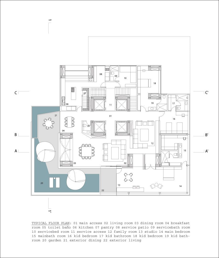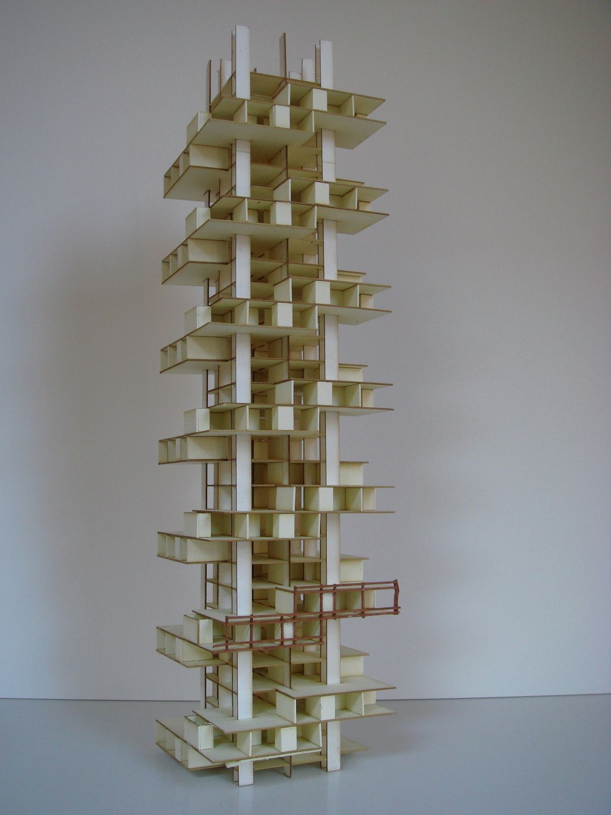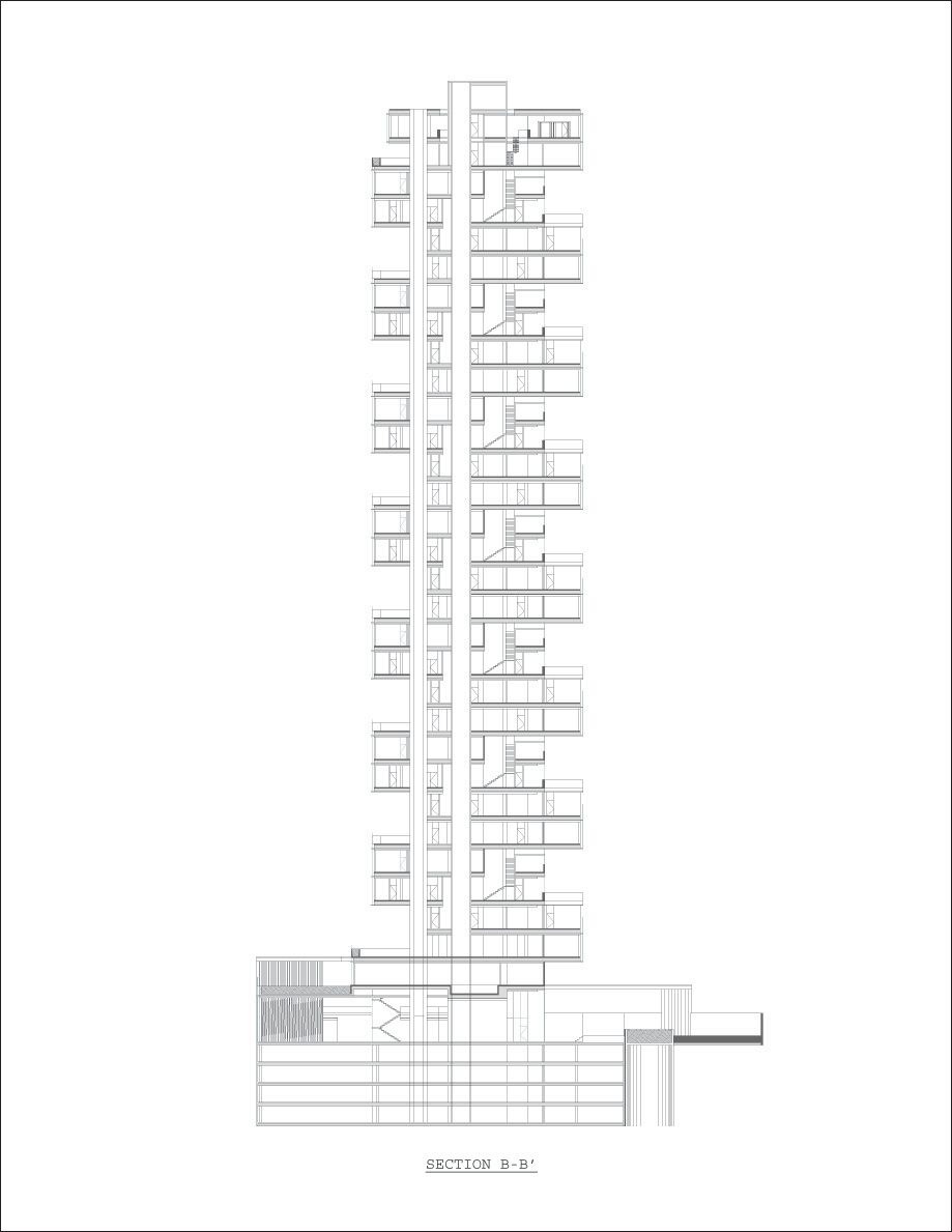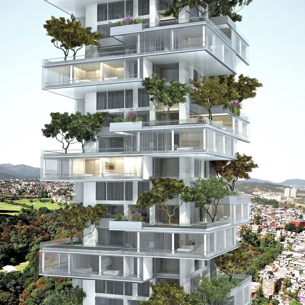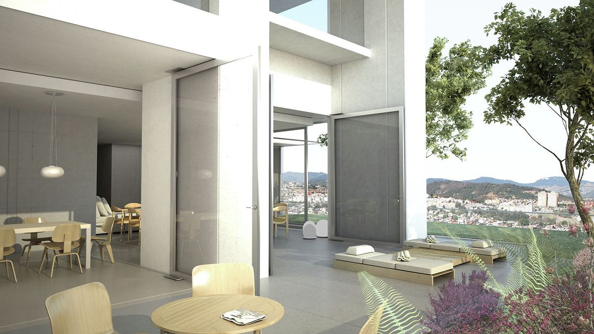 The project brief called for a reimagining of the typology of the residential tower, to emulate the quality of living in a single-family residence in a skyscraper, in a site formed by the truncation of a larger plot by the border between the city and the state of Mexico. The design challenges posed by the inclusion of large landscaped areas and trees at each level framed the requirements of a complex 3 dimensional puzzle which would: enable sufficient height between levels for trees to grow and for the penetration of daylight into the apartments, maintain privacy and minimize overlooking between levels, include gardens without building extra floor-space, and systematize the many conflicting requirements into a proposal consistent with local construction techniques and the development model. The design process may be seen as a search for a simple, coherent architectural description of this puzzle. Each iteration was modulated until a tight final model was discovered with essentially only one apartment plan. A single apartment type occupies each full level. Each apartment is 400 square meters with a gardened extension of approximately 160 square meters. The apartments are rotated through 90 degrees at successive levels, allowing the gardens to sit above the cantilevered bedrooms of the apartment below.