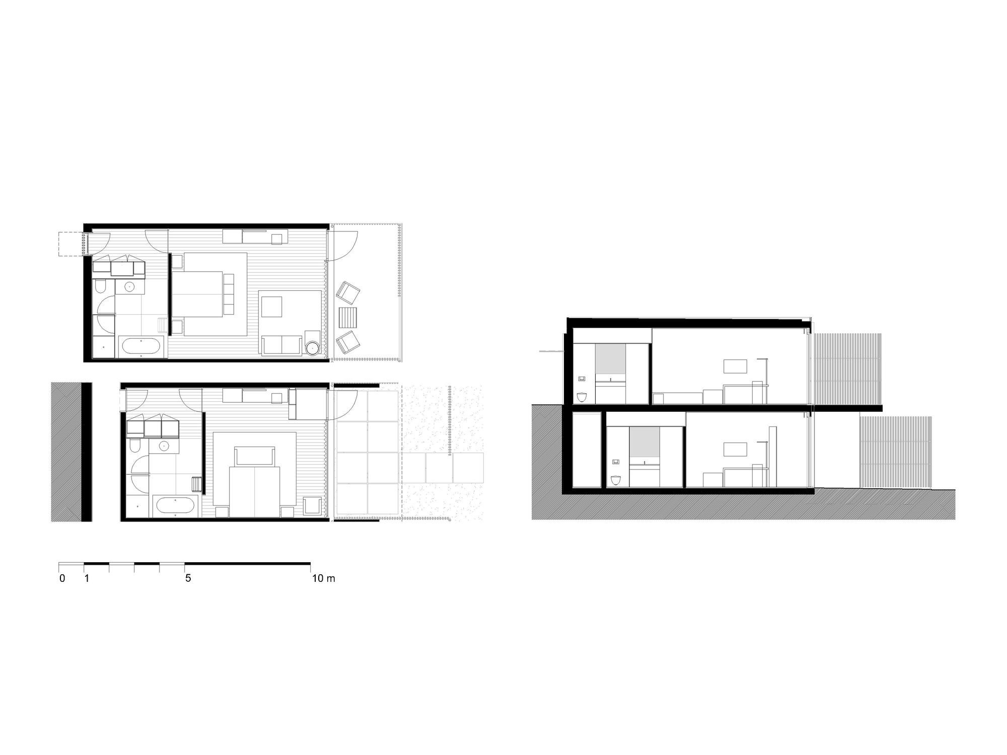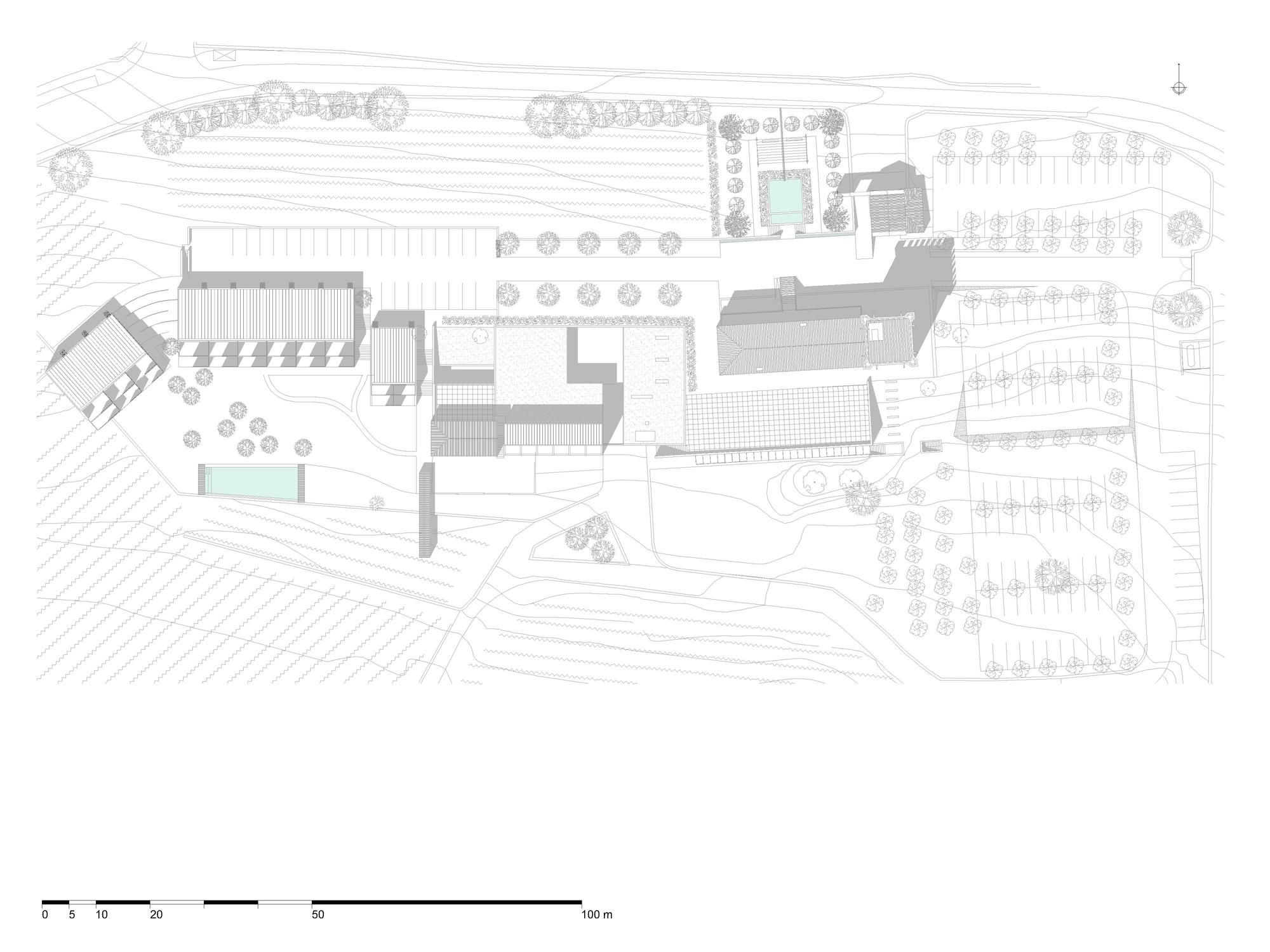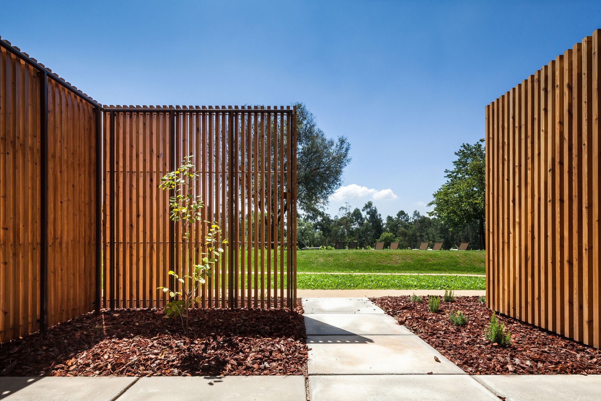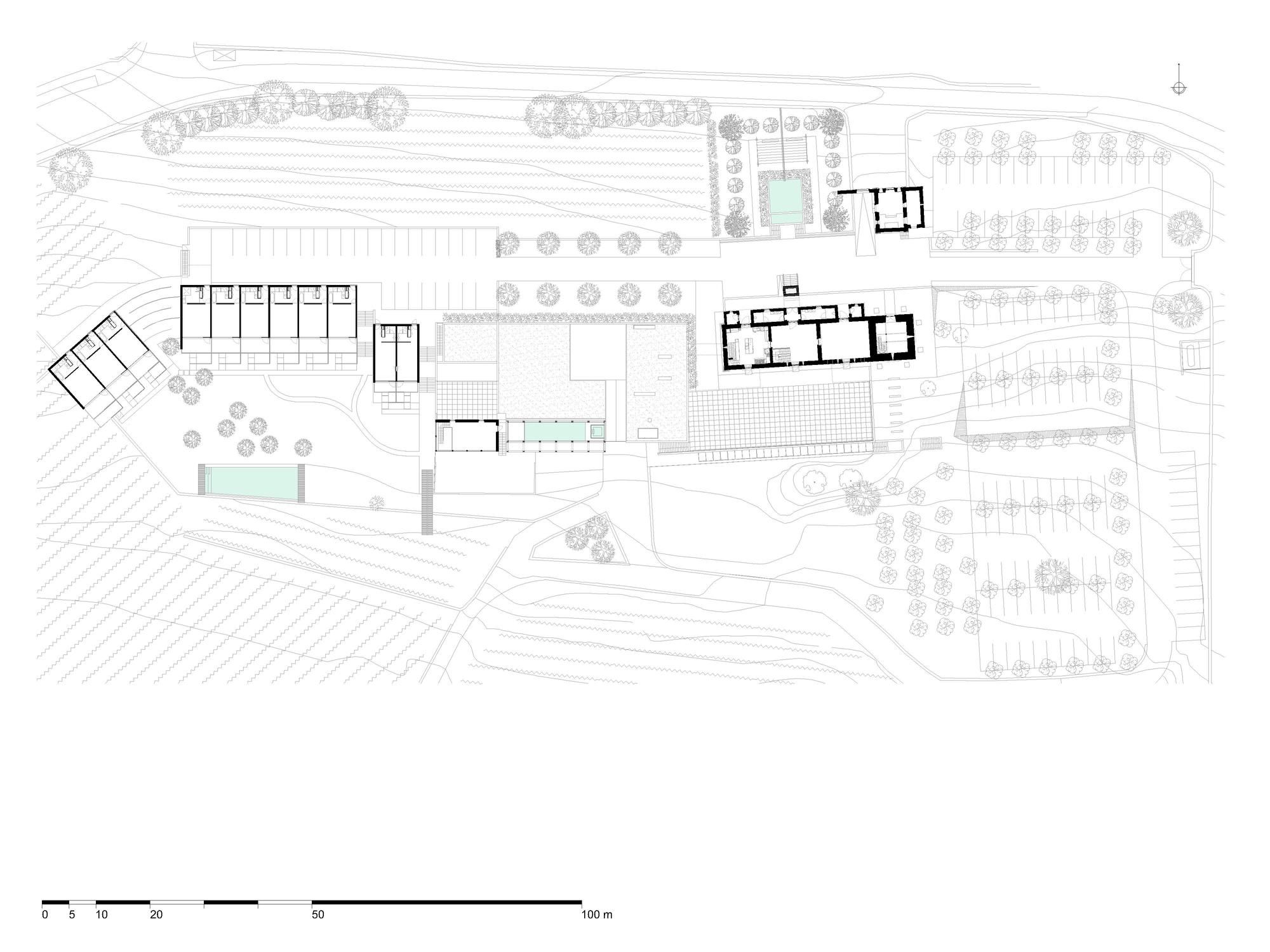 The social areas of the hotel occupied the historical buildings. The location of the new buildings followed the “rules” already existing on the site. The tower maintained its role as the starting point of the entire set. The two existing axes, the first defined by the buildings – East-West – and the other by the paths – North-South – dictated the rules for their intervention. The East-West axis was extended towards the East, till the exterior wall of the estate to create a new entrance, due to the impossibility of widening the existing gate. After the definition of this axis, the new volumes were located facing south, taking advantage of the slope, integrating the new buildings on the terrain and minimizing the impact on the historical buildings.