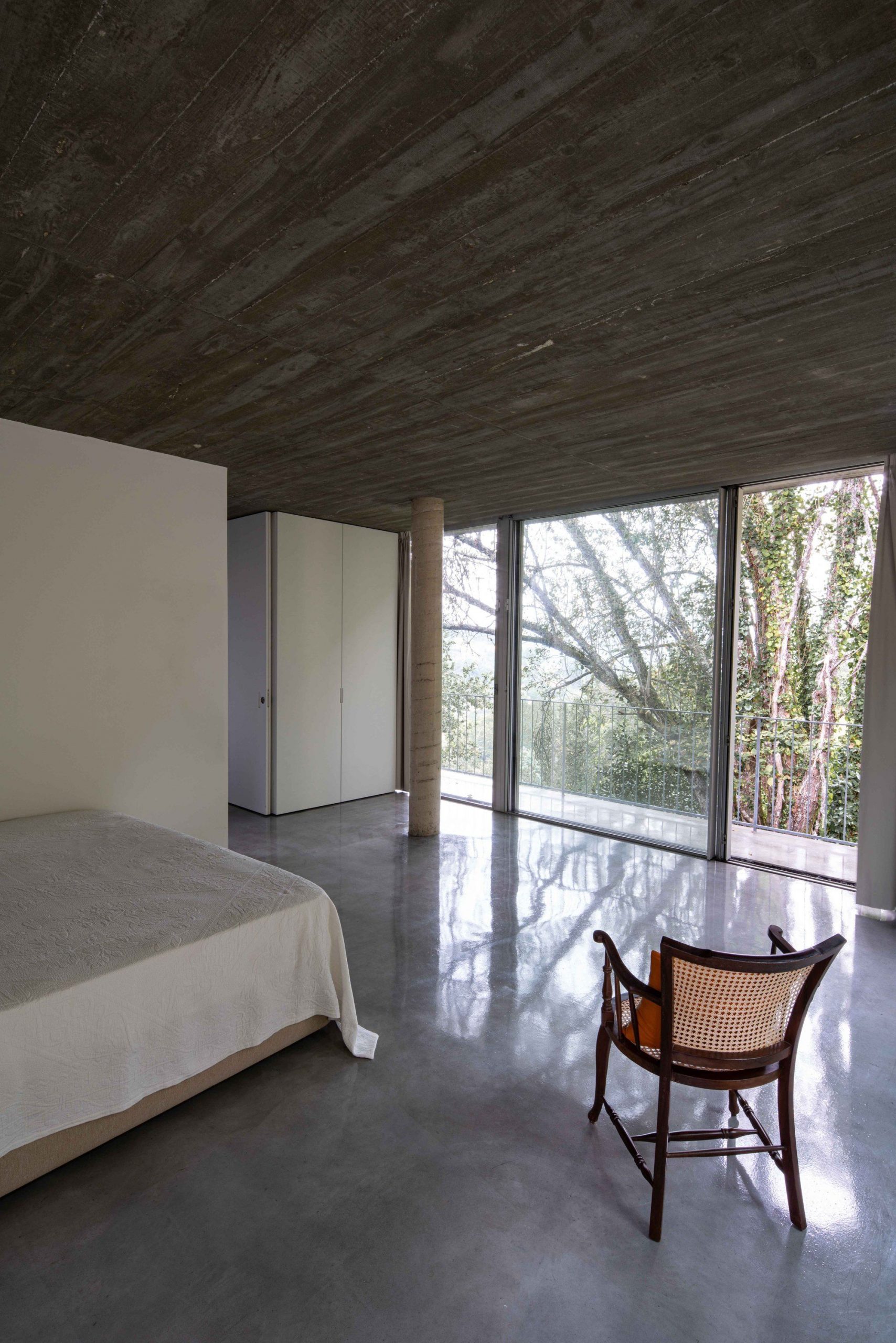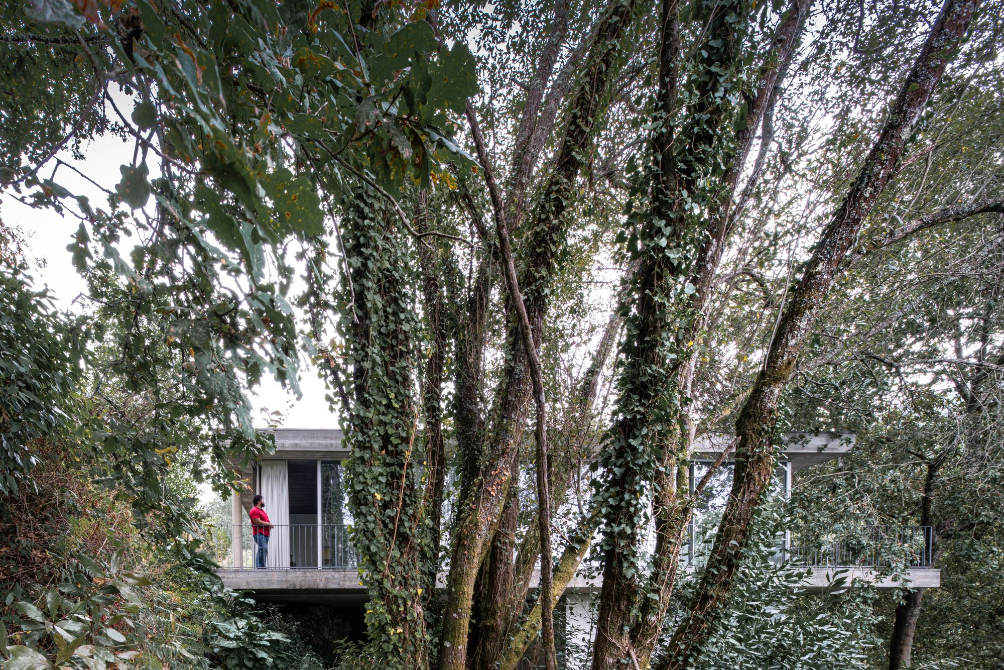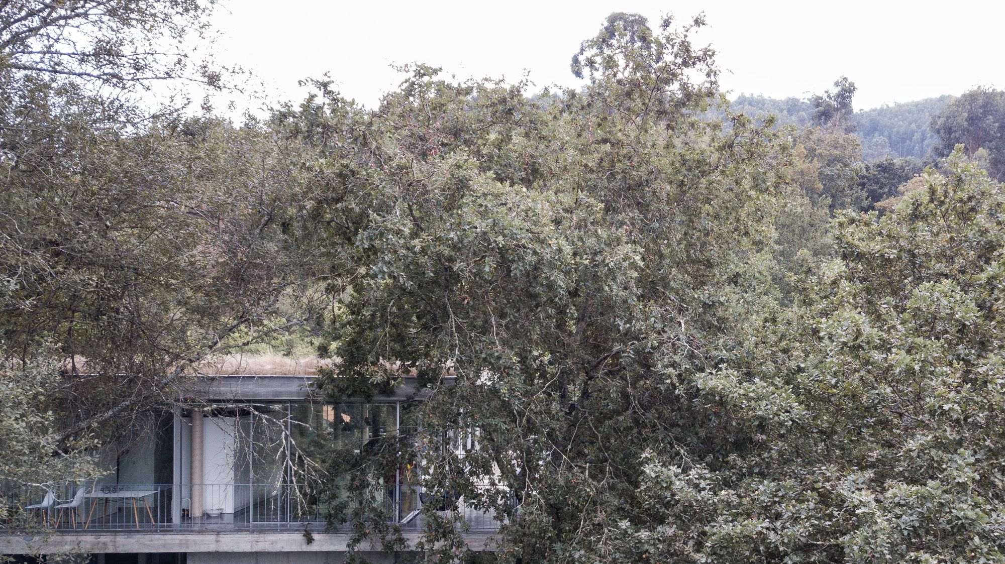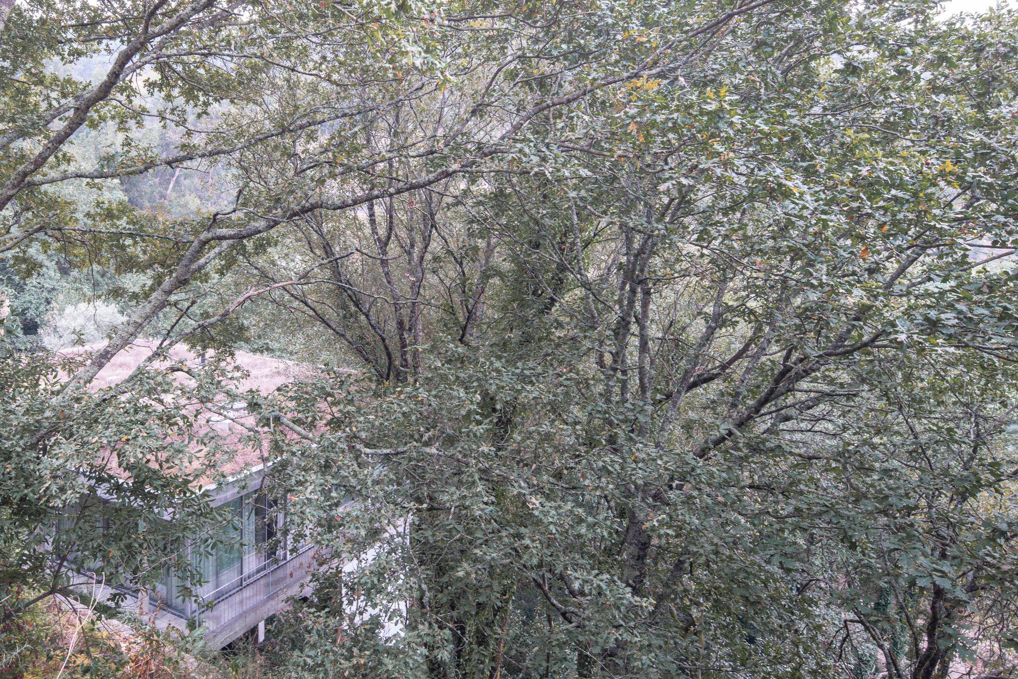 The house is reached from above and placed on a sharp slope, this combination of factors places the eye level of the habitants in line with the top of the tree, in permanent color shift and movement motivated by the wind.