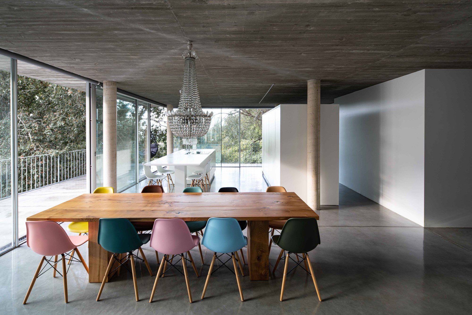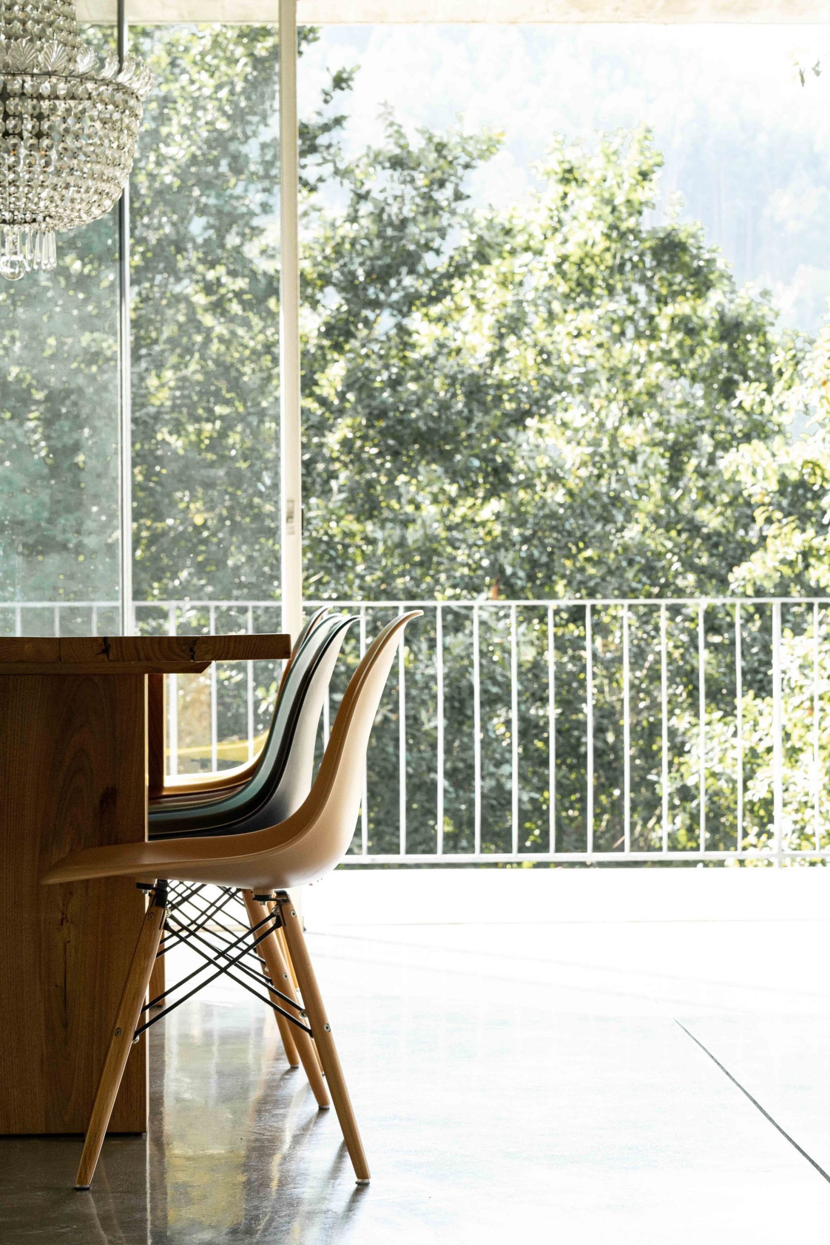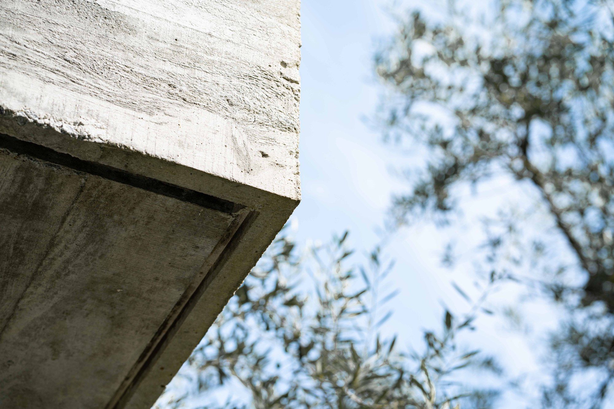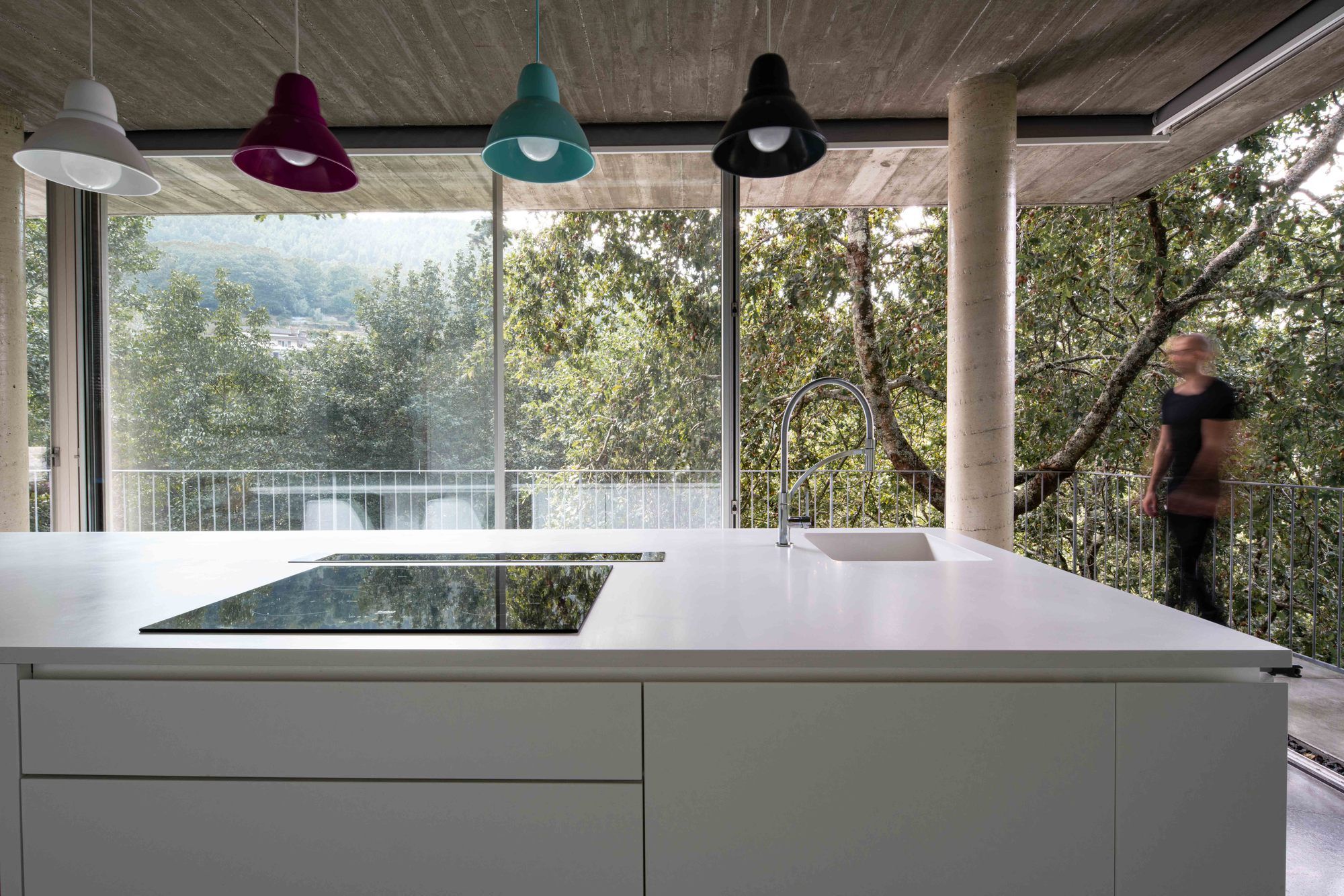 The house is reached from above and placed on a sharp slope, this combination of factors places the eye level of the habitants in line with the top of the tree, in permanent color shift and movement motivated by the wind.