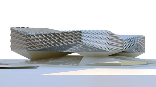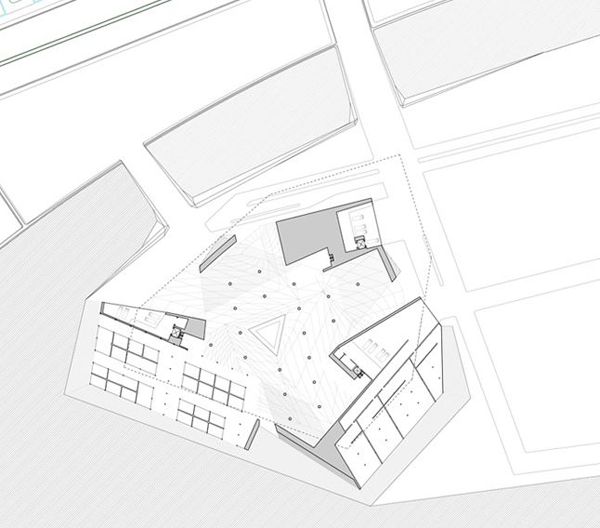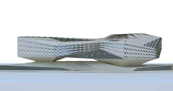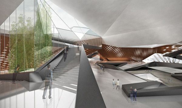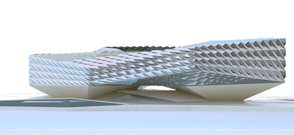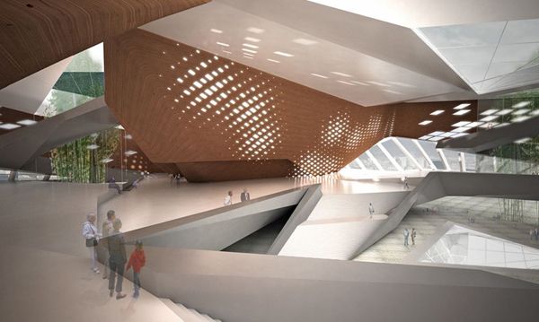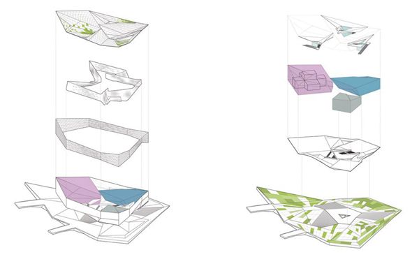 IwamotoScott’s entry for the Busan Opera House design competition titled ‘Trifold Madang’ is recognizable for its triangular voids, and consequently crystalline form. From the architects: ‘Our design research uncovered an interesting spatio-historical aspect of the tradition of opera performance in Korea—that it took place in Madang, or public outdoor courtyard spaces. Our proposal organizes the given tripartite program of the Busan Opera House and its major vertical circulation around three triangular voids.’ The result is triangular shapes of different sizes arranged around a fourth central triangular void that houses the main lobby area. They call this center ‘Public Madang,’ in homage to the tradition of Opera in South Korea that took place outdoors. From IwamotoScott: ‘The building mass is lifted above the surrounding site, supported on three large programmed pedestals the space of the site flows beneath the building and up onto a landscaped podium that culminates in a mound at the Opera House’s center.’