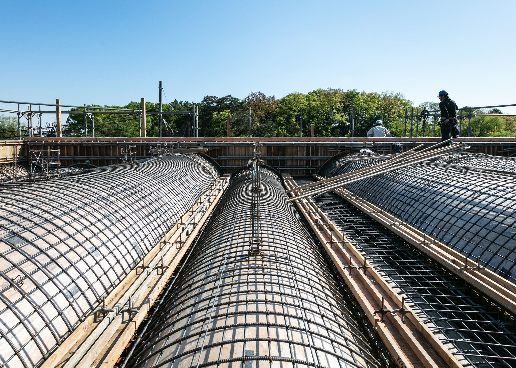An essential condition to design the environment to support other life forms of inhabitance was clear rainwater drainage in the soil. Following the repeated studies of the cross-section where rainwater naturally falls with gravity, a conclusion arrived at introducing continuous vault slabs. Rainwater flows from mountains to valleys of the vault slabs and is carried vertically from valleys through the core. The water flow generated the shape of the building. This approach is similar to the civil engineering design, such as irrigation channels and dams. The civil engineering design requires determined concentration in hold soil and shed rain efficiently within the harsh natural environment.