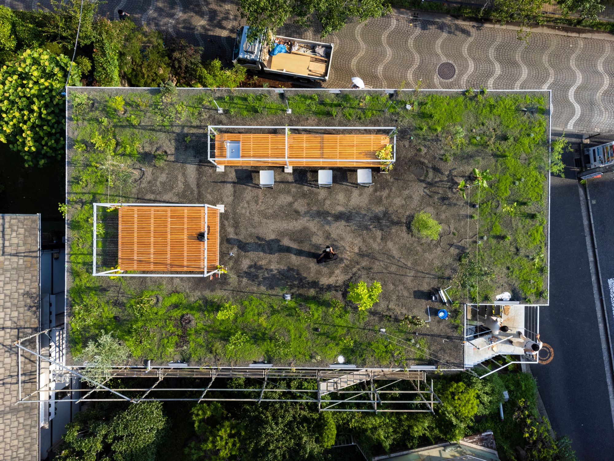 Even then, we faced unpredicted risks of nature and managed to build “infrastructure for the environment” by installing over-flow pipes to cope with a downpour, designing the soil foundation with layer structure by placing high-density compost with water retention at the upper level where the plant roots can reach and positioning low-density compost with clear drainage at the lower level and reducing the weight by limiting soil location at the rooftop and around the border of interiors and exteriors that allow transpiration to soften solar heat.