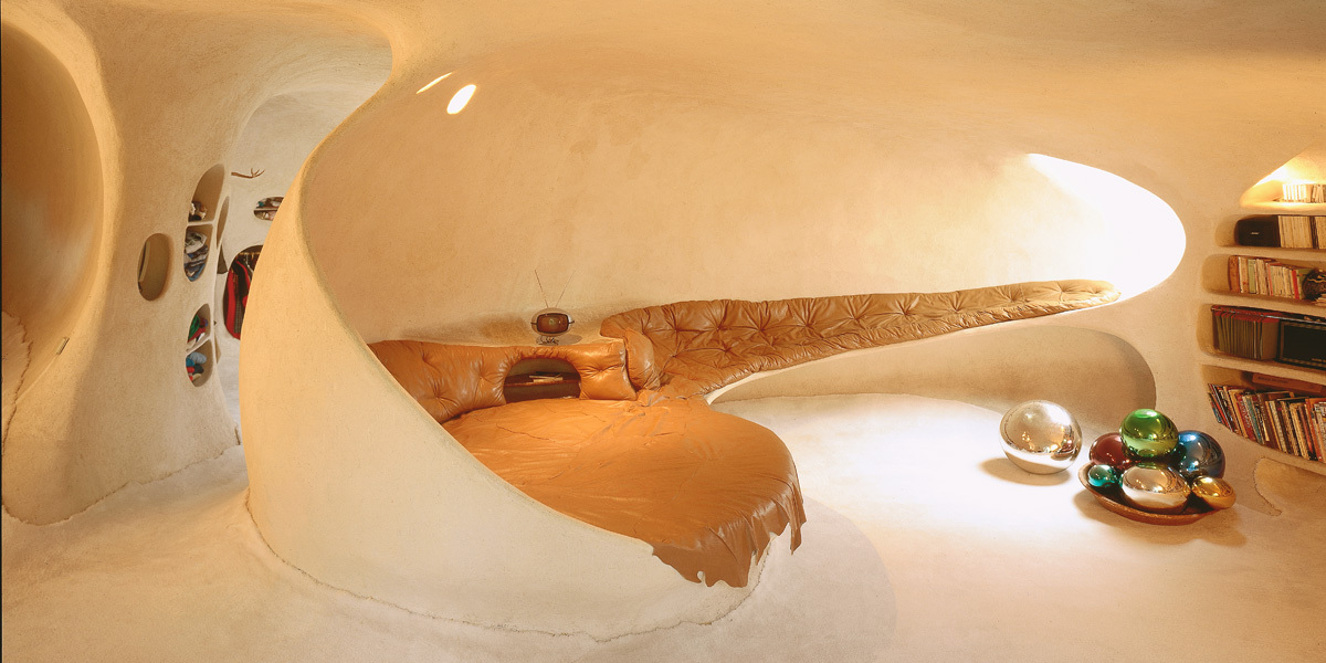 Organic House designed by Javier Senosiain, The original idea of the project took its simile from a peanut shell: two wide oval spaces with lots of light, united by a space in low and narrow gloom. This proposal arose based on the requirements of the elementary functions of man: a space to live together, with room, dining room and kitchen and another to sleep, with dressing room and bathroom. The original concept is defined in two large spaces: one day and one night, looking for the feeling that inside the person will enter the land, that was aware of the uniqueness of this space without losing integration with the exterior green areas.